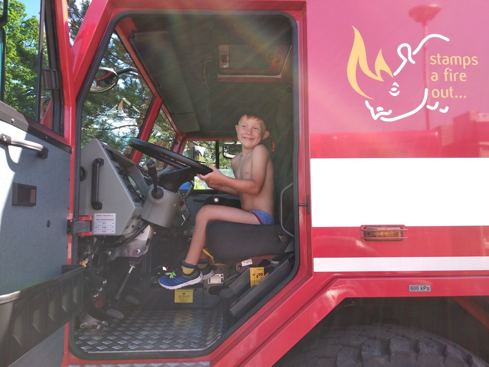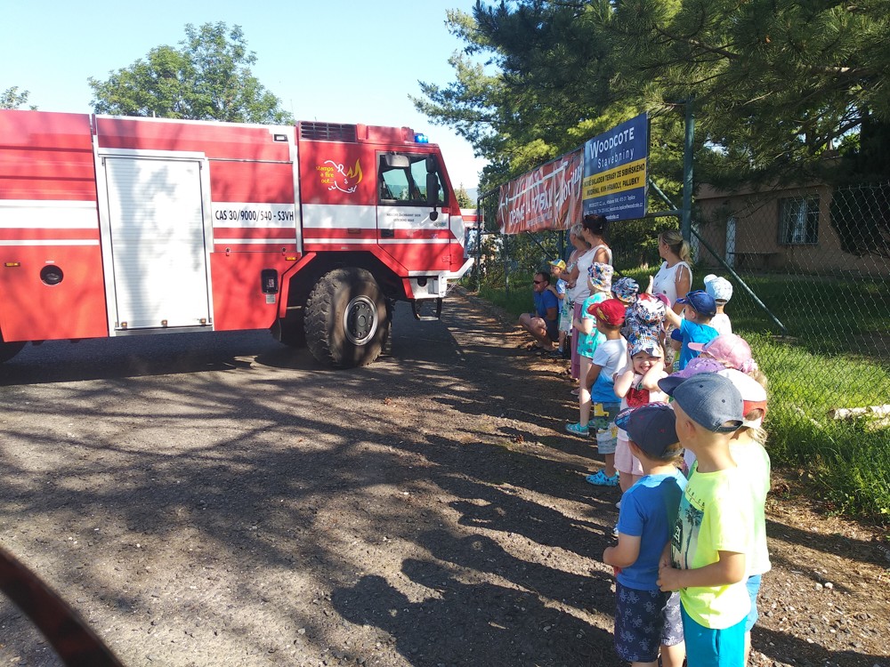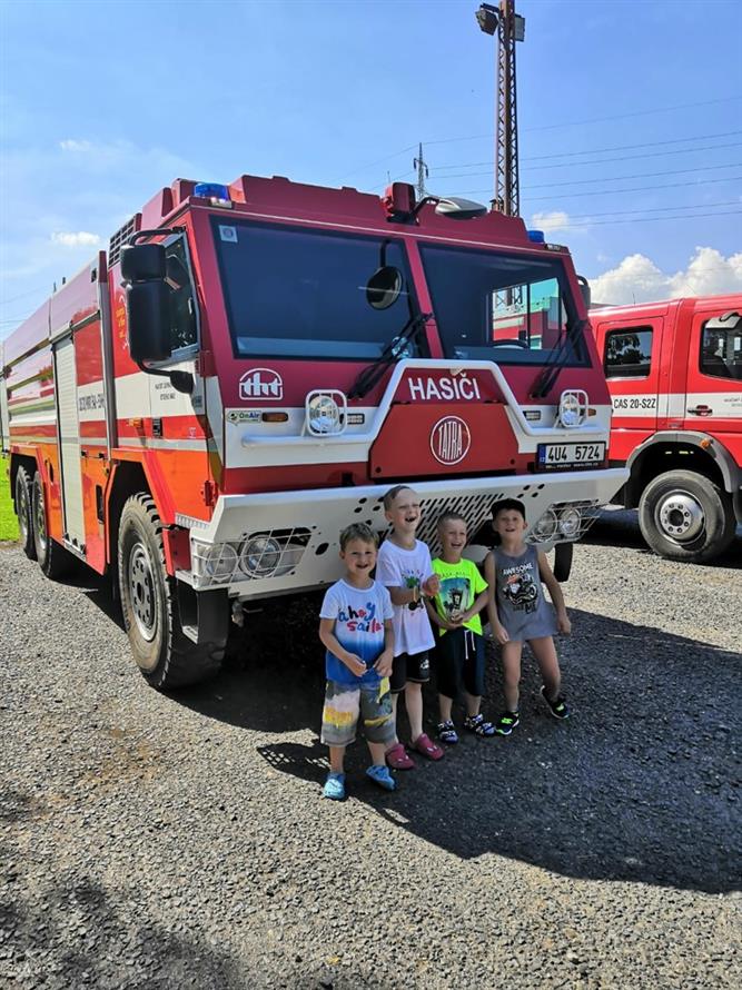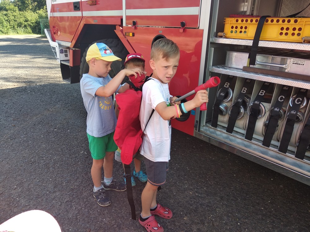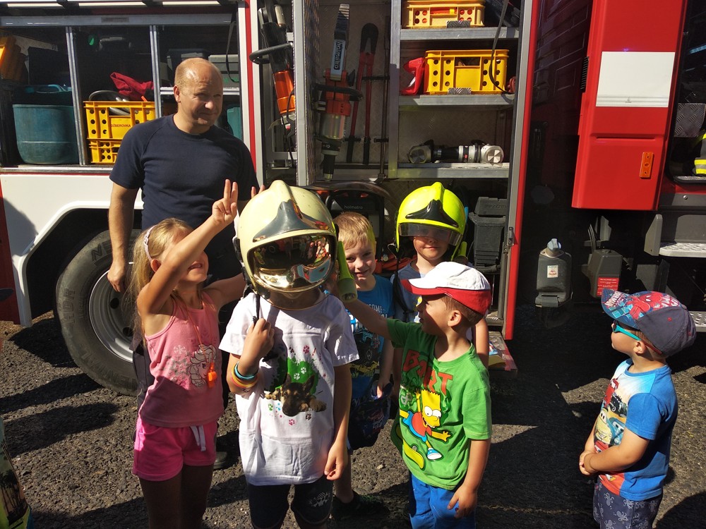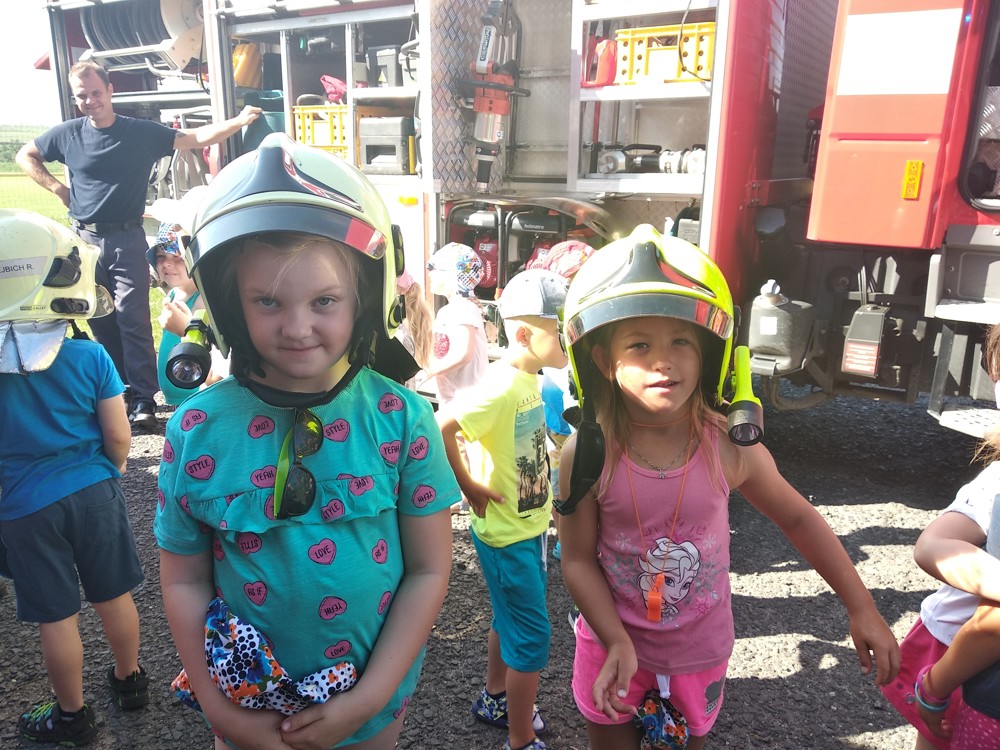 Zjistili jsme také, že hasičská helma nám opravdu sluší, nanuky, které vozí hasiči, jsou skvělým osvěžením a ta sprcha na závěr byla prostě úžasná.