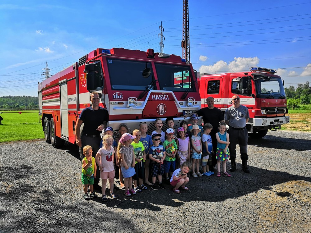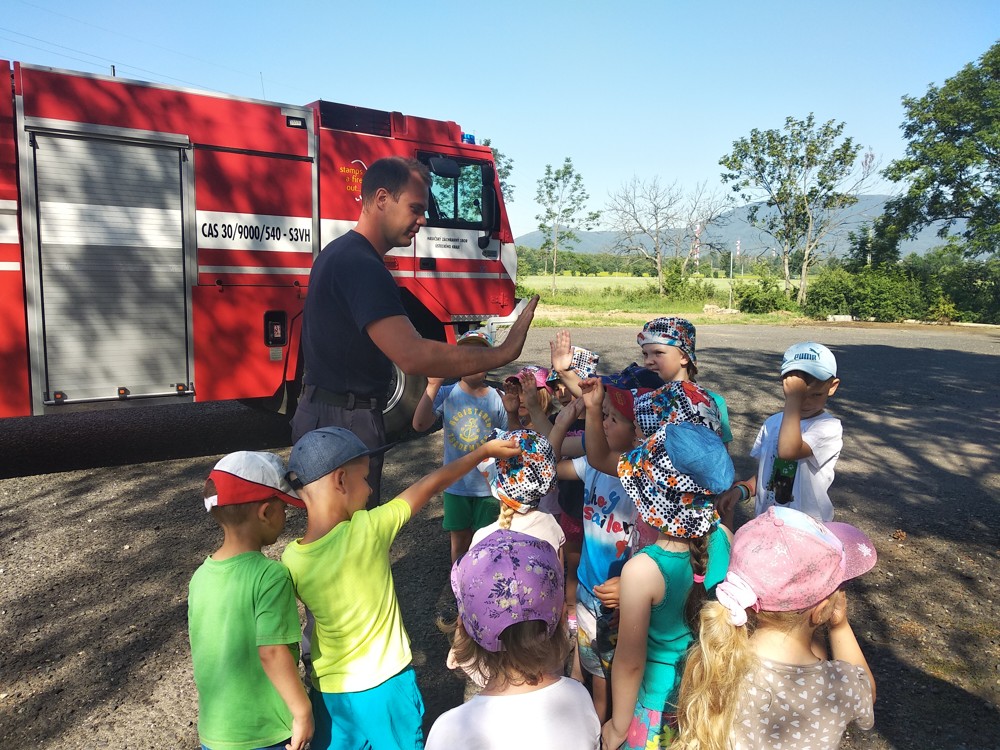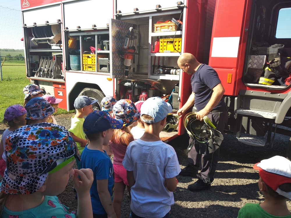 Naši kamarádi hasiči za námi opět přijeli na hřiště, aby nám povídali o své práci, ukázali vybavení svého auta, předvedli, jak se používá některé nářadí a hasí veliký požár.