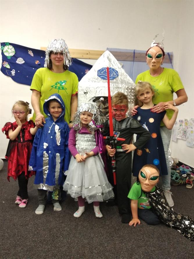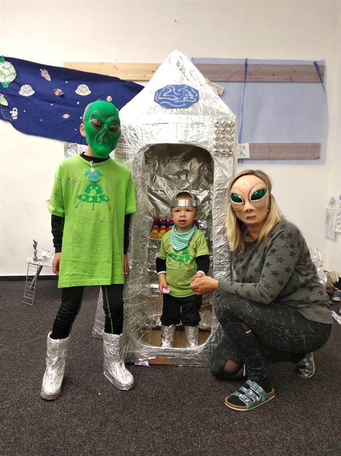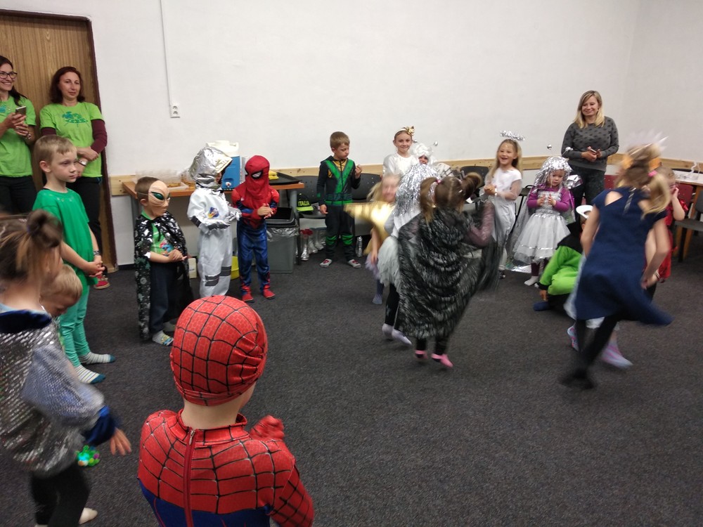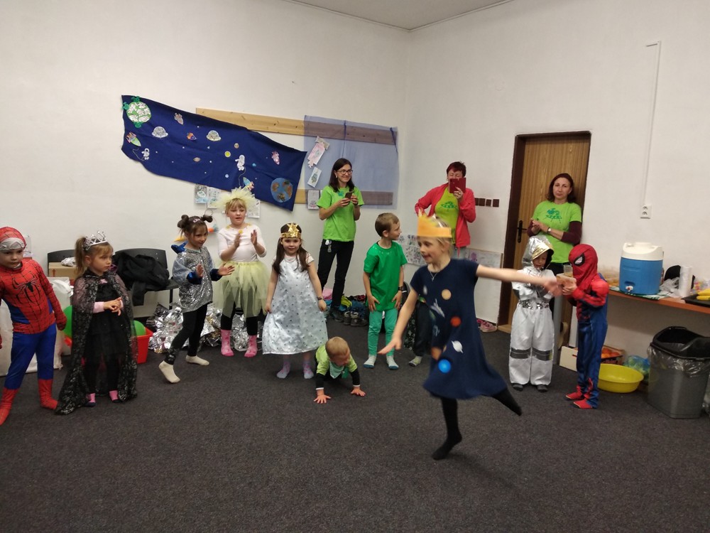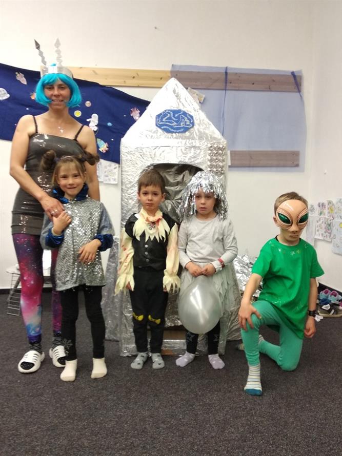 Dnešní den jsme zakončili vesmírným karnevalem. Mimozemšťané, kteří se převtělili do vesmírných masek si tento rej velice užili. Po vysilujícím tanci a soutěžích přiletěla vesmírná pošta a potom už byl čas jít spát.