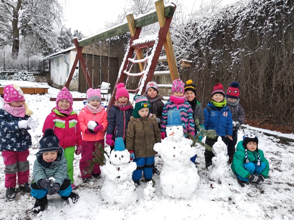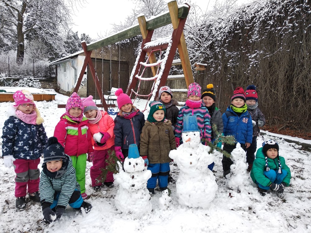 Napadl první sníh, a tak jsme po svačince honem pospíchali na zahrádku, abychom si postavili své první sněhuláky. Musíte uznat, že se nám celkem povedly.