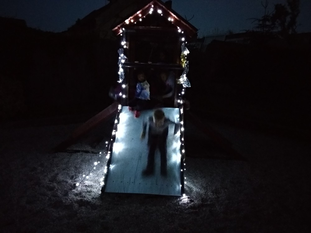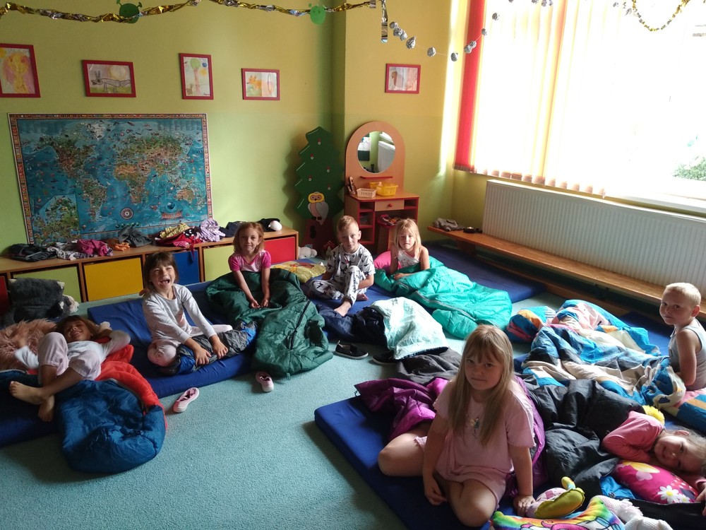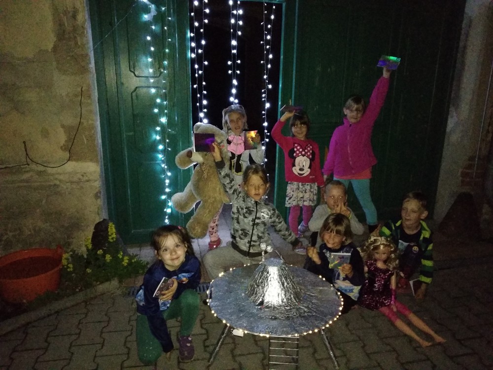 Připravili si své spacáky, ozdobili zmrzlinové poháry, zatančili na diskotéce, připravili druhou večeři a už čekali, až se pořádně setmí, aby se mohli bát na stezce odvahy. Na kouzelné svítící zahrádce je čekalo několik pohádkových planet, které společně navštívili. Poslední planeta byla Ježíškovská, tam na školáky čekal sobík Otík a s ním kouzelné sešítky. Potom si školáci ještě přáli prozkoumat sklep a půdu. Na závěr trochu nezbytné hygieny a honem spát, abychom mohli ráno vyprávět všechny zážitky svým kamarádům. Společně jsme prožili úžasný den a vyslechli hlášku některých z nich.
