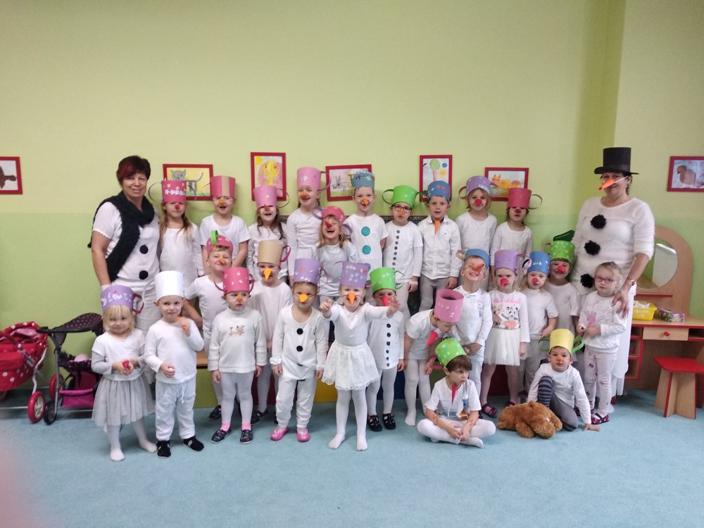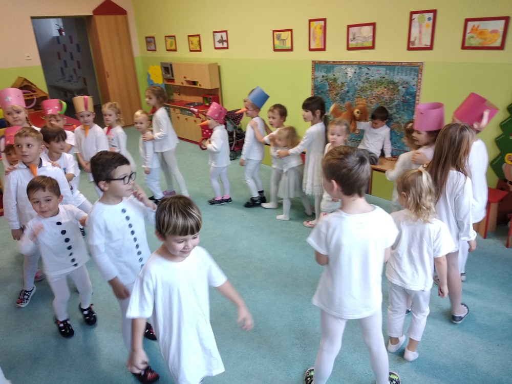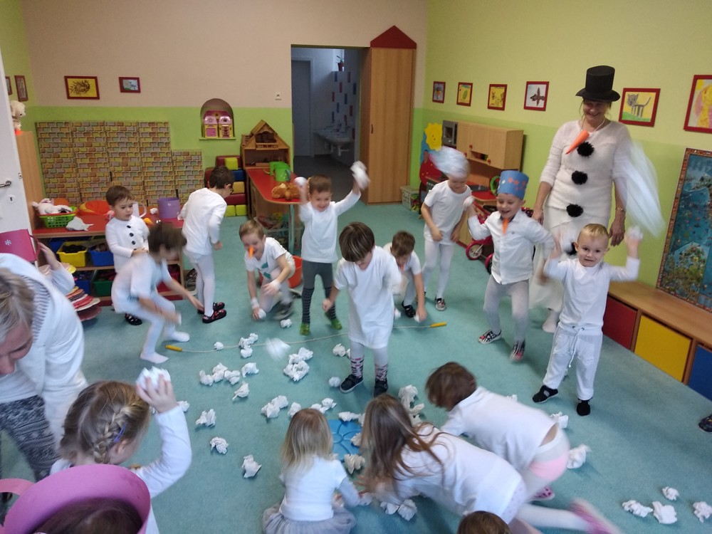 Počasí se dnes umoudřilo, venku začíná padat sníh a ve školce se to hemží malými sněhuláky, které maminky dnes oblékly do bílého.
