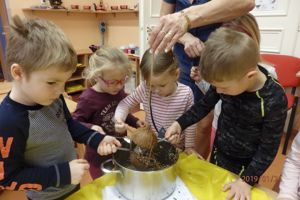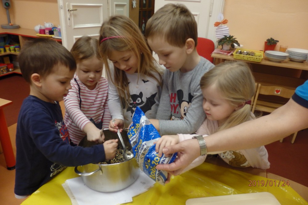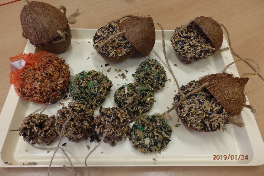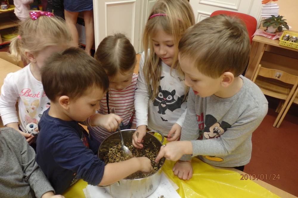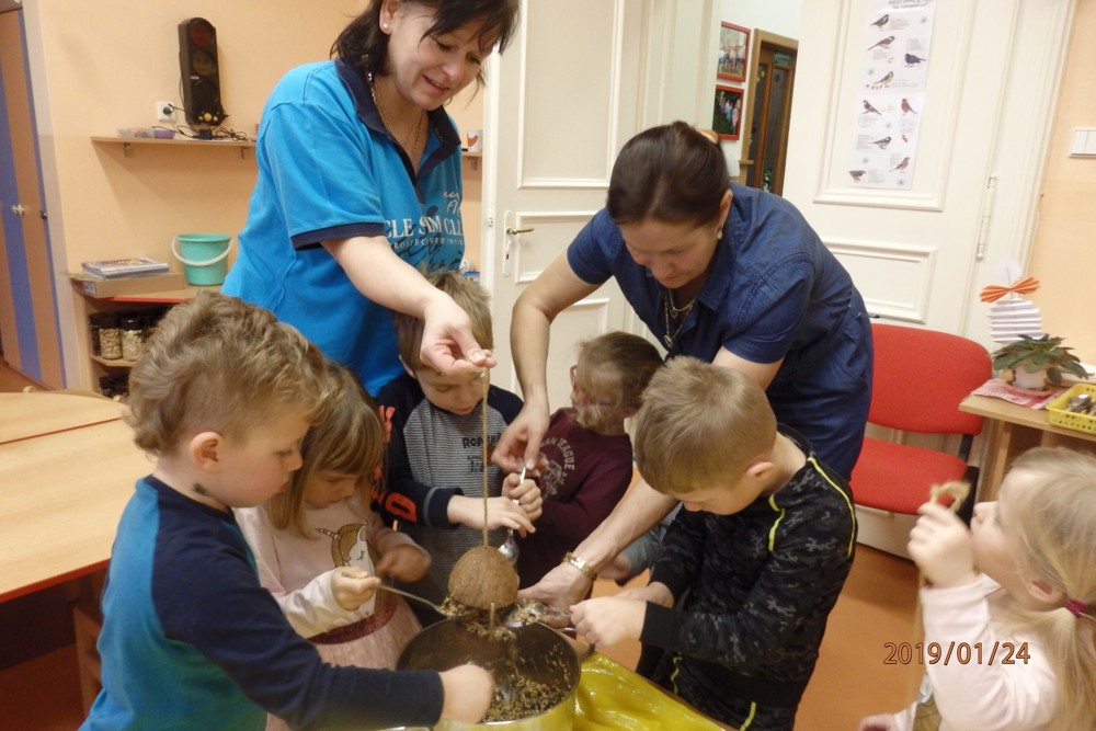 Připravili jsme semínkové koule, tukové šišky a naplnili směsí i krmítka z kokosových ořechů. Ptáčci brzy dobroty na stromě našli a my je můžeme z oken školky pozorovat a sledovat, jak si pochutnávají. Už poznáme sýkorku, vrabečka i kosa. Ty, které neznáme, si najdeme v encyklopedii. Nezapomínáme ani na ptáčky na školní zahradě, kterým sypeme do krmítka slunečnicová semínka a nastrouhané oříšky.