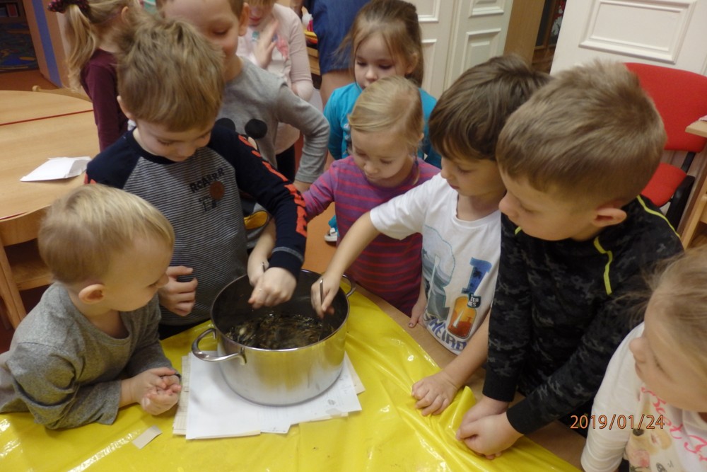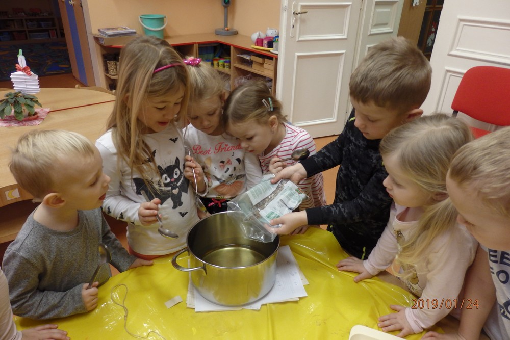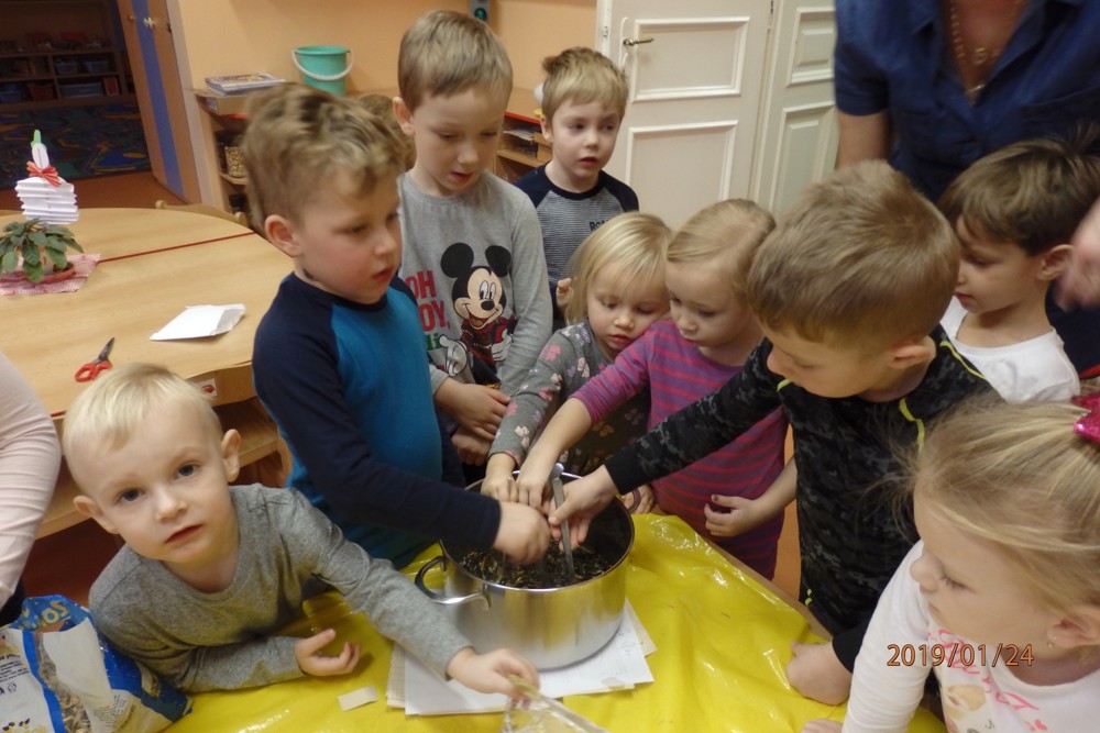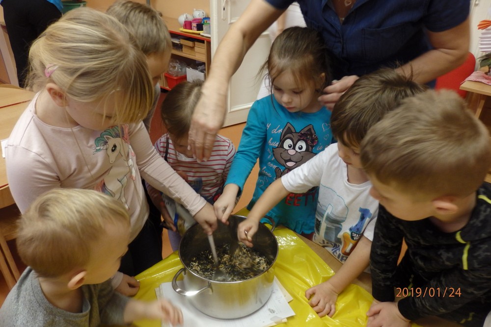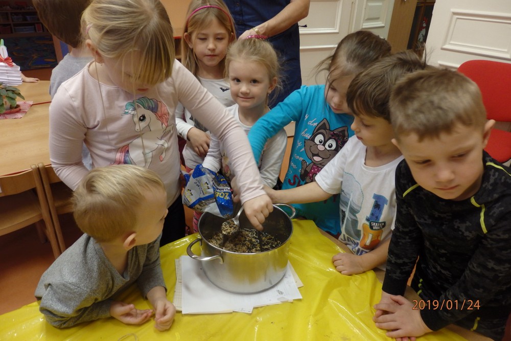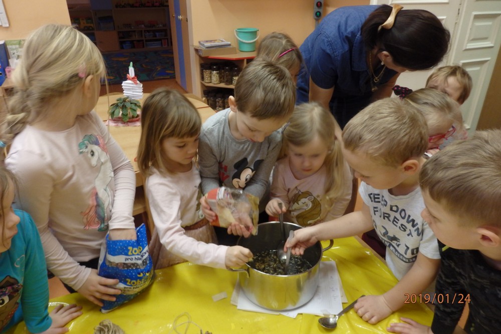 Připravili jsme semínkové koule, tukové šišky a naplnili směsí i krmítka z kokosových ořechů. Ptáčci brzy dobroty na stromě našli a my je můžeme z oken školky pozorovat a sledovat, jak si pochutnávají. Už poznáme sýkorku, vrabečka i kosa. Ty, které neznáme, si najdeme v encyklopedii. Nezapomínáme ani na ptáčky na školní zahradě, kterým sypeme do krmítka slunečnicová semínka a nastrouhané oříšky.