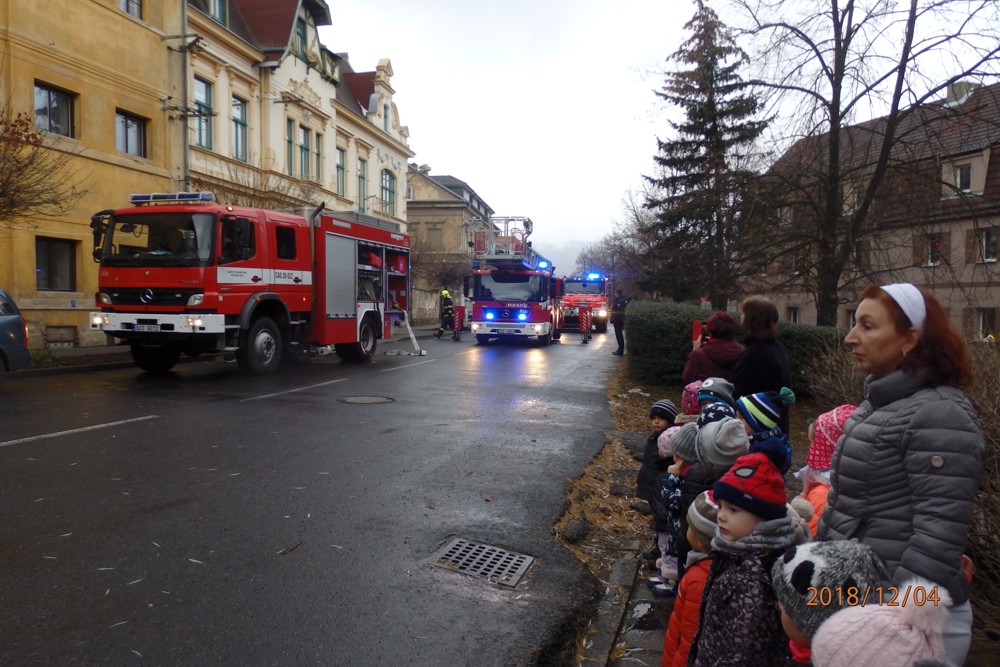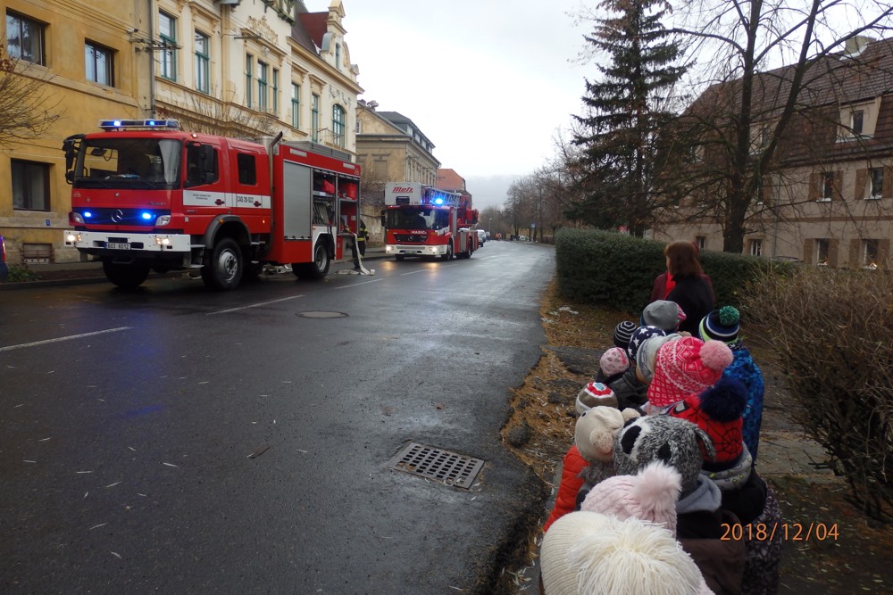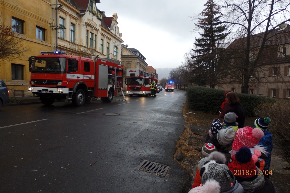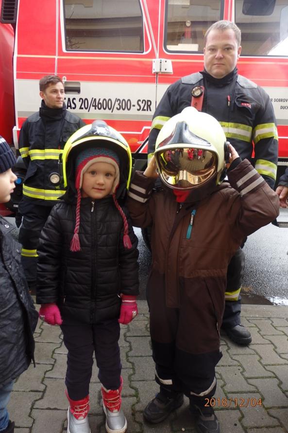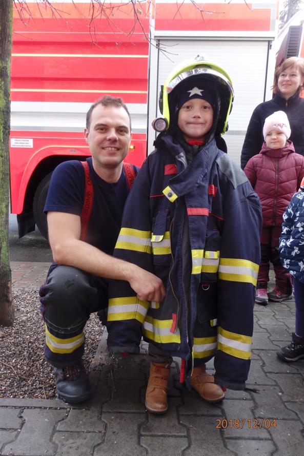 Všechno ostatní ale bylo úplně doopravdy. Děti se musely co nejrychleji obléct a odejít ze školky. Zvládly to na jedničku. "UŽ slyšíme sirény a vidíme první hasičská auta, která na nás blikaji modrými světly. Naši hrdinové hasiči jsou tady". Děti sledovaly s jakou rychlostí hasiči vyskákali z aut a začali zasahovat. Za chvíli měli oheň pod kontrolou. Na hasičích bylo vidět, že jsou opravdoví "profíci" a své práci rozumí. I když jsou to pořádní chlapi, dokáží si povídat i s malými dětmí o své práci. Nakonec se děti se svými hrdiny vyfotily, mohly si vyzkoušet hasičskou výstroj a už byl čas se rozloučit.