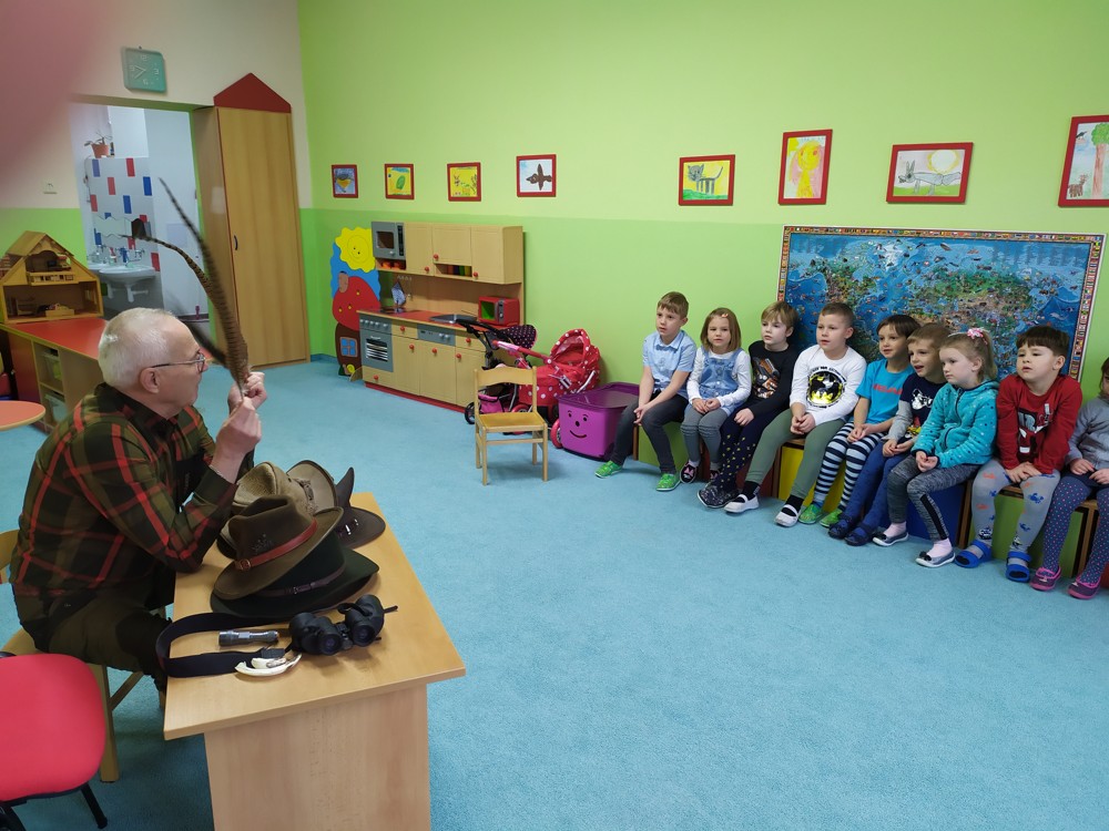 Do školky za námi přišel pan myslivec, aby povídal dětem o lese, své práci, lesních zvířatech a péči o ně.