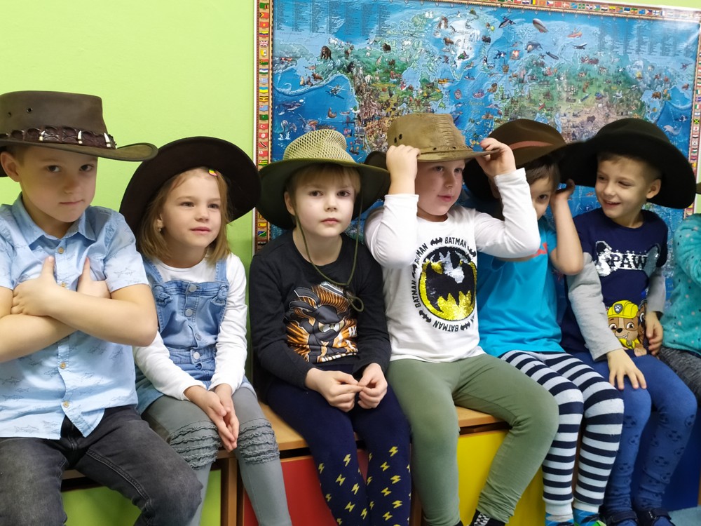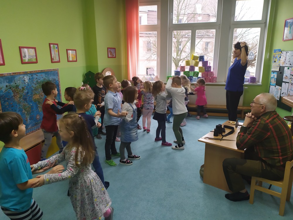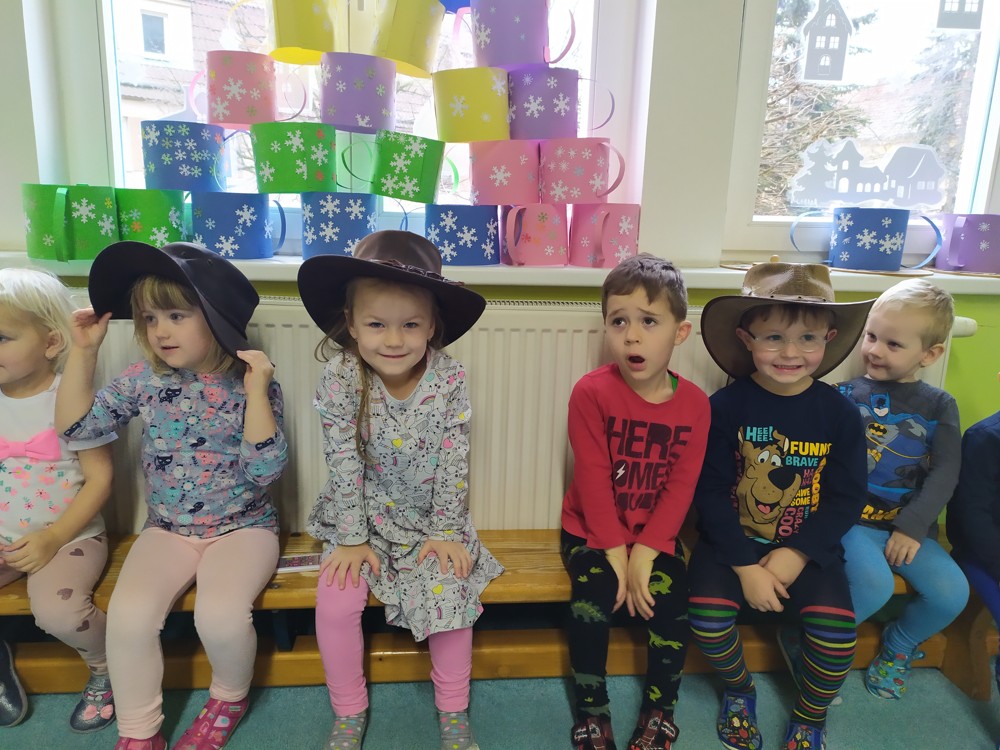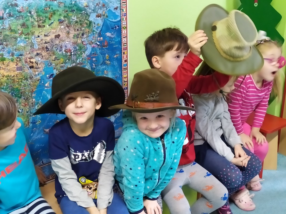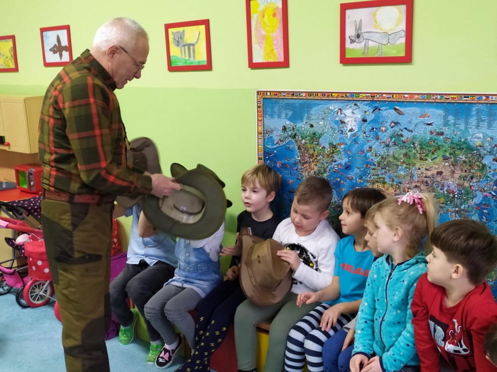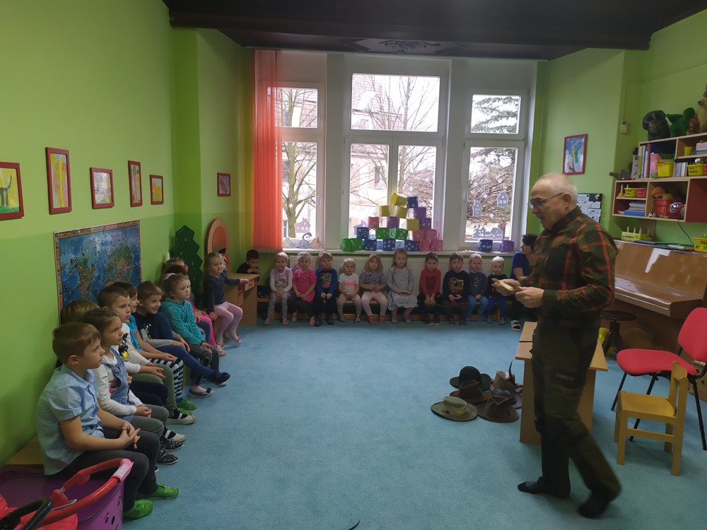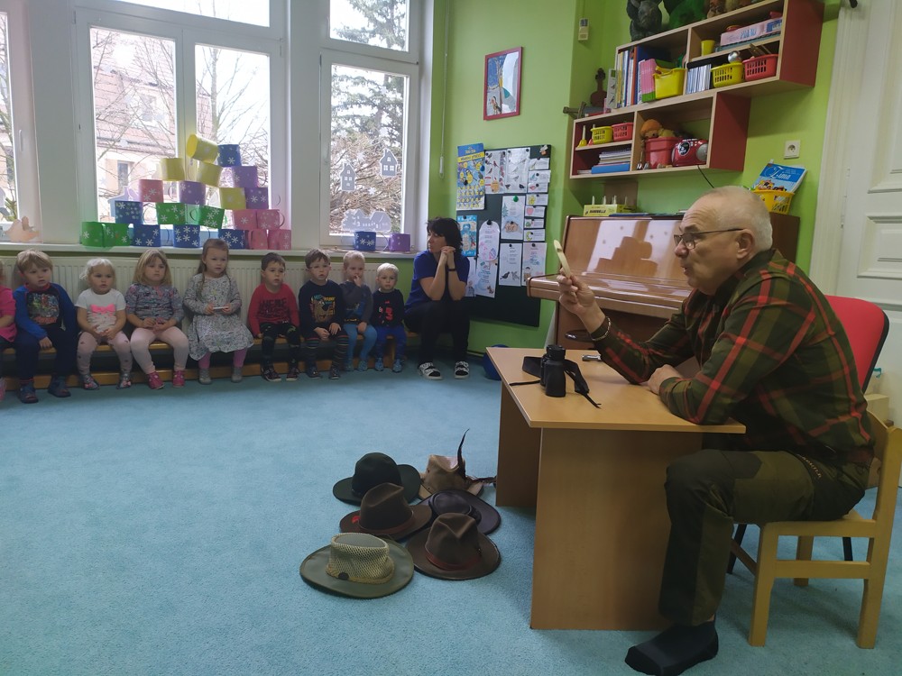 Přinesl s sebou několik klobouků, které si mohly děti vyzkoušet a také si prohlédly bažantí péra, zuby z divočáka, dalekohled a jiné pomůcky, které potřebuje myslivec ke své práci. Za krásné povídání děti panu myslivci zazpívaly písně o lese a také zatančily.