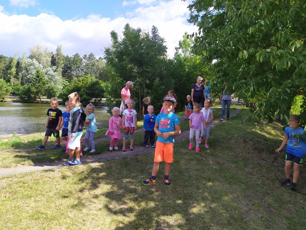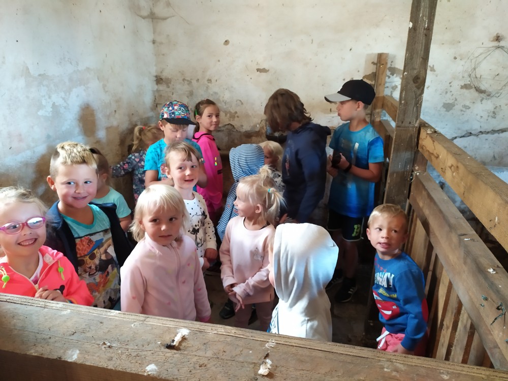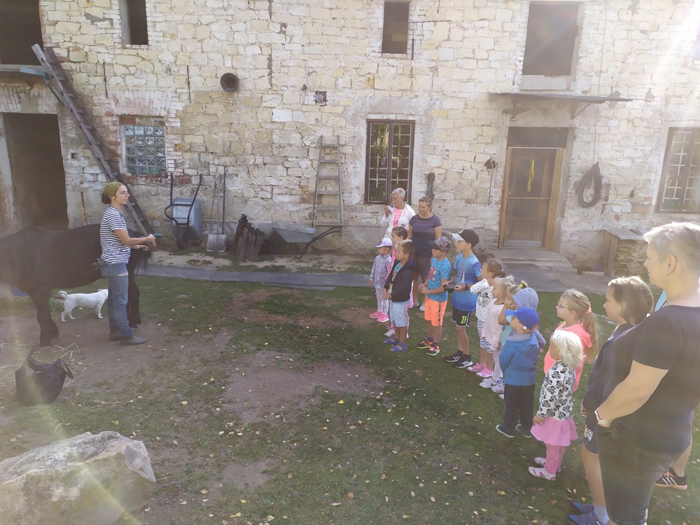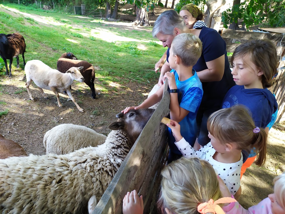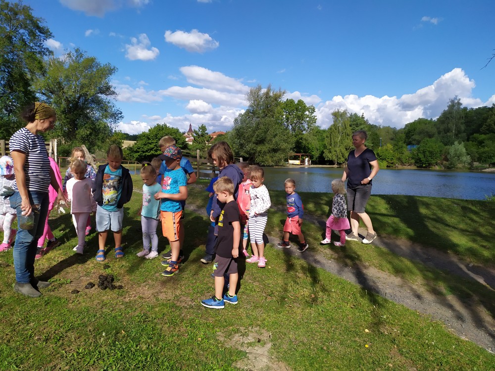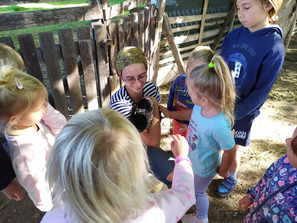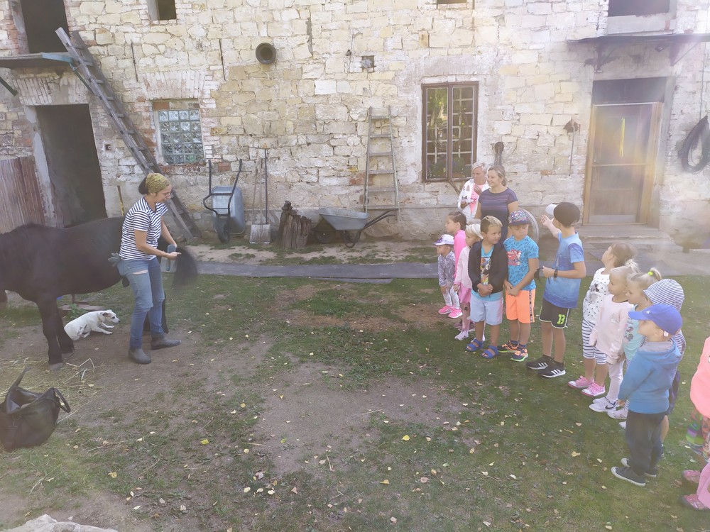 Tu si mohly děti nejen prohlédnout, osahat, ale i ochutnat. Verča dětem ukázala, jak správně pečovat o koně, děti si mohly osahat koňské žíně a podívat se do stáje, kde koník bydlí, když je zima. Představila jim také brouka Chrobáka, který se živí koňským trusem, s jeho životem a dopadem na životní prostředí. Věřte, že tyto informace děti vyslechly s velikým zaujetím. Děti mohly nakrmit ovečky, ryby a kachny v rybníku, pohladit a nakrmit koníka, prohlédnout si zahradu i louku. Ze všech informací a prožitků dostaly pořádný hlad, tak si prostřely pod pergolou a pochutnávaly si na sekané s chlebem a čerstvé zelenině.