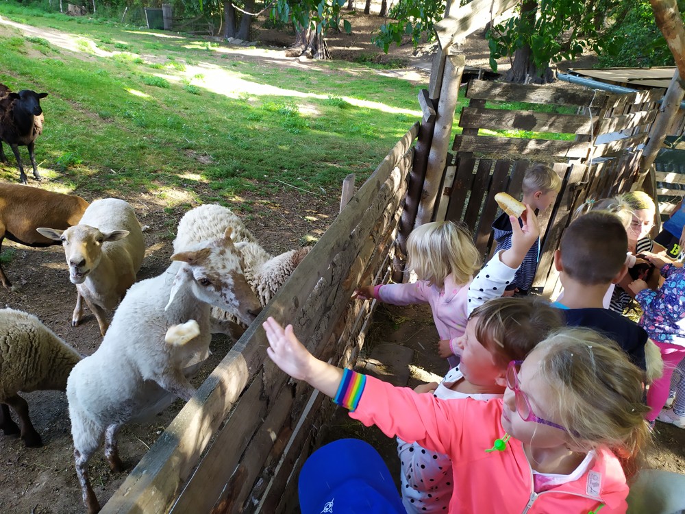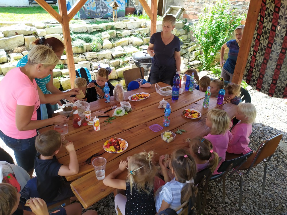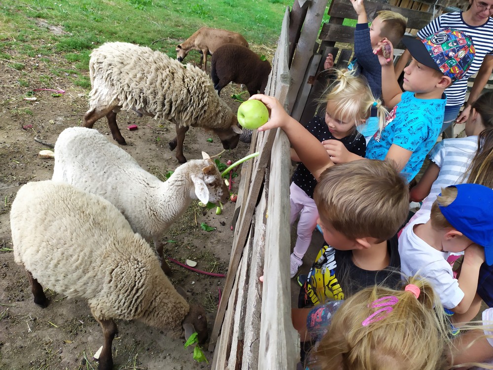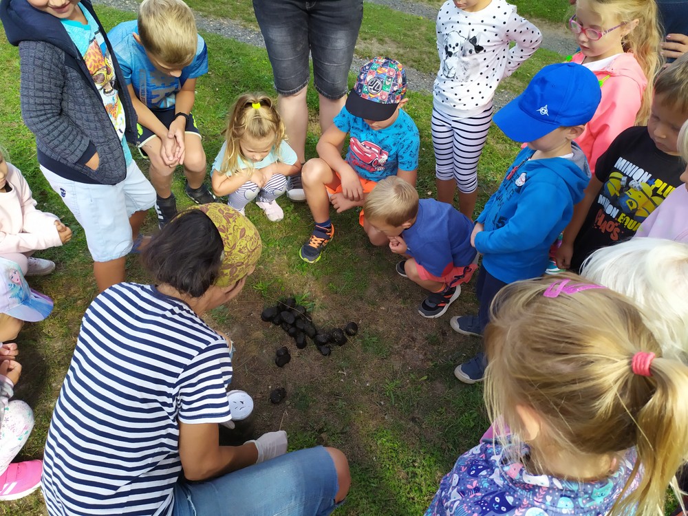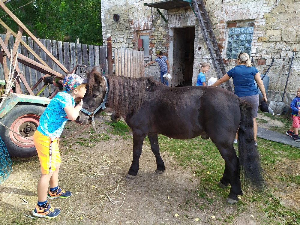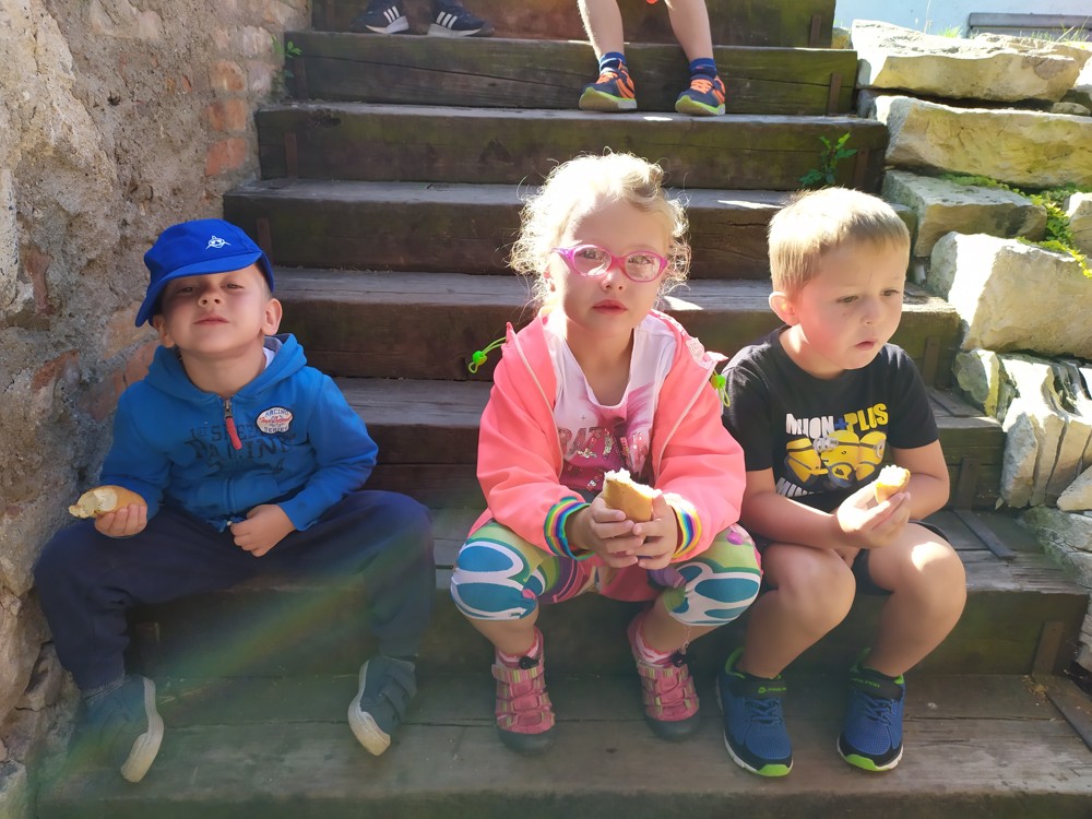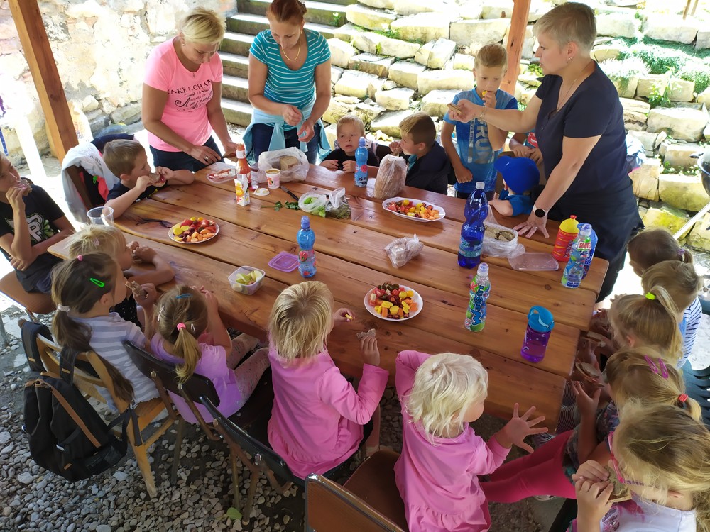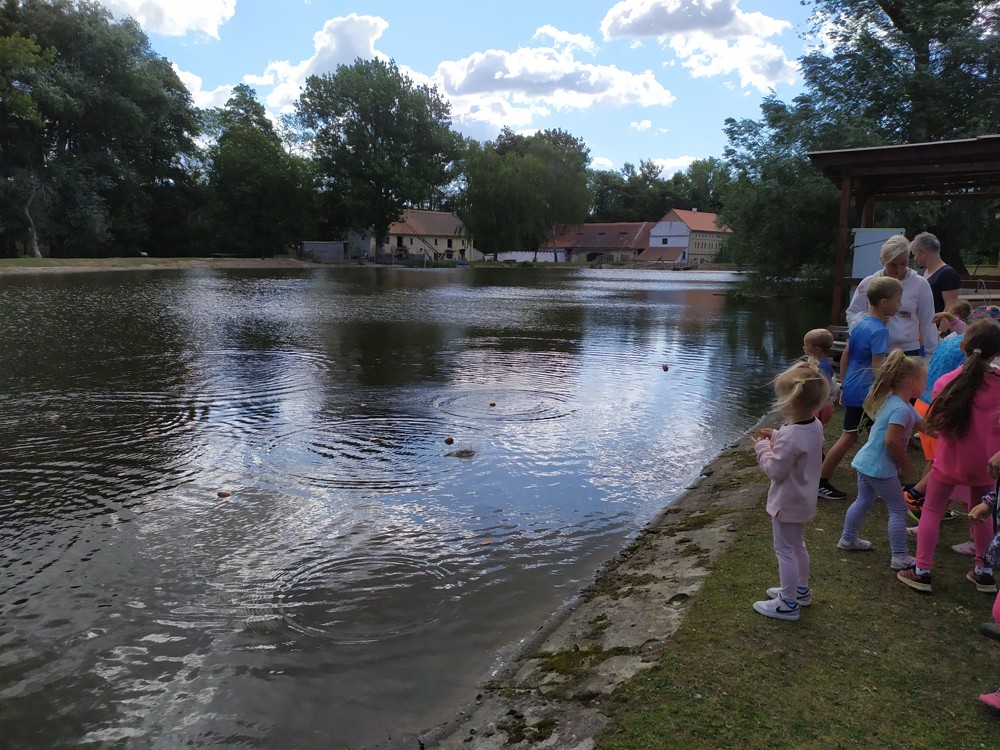 Tu si mohly děti nejen prohlédnout, osahat, ale i ochutnat. Verča dětem ukázala, jak správně pečovat o koně, děti si mohly osahat koňské žíně a podívat se do stáje, kde koník bydlí, když je zima. Představila jim také brouka Chrobáka, který se živí koňským trusem, s jeho životem a dopadem na životní prostředí. Věřte, že tyto informace děti vyslechly s velikým zaujetím. Děti mohly nakrmit ovečky, ryby a kachny v rybníku, pohladit a nakrmit koníka, prohlédnout si zahradu i louku. Ze všech informací a prožitků dostaly pořádný hlad, tak si prostřely pod pergolou a pochutnávaly si na sekané s chlebem a čerstvé zelenině.
