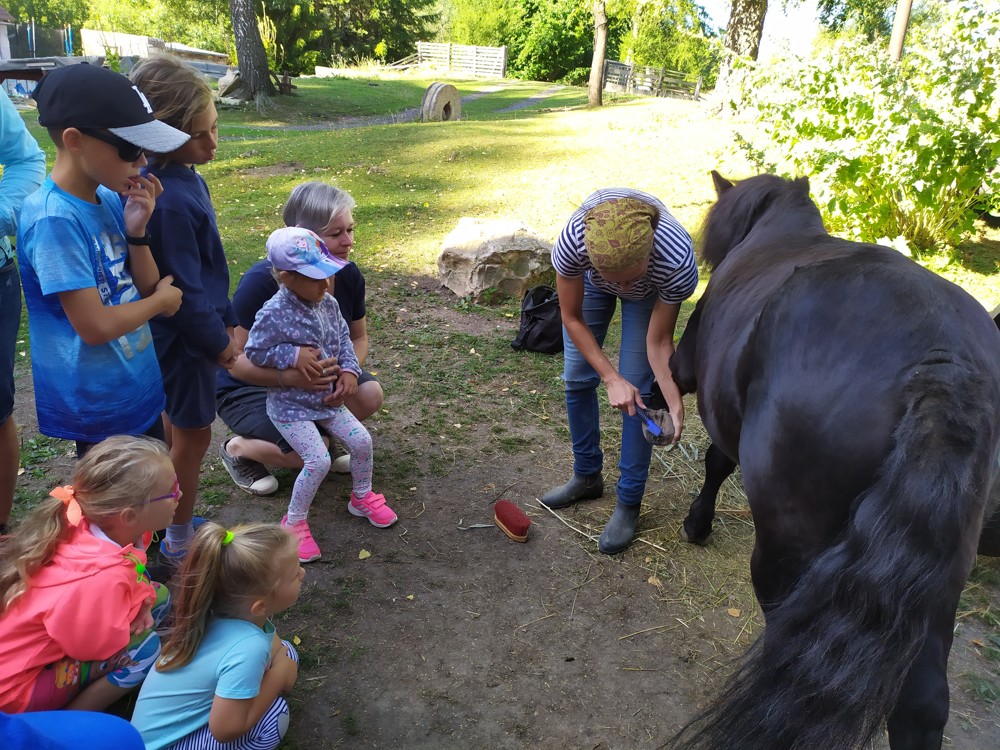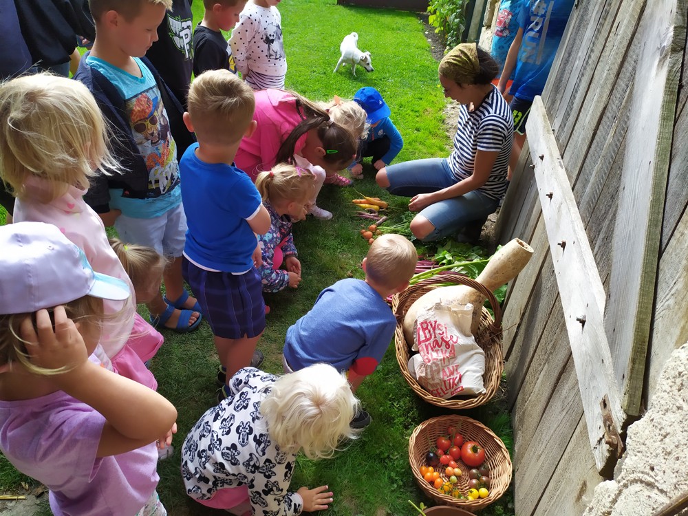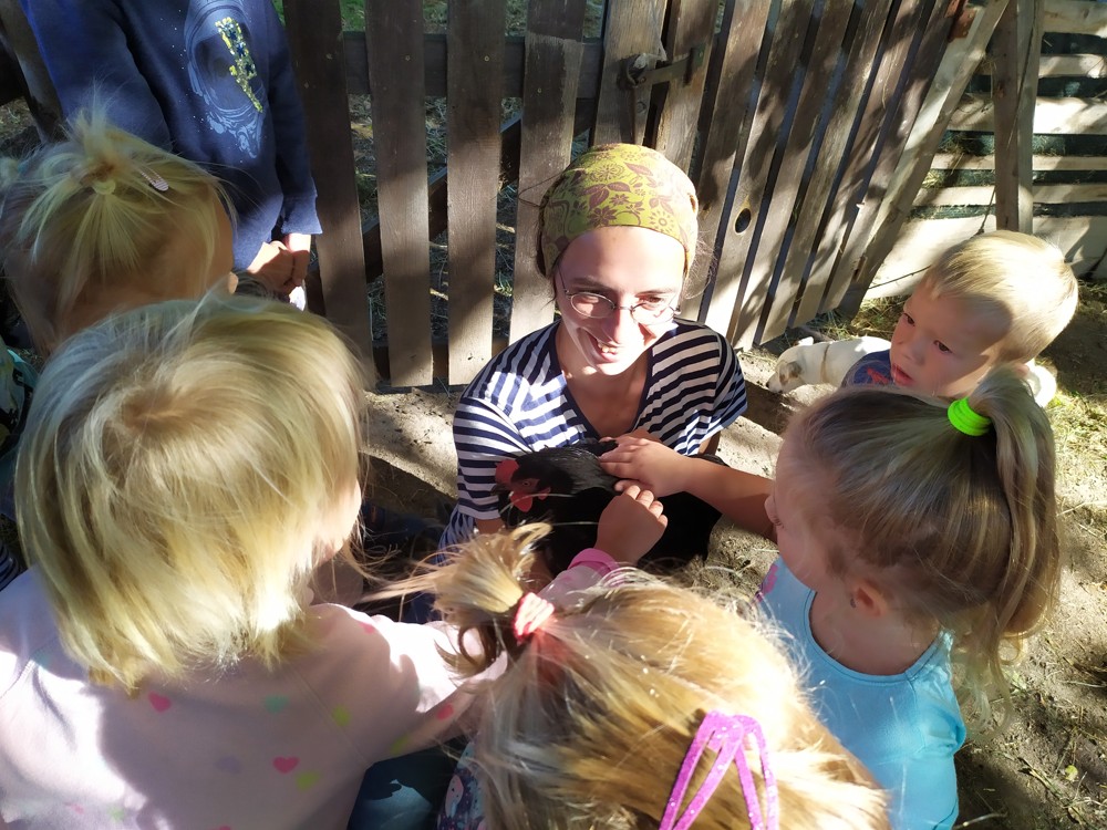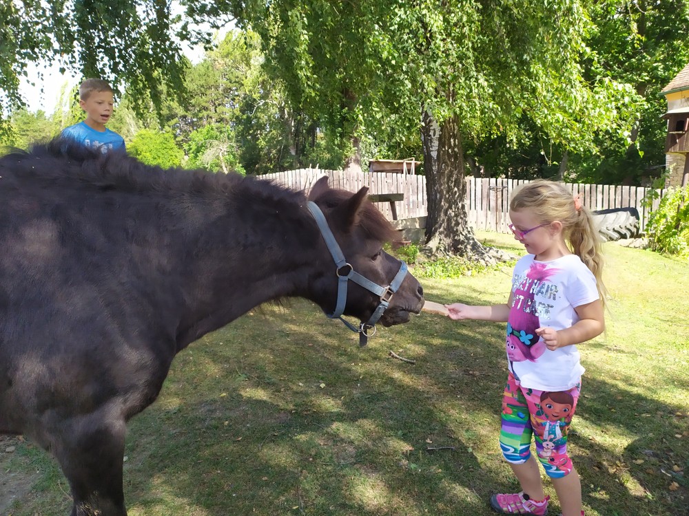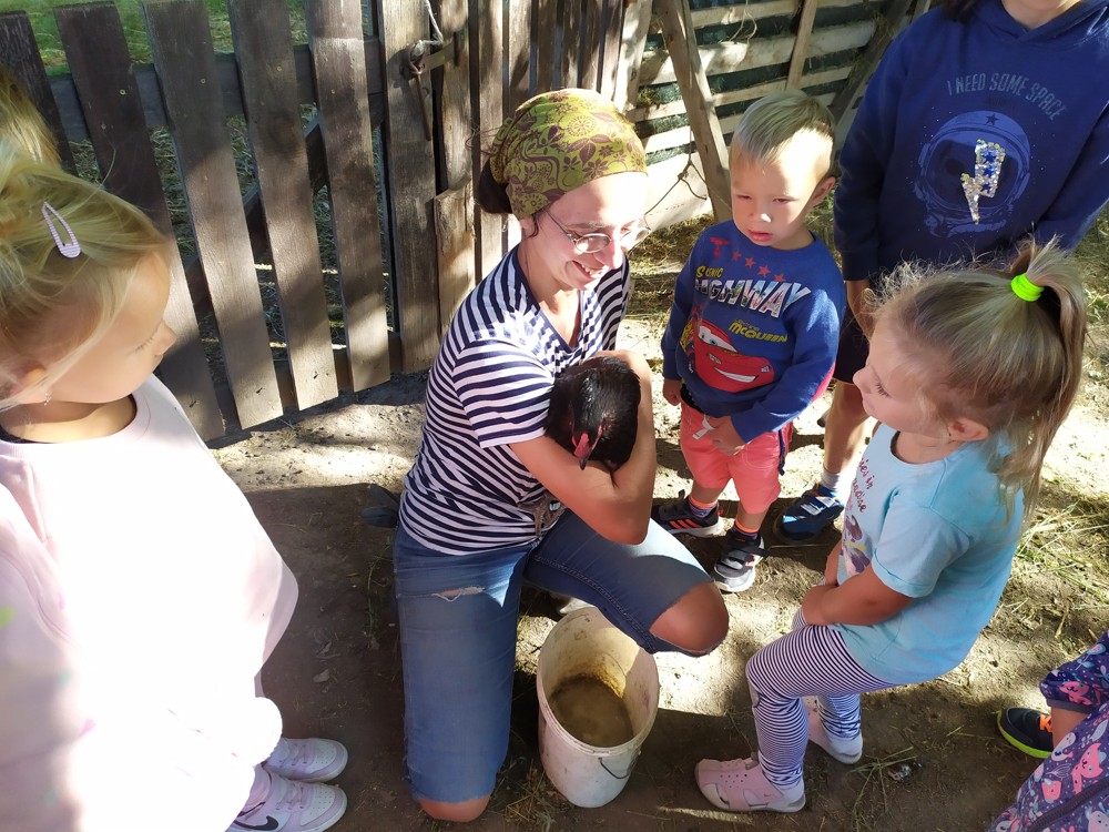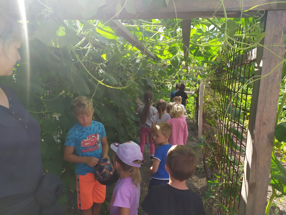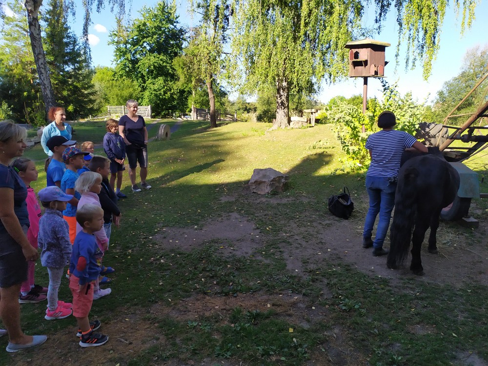 Tu si mohly děti nejen prohlédnout, osahat, ale i ochutnat. Verča dětem ukázala, jak správně pečovat o koně, děti si mohly osahat koňské žíně a podívat se do stáje, kde koník bydlí, když je zima. Představila jim také brouka Chrobáka, který se živí koňským trusem, s jeho životem a dopadem na životní prostředí. Věřte, že tyto informace děti vyslechly s velikým zaujetím. Děti mohly nakrmit ovečky, ryby a kachny v rybníku, pohladit a nakrmit koníka, prohlédnout si zahradu i louku. Ze všech informací a prožitků dostaly pořádný hlad, tak si prostřely pod pergolou a pochutnávaly si na sekané s chlebem a čerstvé zelenině.