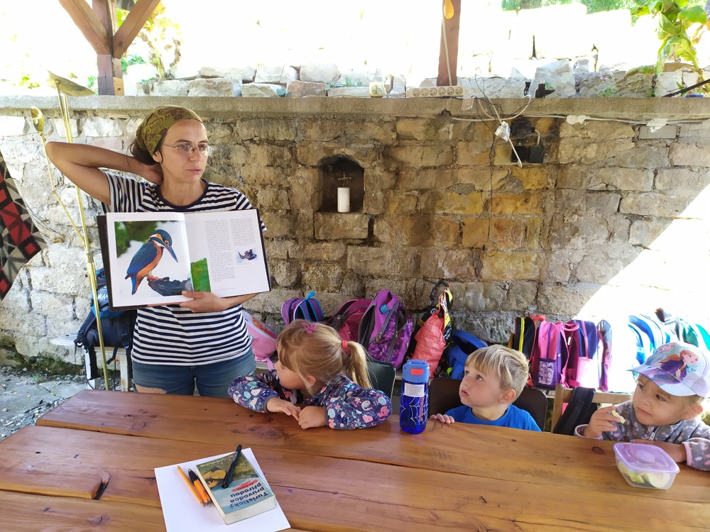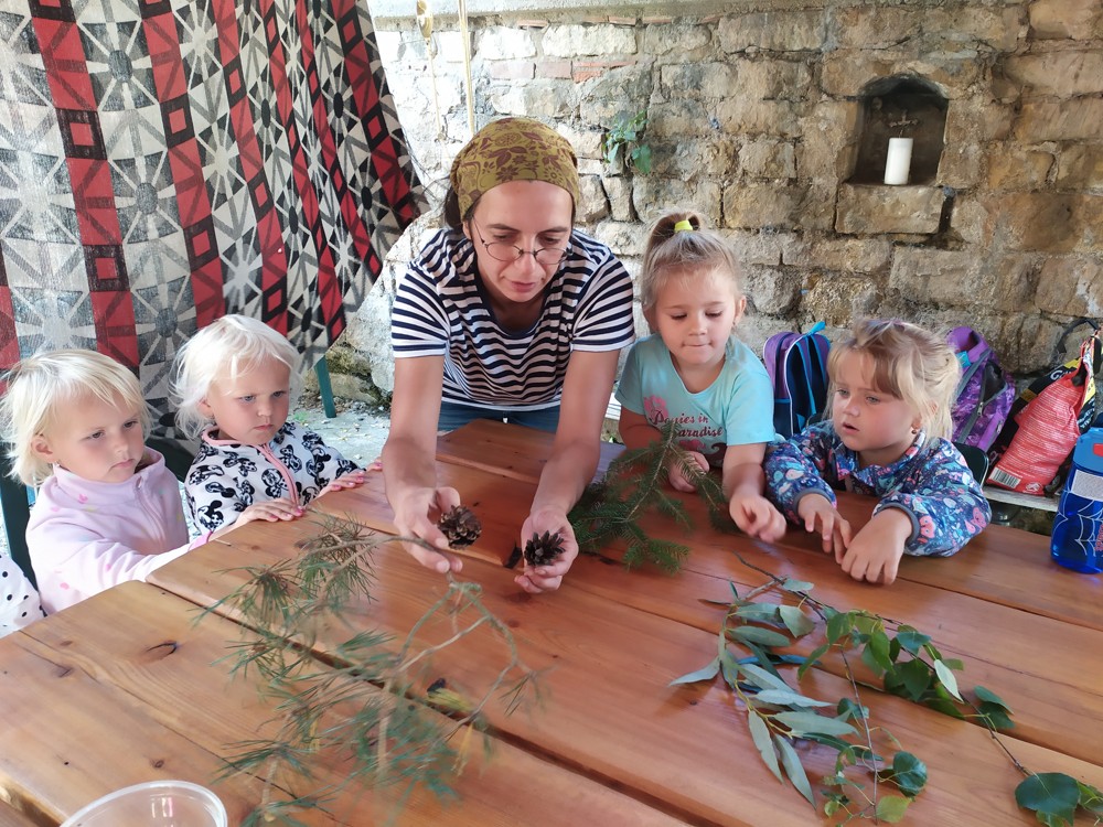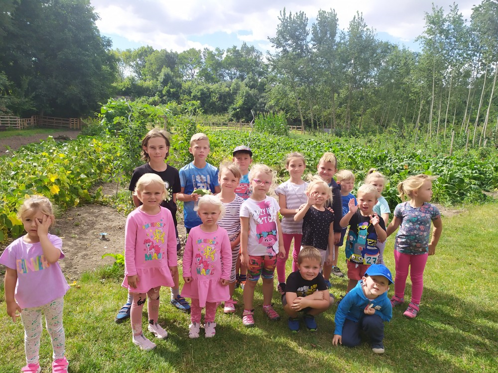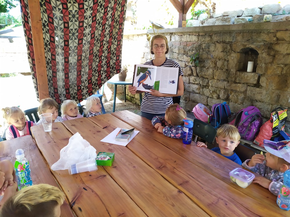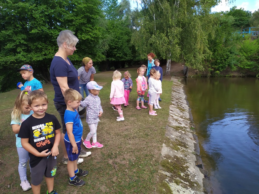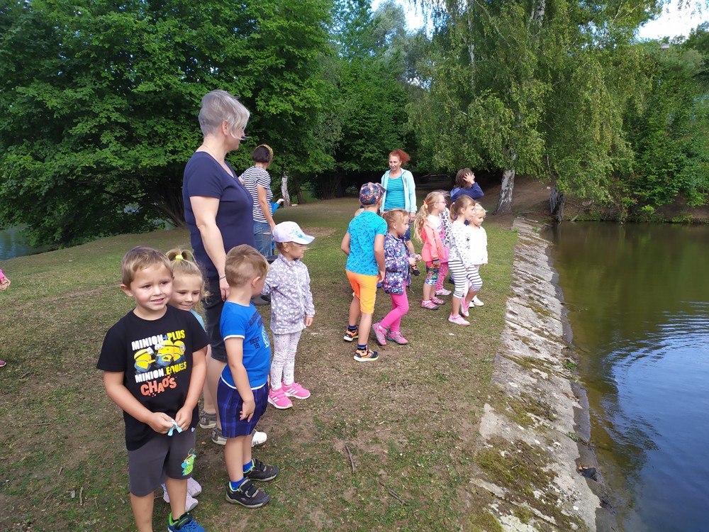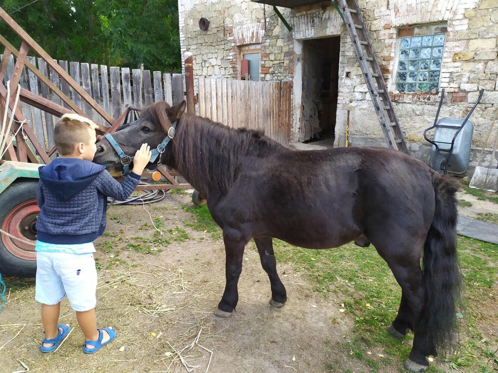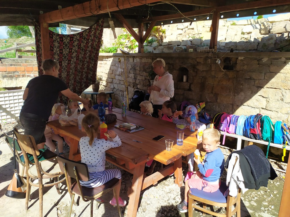 Tu si mohly děti nejen prohlédnout, osahat, ale i ochutnat. Verča dětem ukázala, jak správně pečovat o koně, děti si mohly osahat koňské žíně a podívat se do stáje, kde koník bydlí, když je zima. Představila jim také brouka Chrobáka, který se živí koňským trusem, s jeho životem a dopadem na životní prostředí. Věřte, že tyto informace děti vyslechly s velikým zaujetím. Děti mohly nakrmit ovečky, ryby a kachny v rybníku, pohladit a nakrmit koníka, prohlédnout si zahradu i louku. Ze všech informací a prožitků dostaly pořádný hlad, tak si prostřely pod pergolou a pochutnávaly si na sekané s chlebem a čerstvé zelenině.