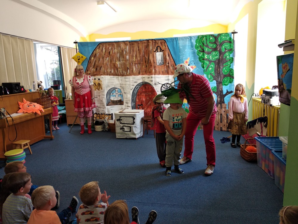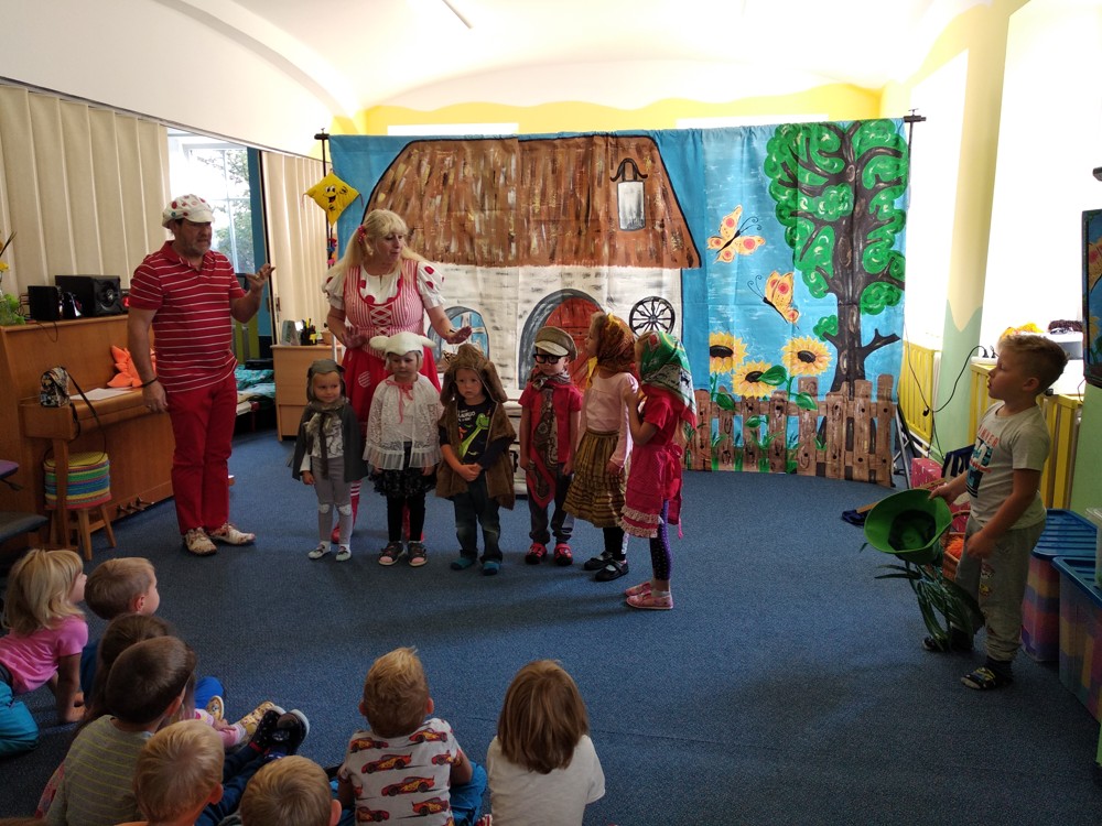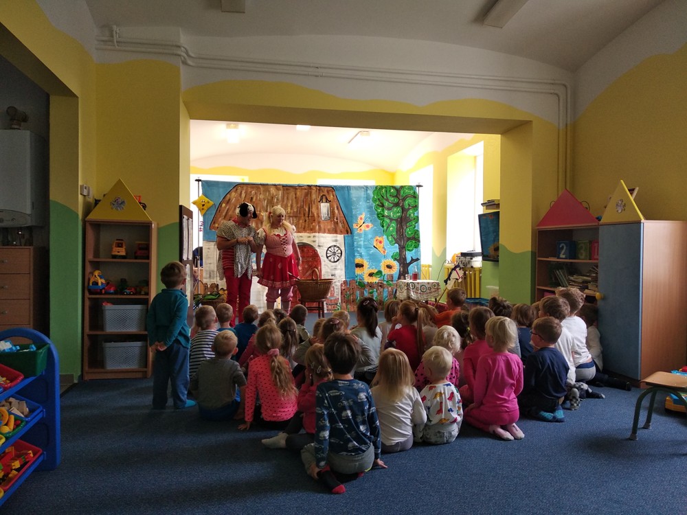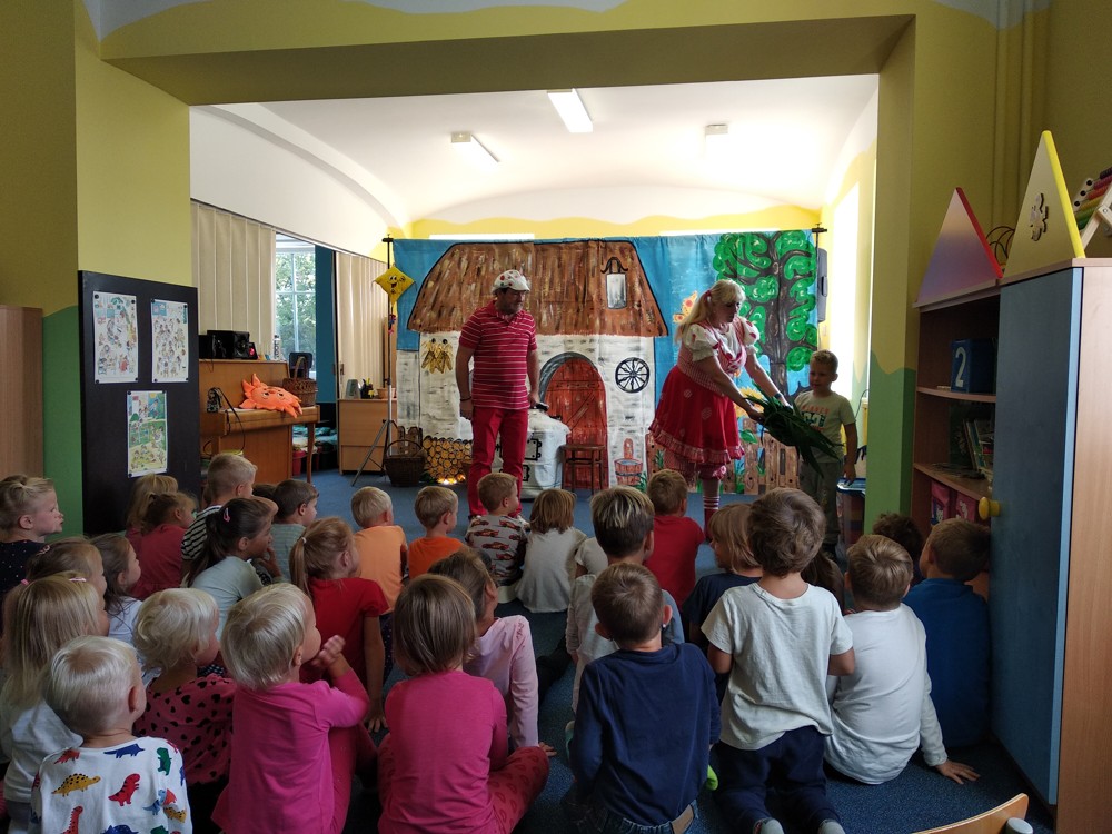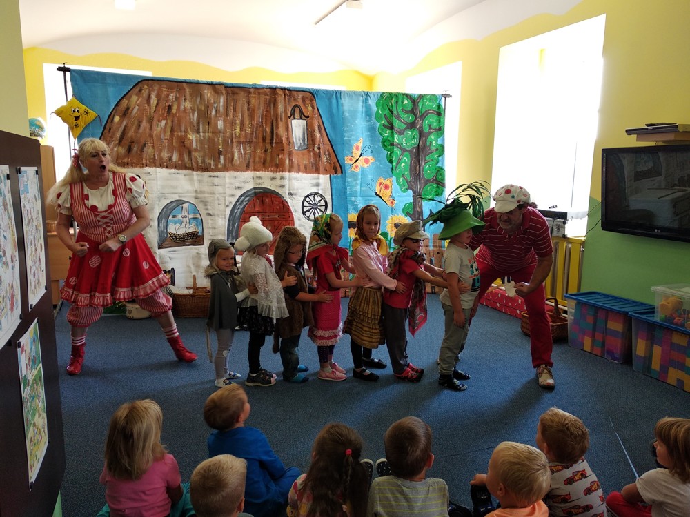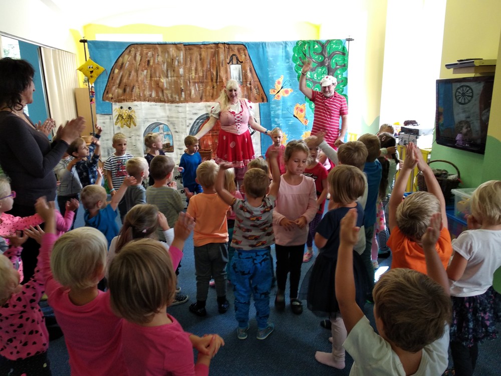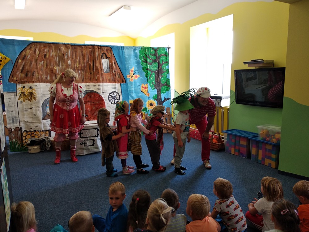 Dnes jsme se vypravili do Mateřské školy v Jeníkově, kam za námi přijelo Divadlo M z Duchcova s pohádkou " Majda a Kuba v pohádce". Pohádka se nám líbila o to víc, že si v ní mohly děti také zahrát. Nakonec jsme si společně zazpívali, zatančili a už byl čas se zase procházkou vrátit do naší školky