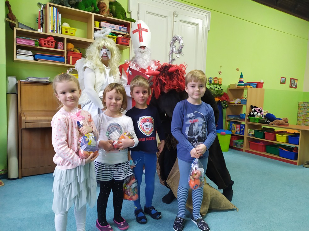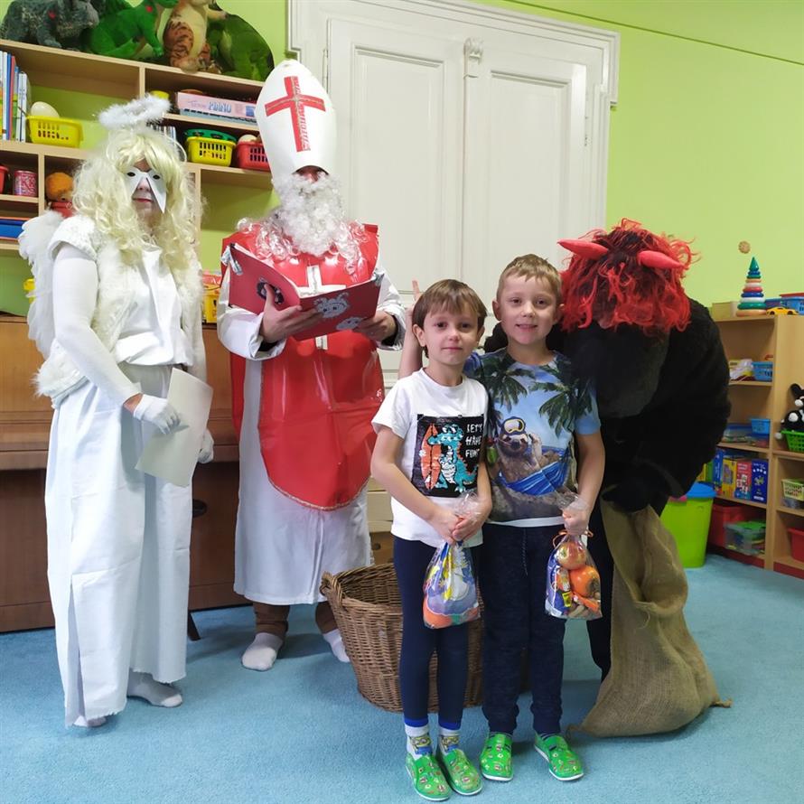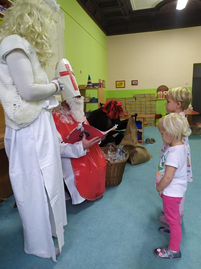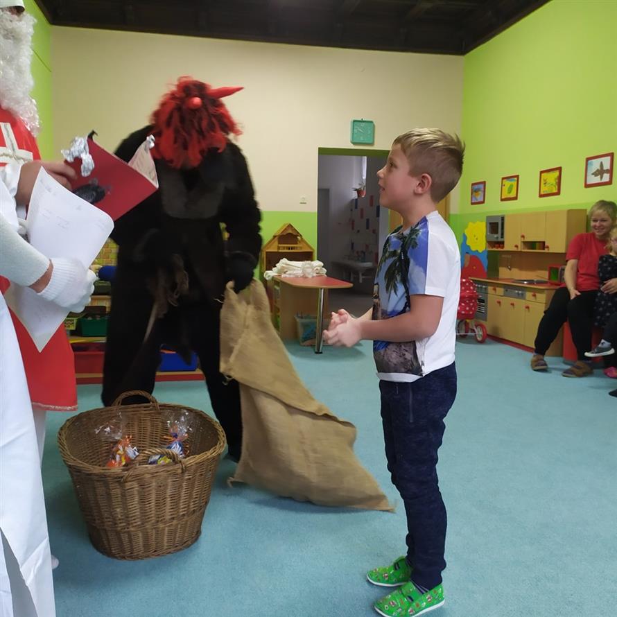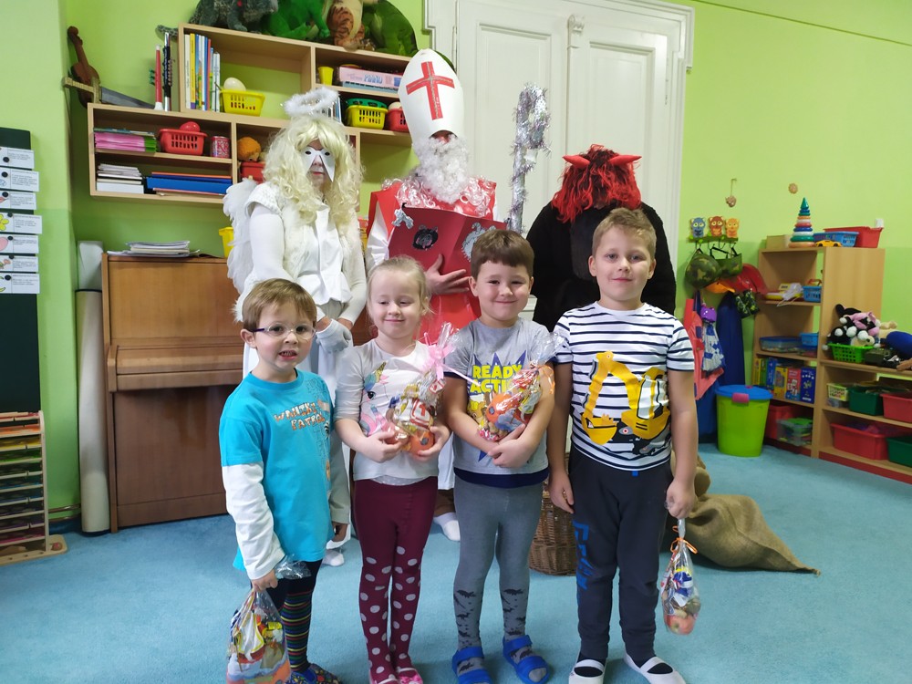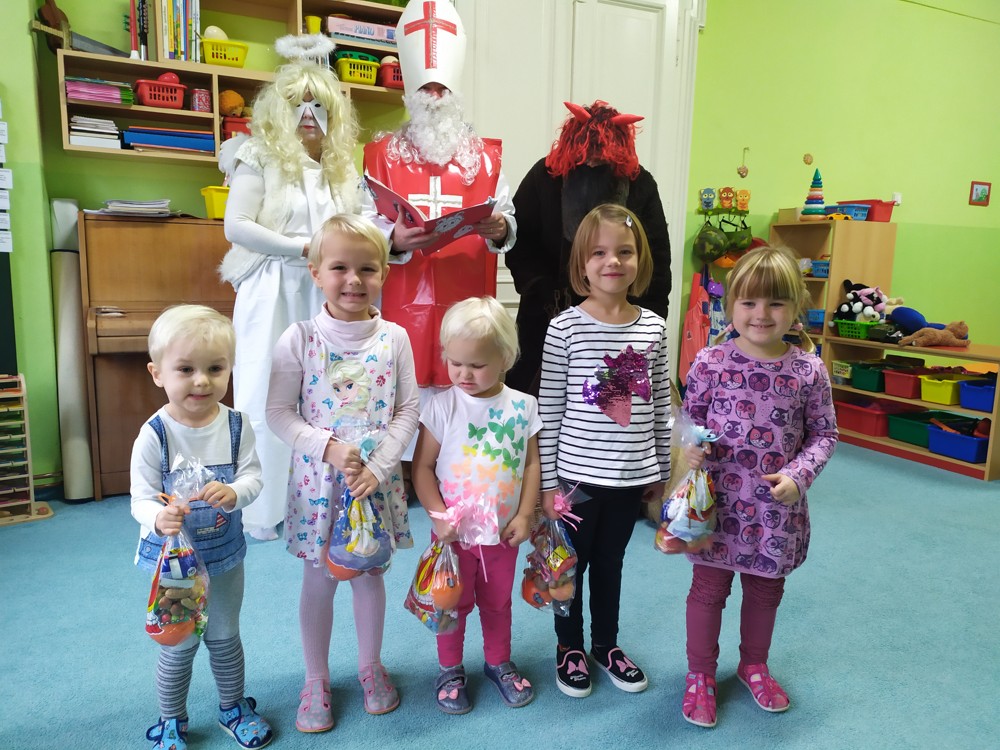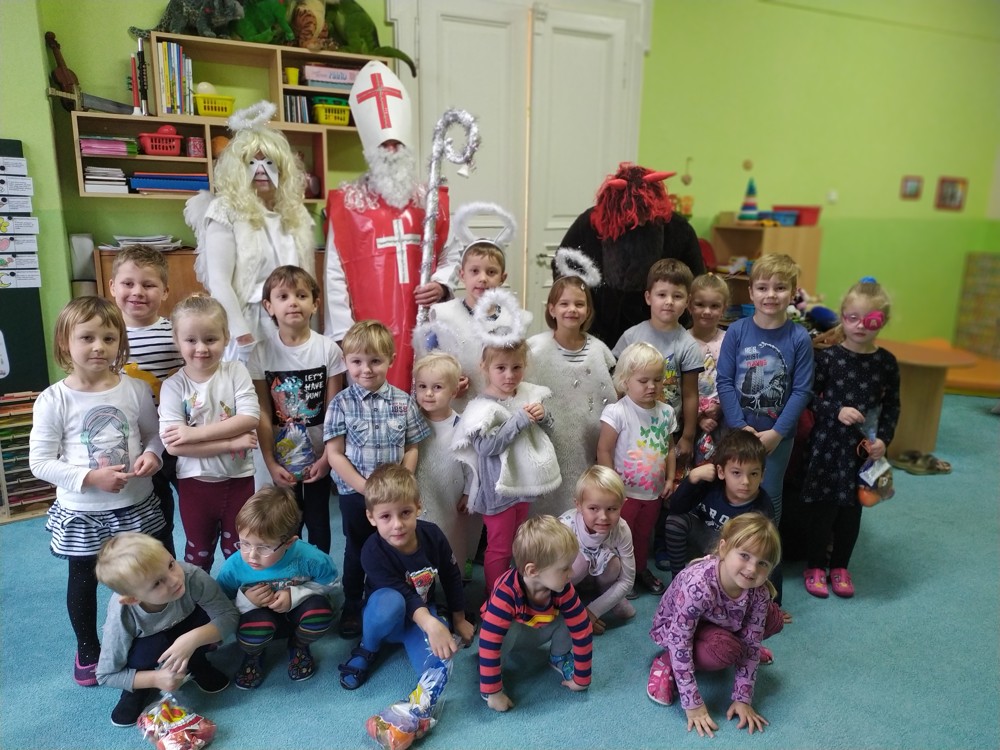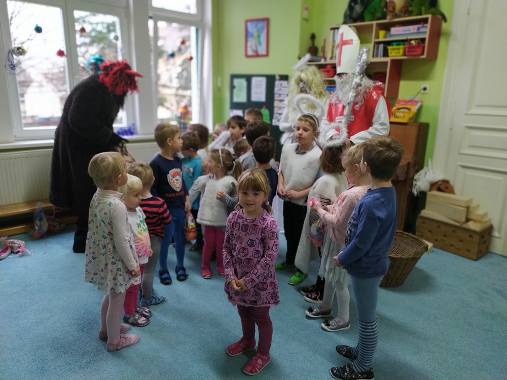 Tvořili jsme, malovali, abychom měli hotovou výzdobu před příchodem čerta a Mikuláše. Od rána jsme je vyhlíželi a konečně jsou tady. Někteří zlobílkové se trochu báli. "Co když čert a Mikuláš vidí nějaké to zlobení a odmlouvání maminkám? " Všechno ale dopadlo dobře, protože Mikuláš je hodný pán, který dává dětem marcipán a přivedl s sebou anděla, který vše zachraňoval a pomáhal svým andělským úsměvem. Tak zase za rok...