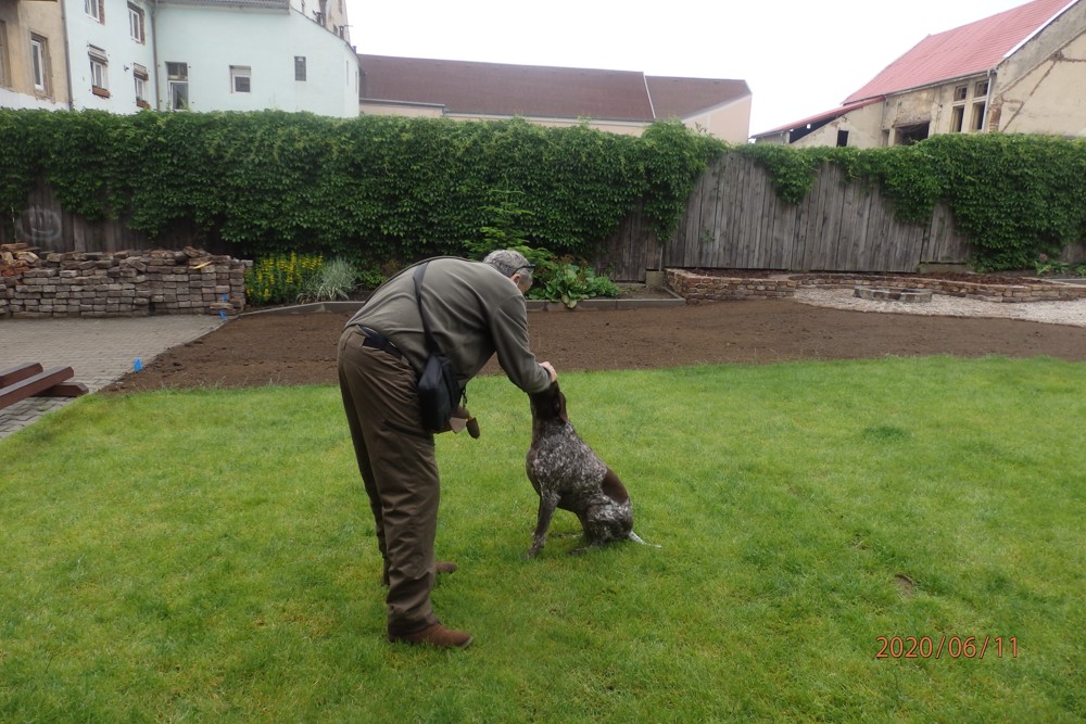 Na naši zahradu za dětmi přišel pan myslivec se svojí kolegyní a pejsky.