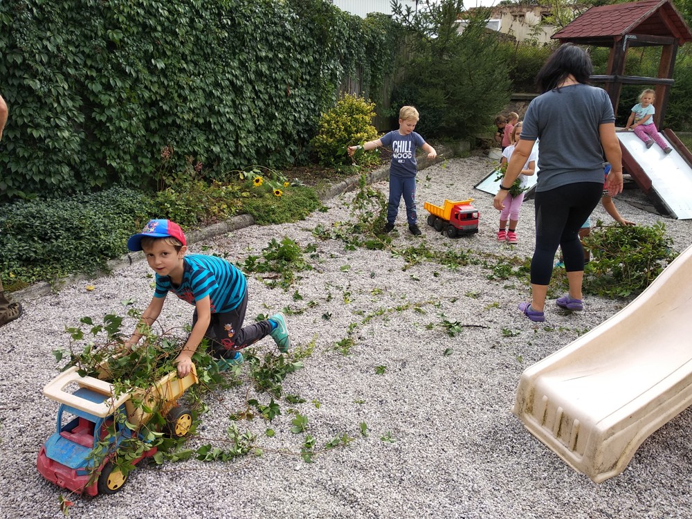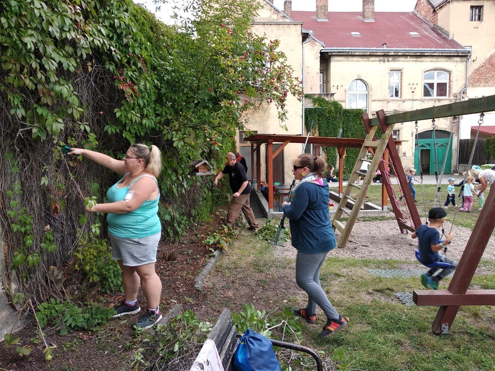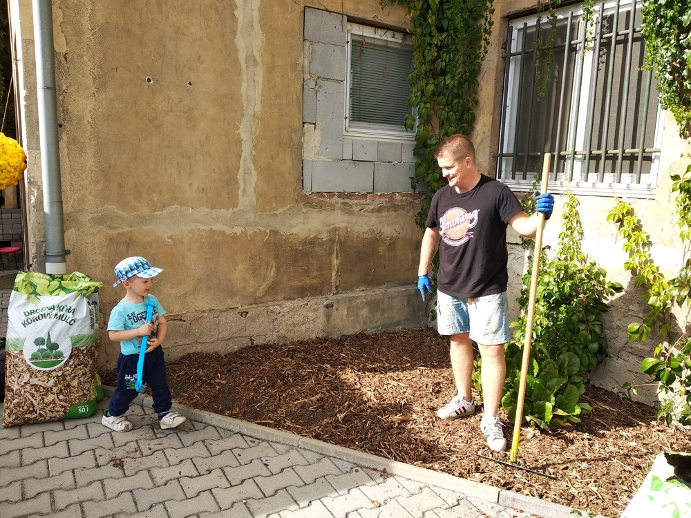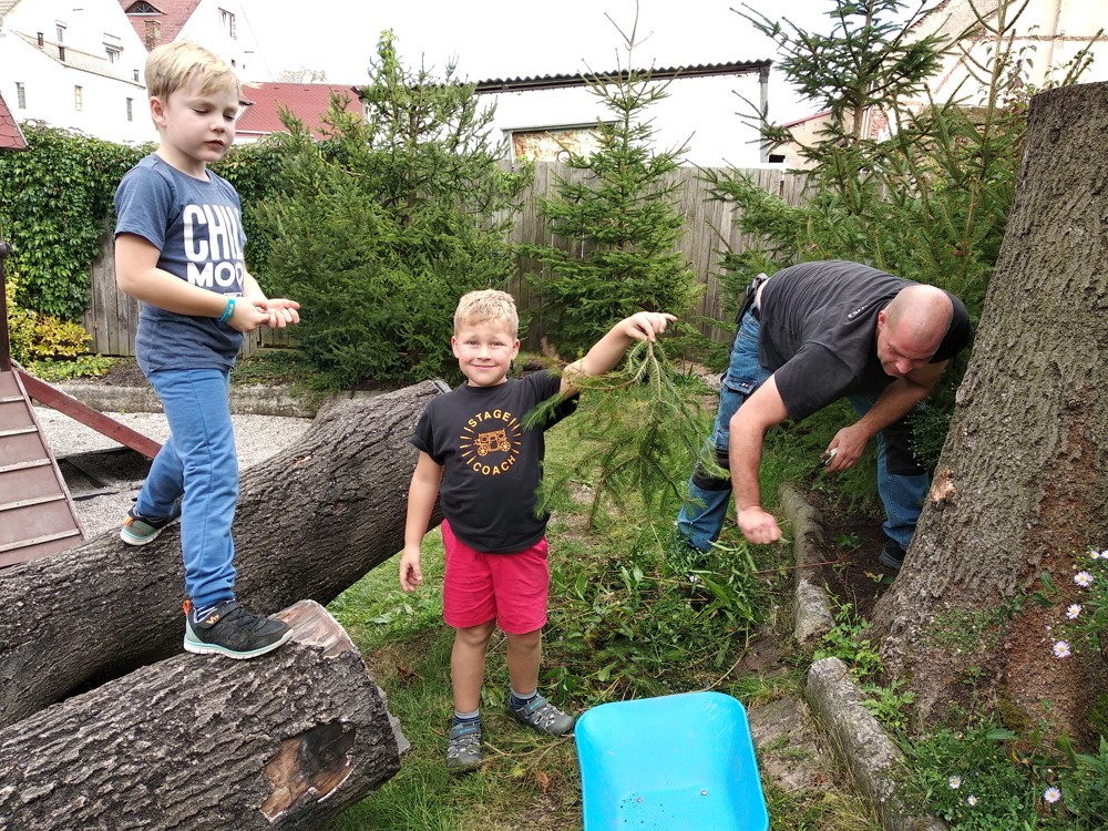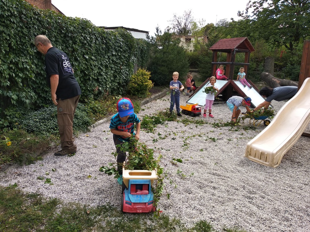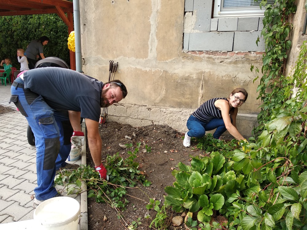 Je krásné čtvrteční odpoledne a na naší zahrádce se sešlo několik príma rodičů, kteří nám pomohli s údržbou herních prvků a úpravou záhonků.