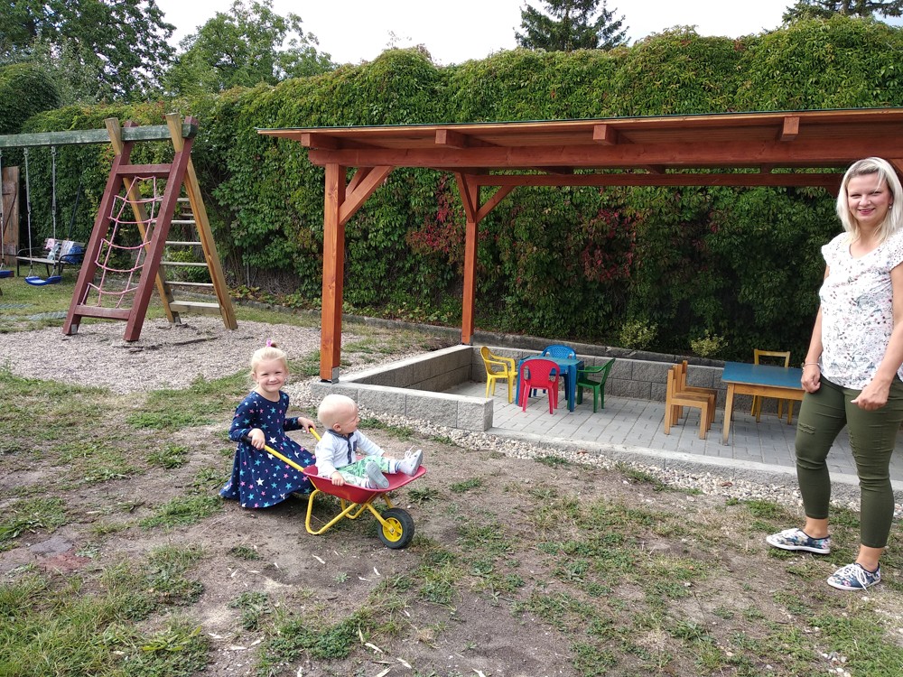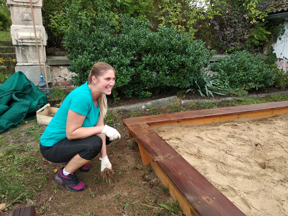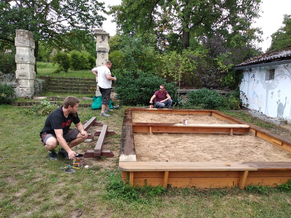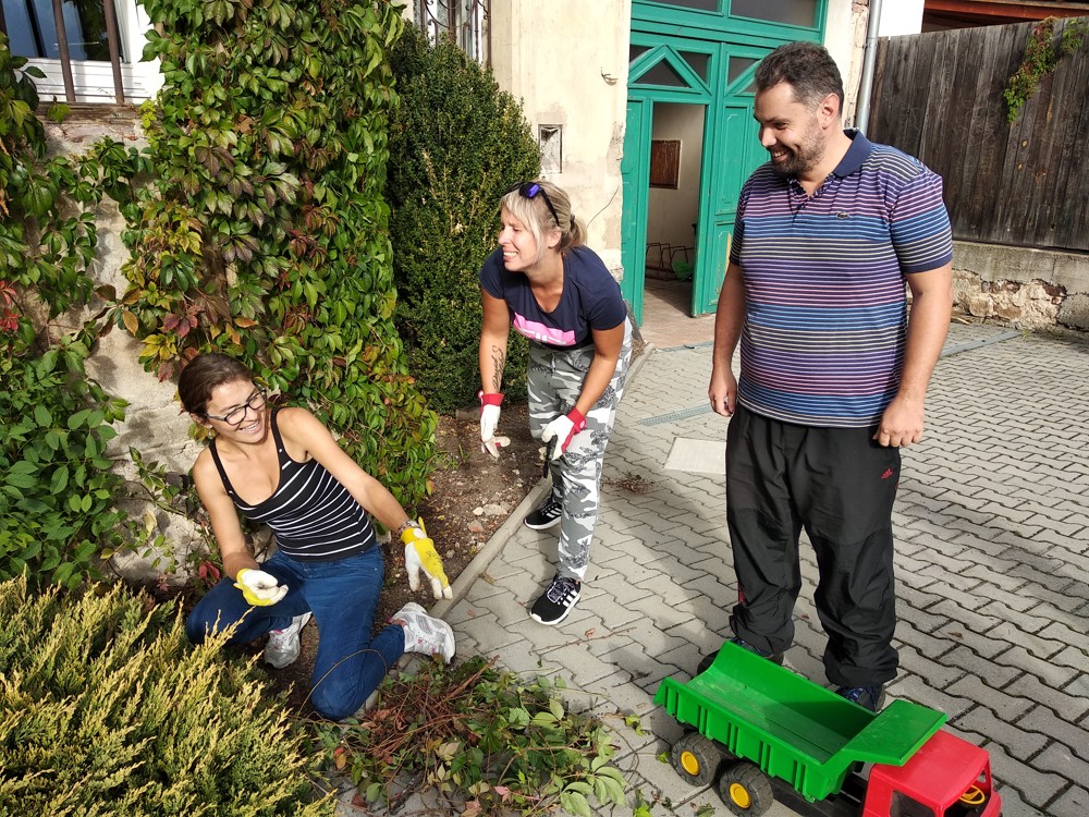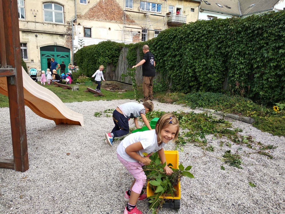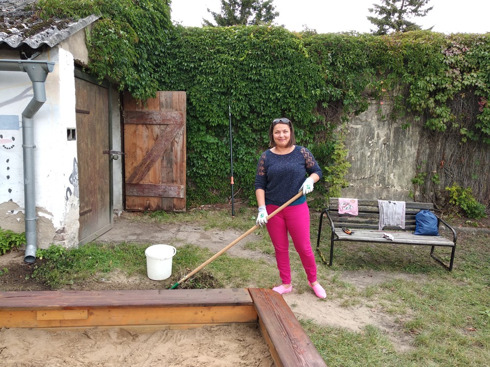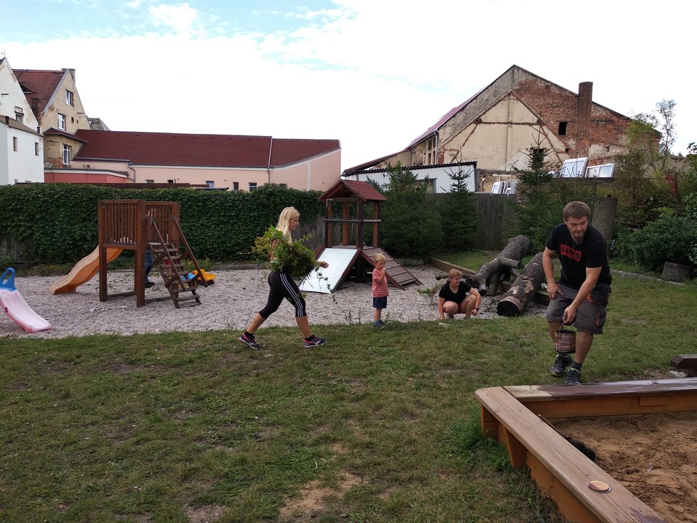 Je krásné čtvrteční odpoledne a na naší zahrádce se sešlo několik príma rodičů, kteří nám pomohli s údržbou herních prvků a úpravou záhonků.