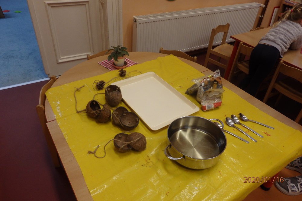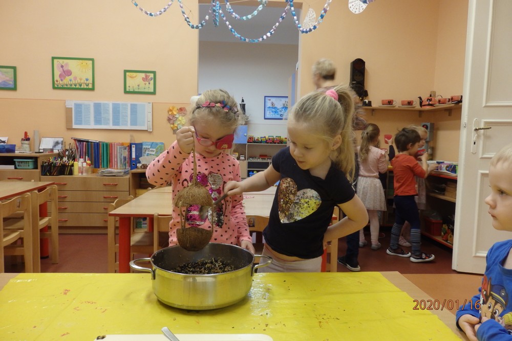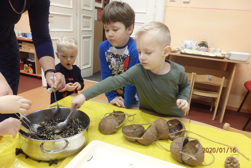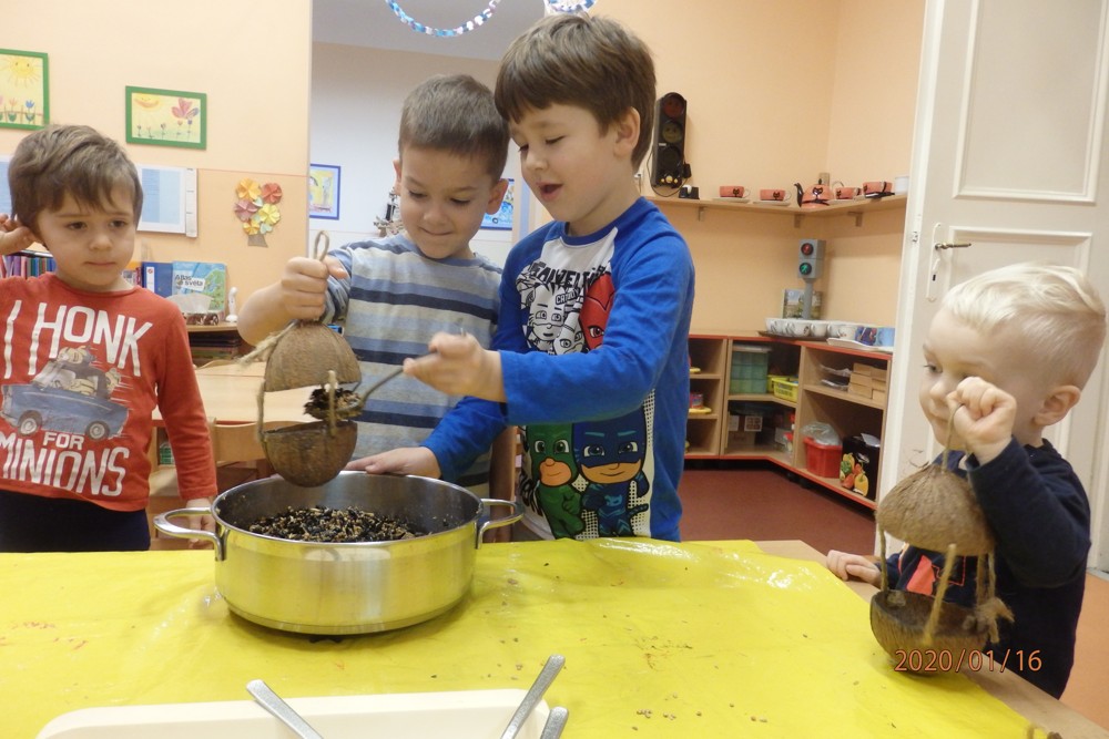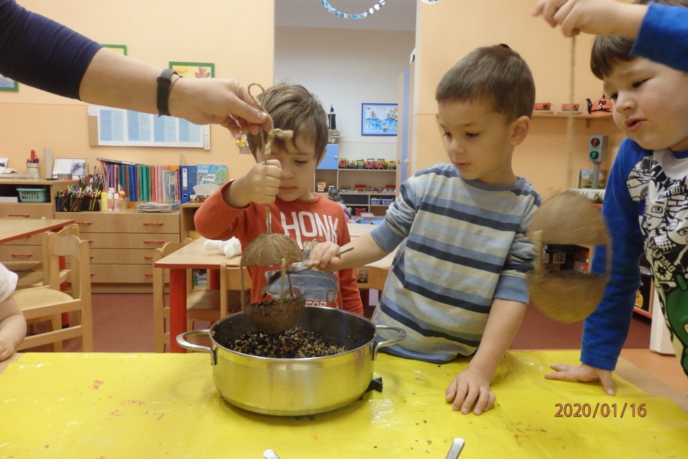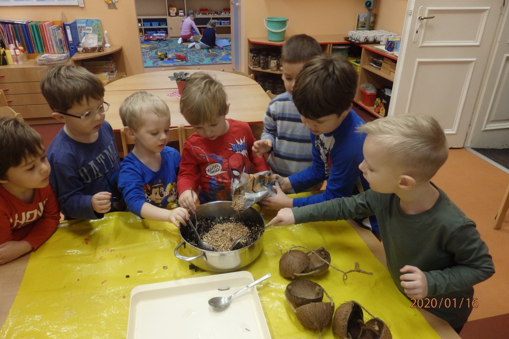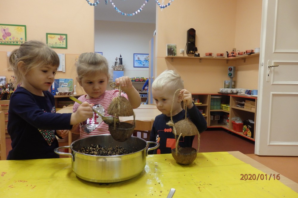 Starat se v zimě o ptáčky už se stalo v naší školce samozřejmostí. Paní zima se přihlásila o slovo, začalo mrznout, tak jsme se pustili do vaření. Děti vyrobily semínkové šišky a mističky, které pověsily na stromy před školkou. Tam můžeme ptáčky z oken pozorovat.