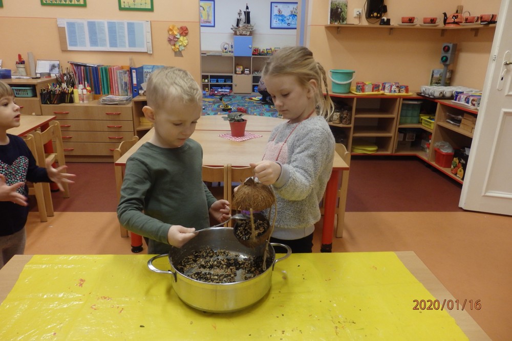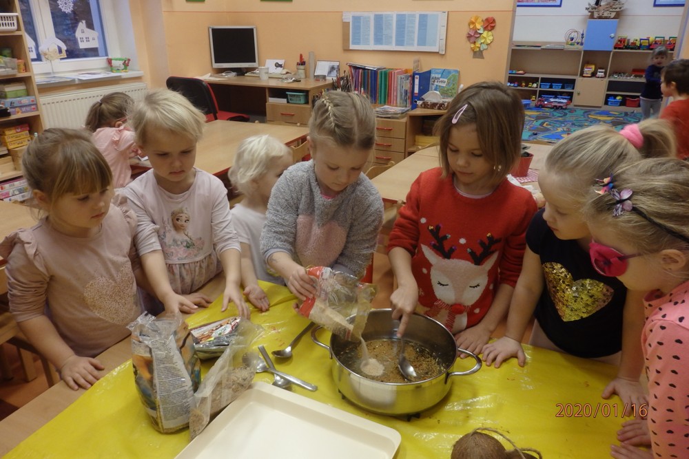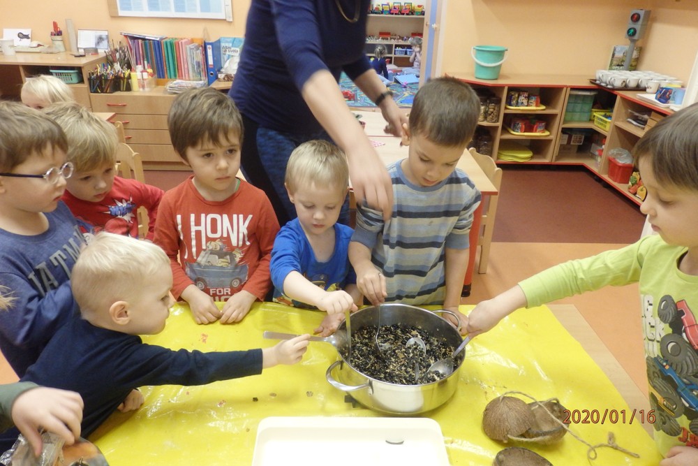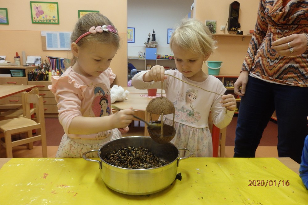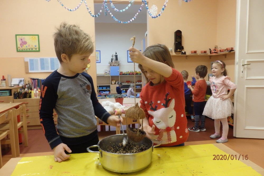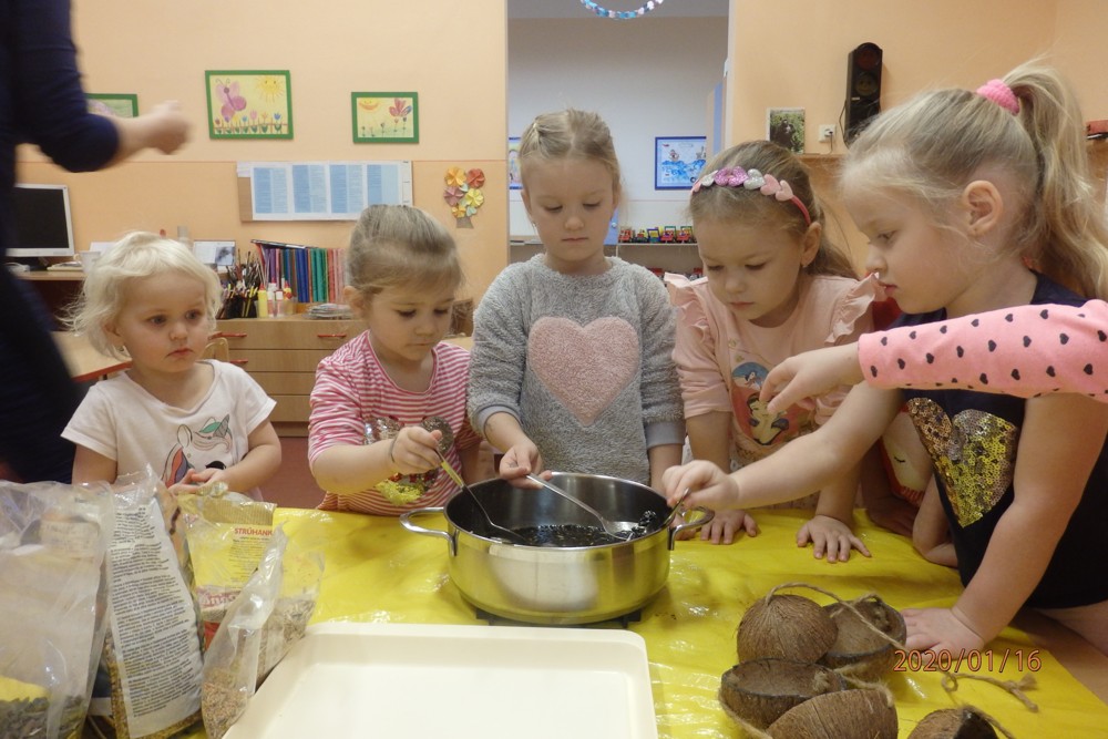 Starat se v zimě o ptáčky už se stalo v naší školce samozřejmostí. Paní zima se přihlásila o slovo, začalo mrznout, tak jsme se pustili do vaření. Děti vyrobily semínkové šišky a mističky, které pověsily na stromy před školkou. Tam můžeme ptáčky z oken pozorovat.