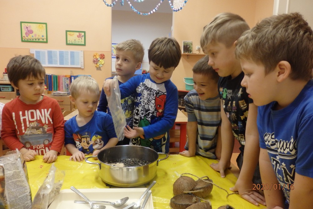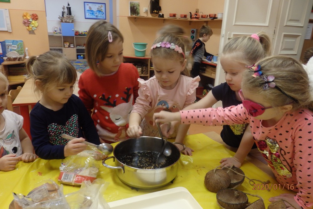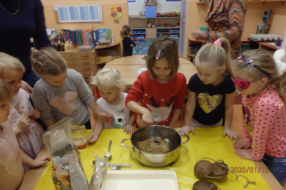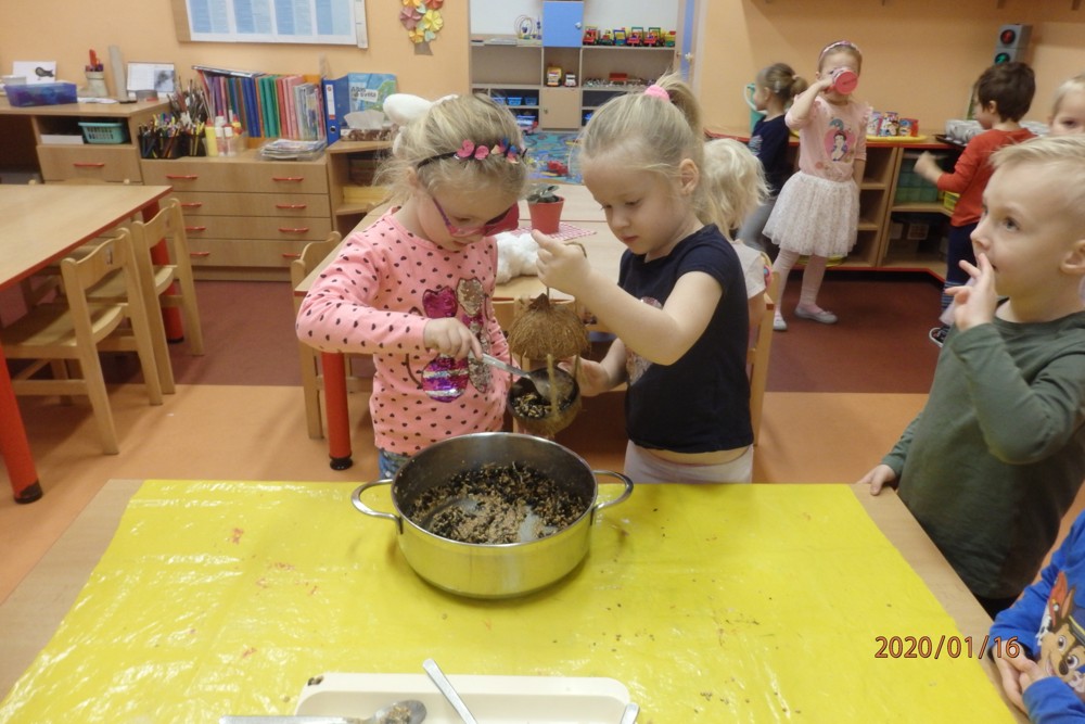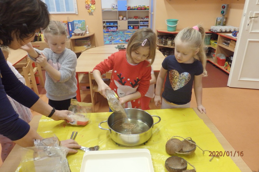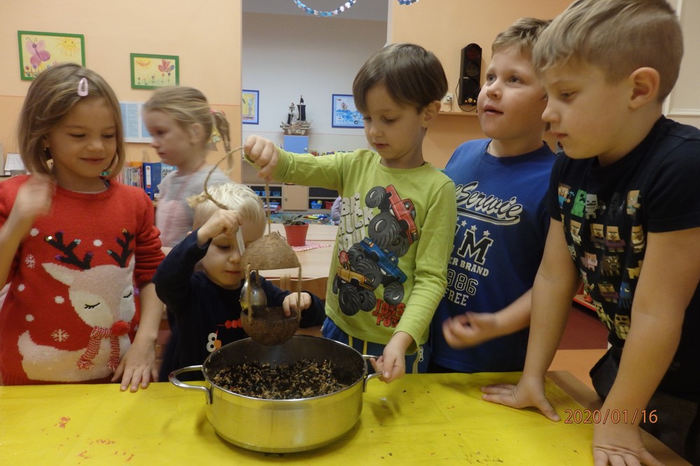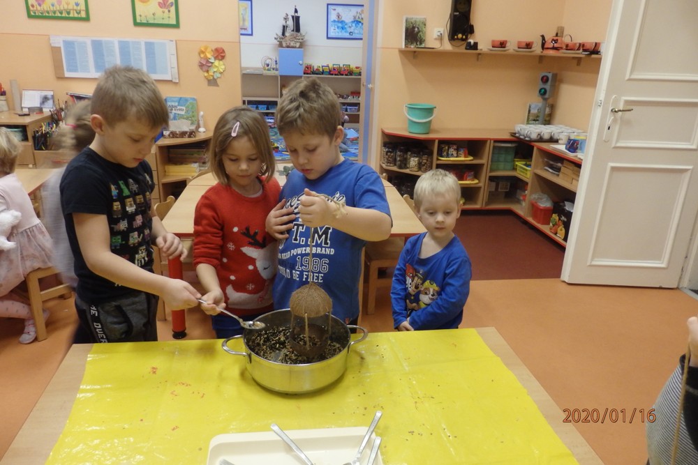 Starat se v zimě o ptáčky už se stalo v naší školce samozřejmostí. Paní zima se přihlásila o slovo, začalo mrznout, tak jsme se pustili do vaření. Děti vyrobily semínkové šišky a mističky, které pověsily na stromy před školkou. Tam můžeme ptáčky z oken pozorovat.