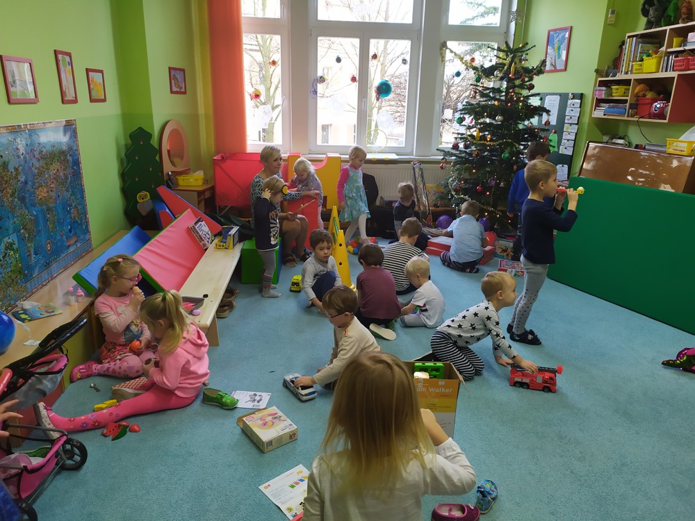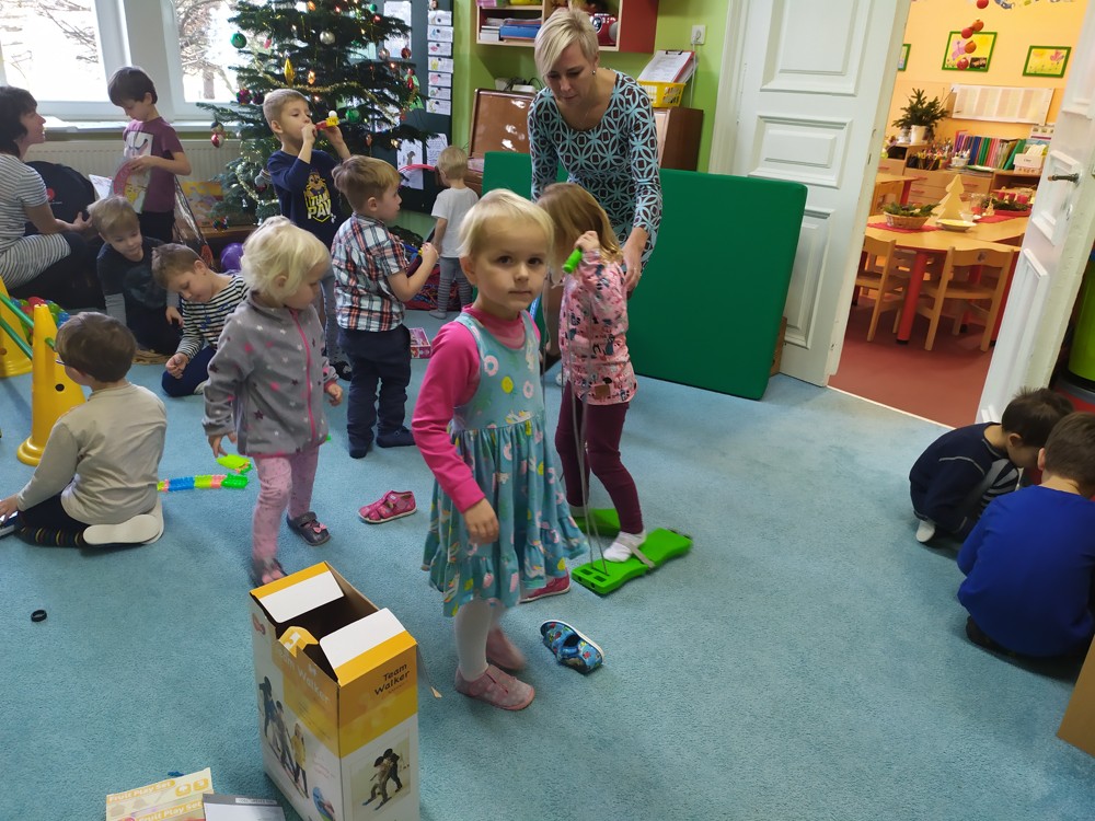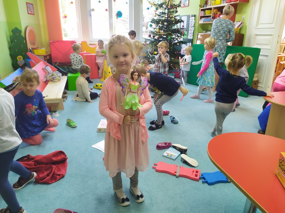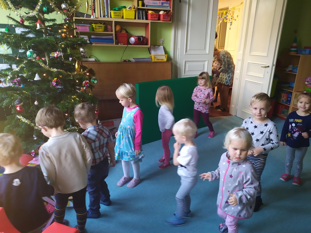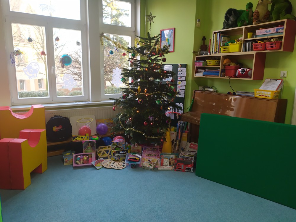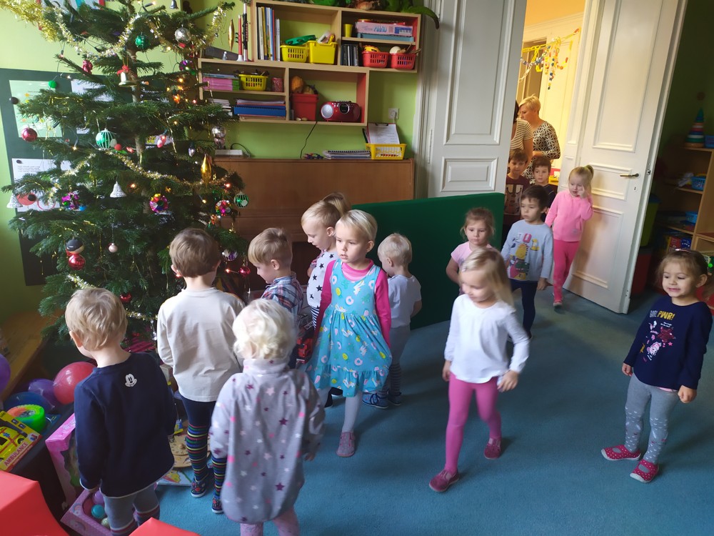 Zatím co děti ve třídě pozorovaly padající peříčka za okny, zpívaly a recitovaly, Ježíšek mohl v tichosti v herně nadělovat dárky pod vánoční stromeček.