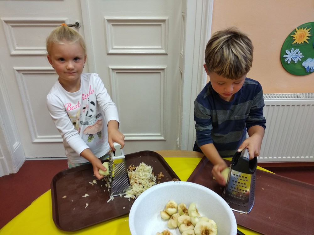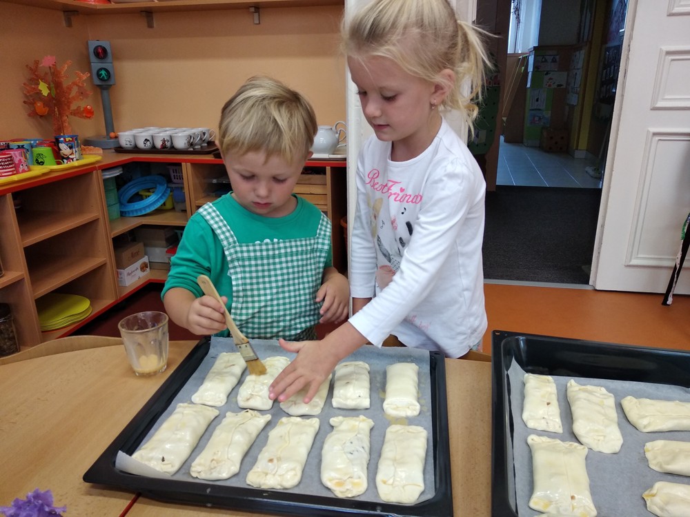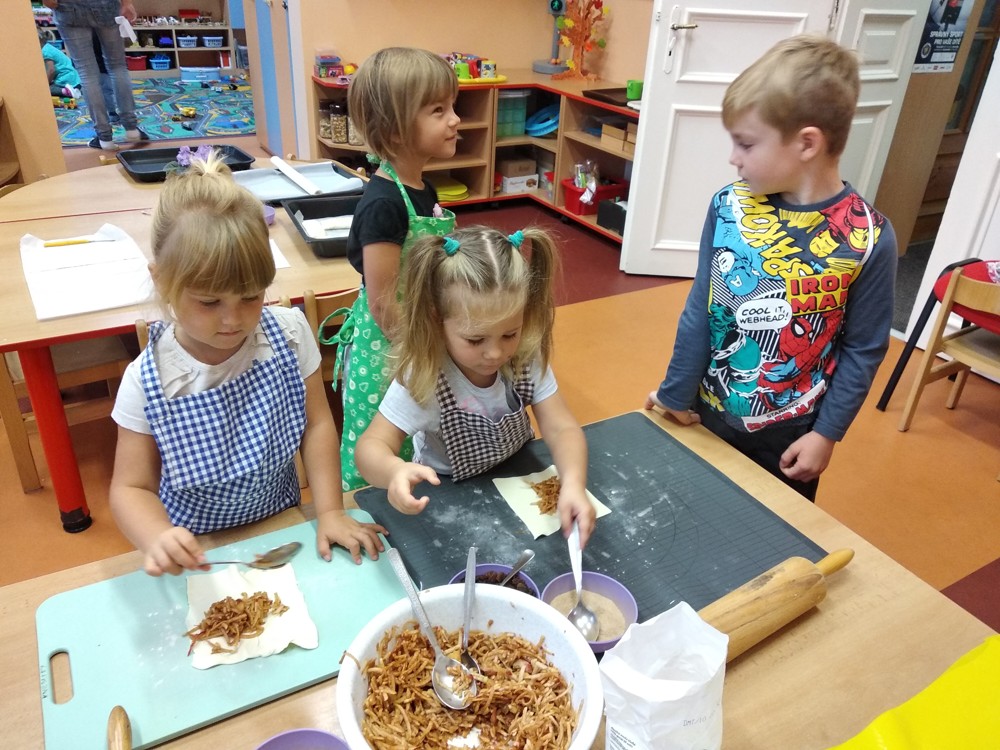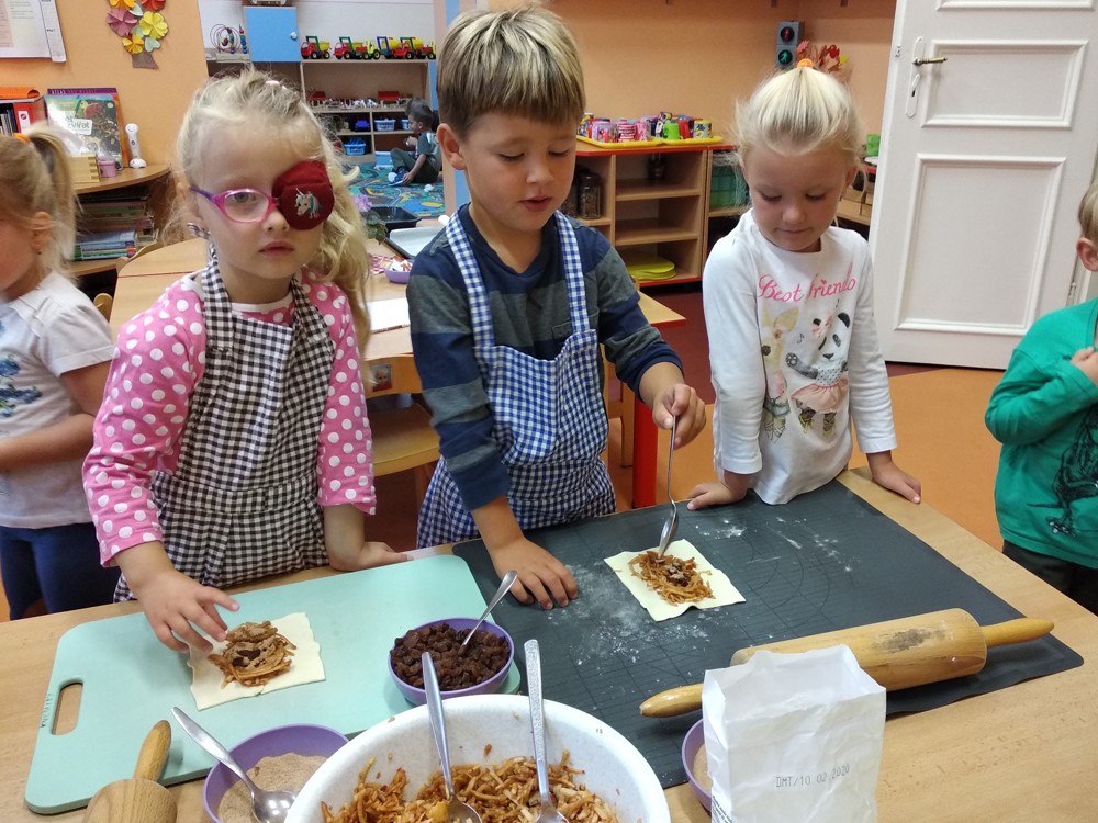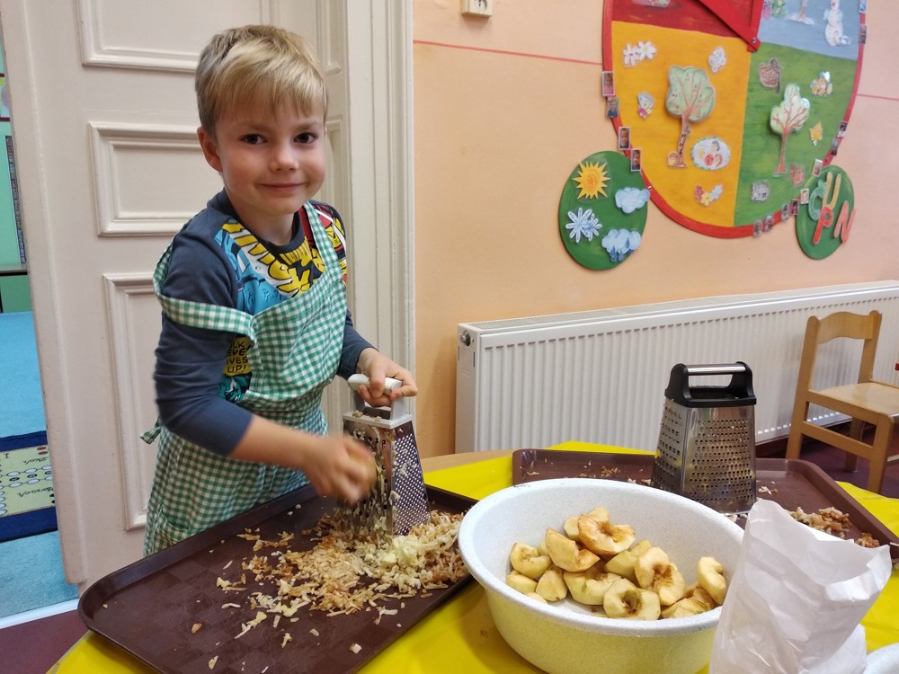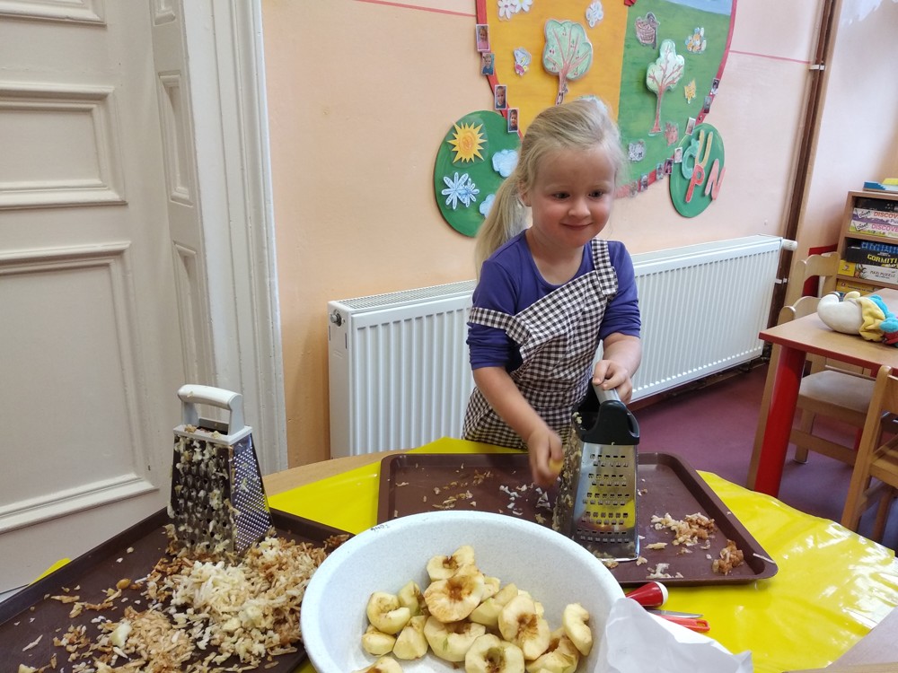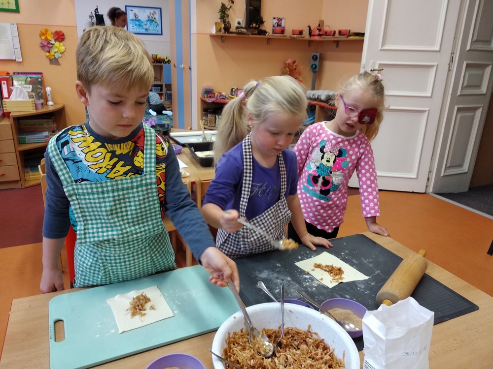 Přichází podzim a na naší školní zahrádce dozrávají jablíčka. S dětmi jsme je nasbírali, ve školce si s nimi hráli, počítali, zpívali, malovali jsme je a dnes je děti krájely, strouhaly a plnily do malých štrúdlíků. Děti byly moc šikovné a na svých výtvorech si doma s rodiči určitě moc pochutnaly.