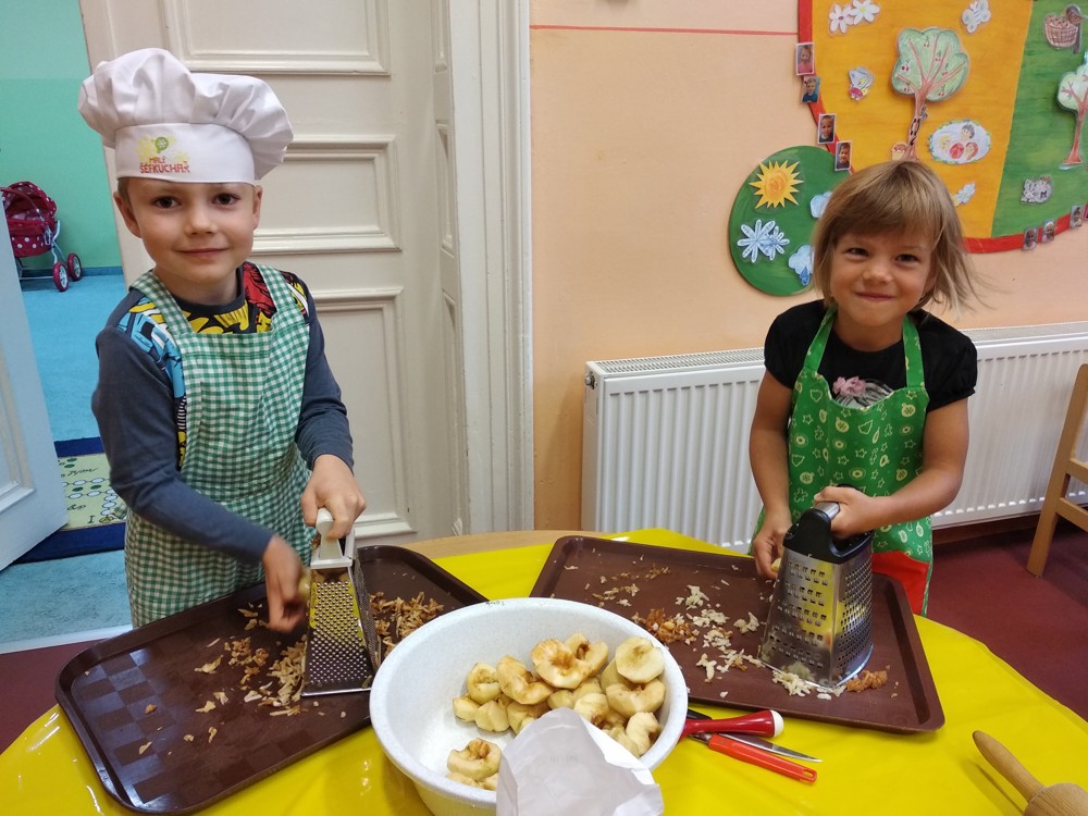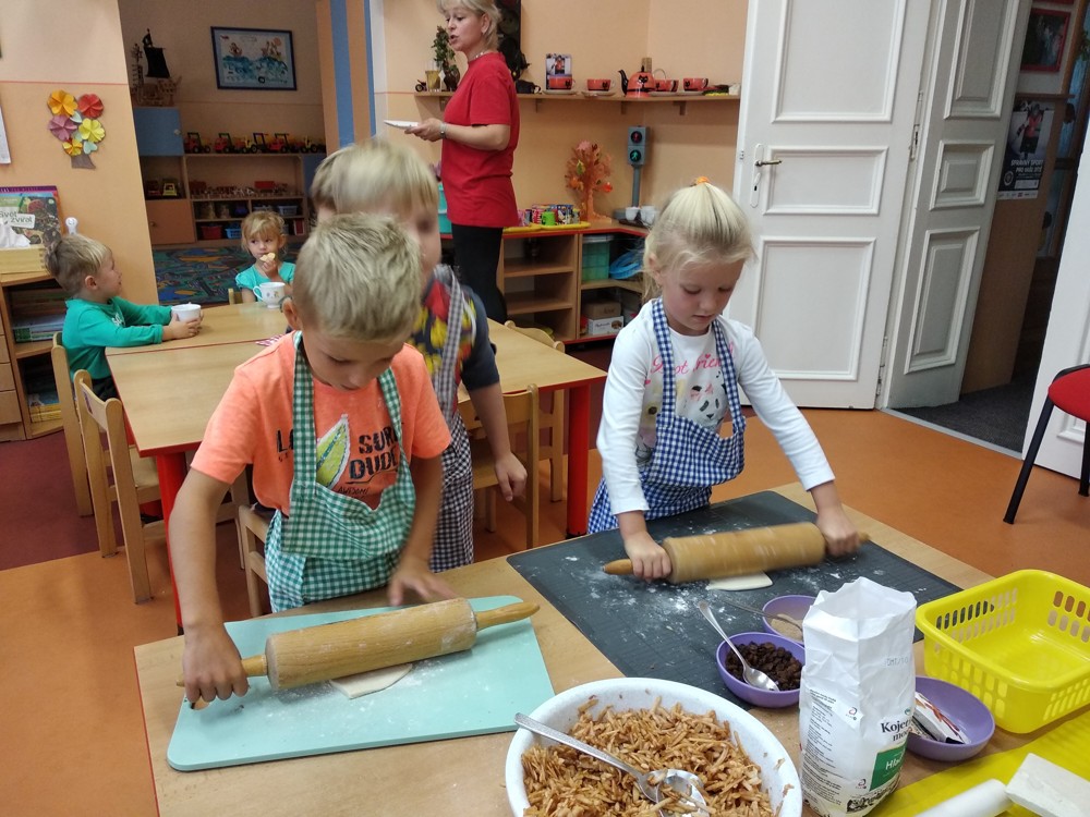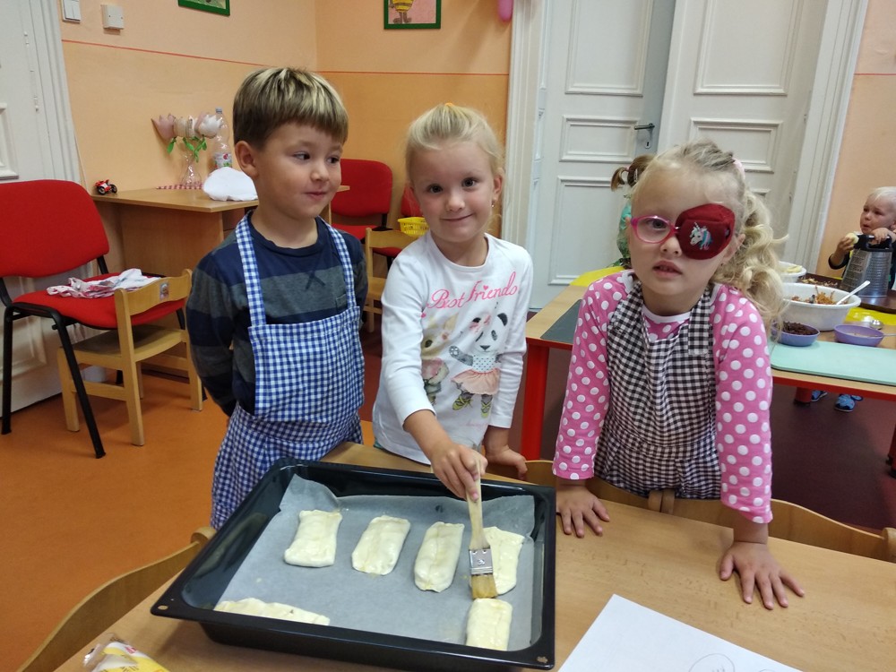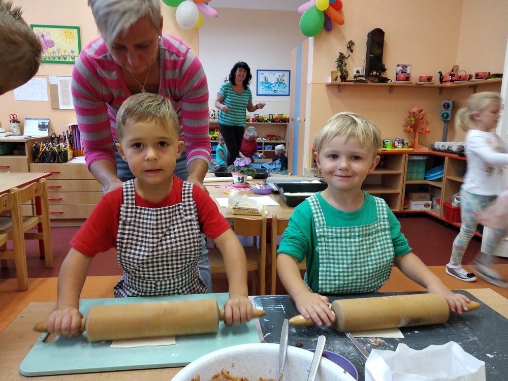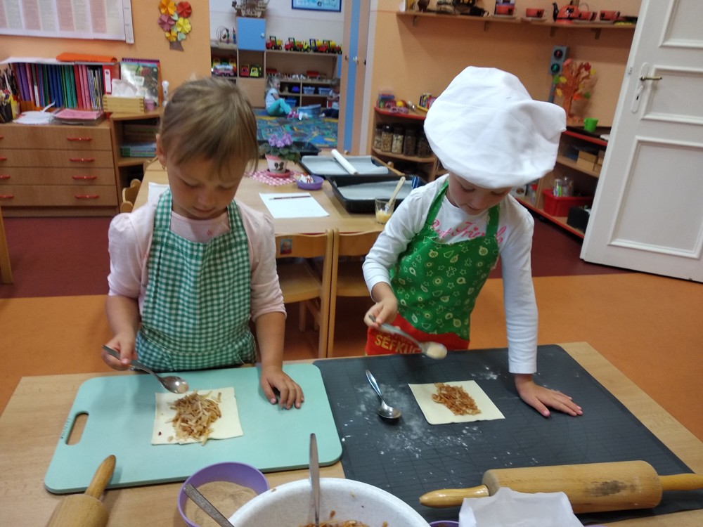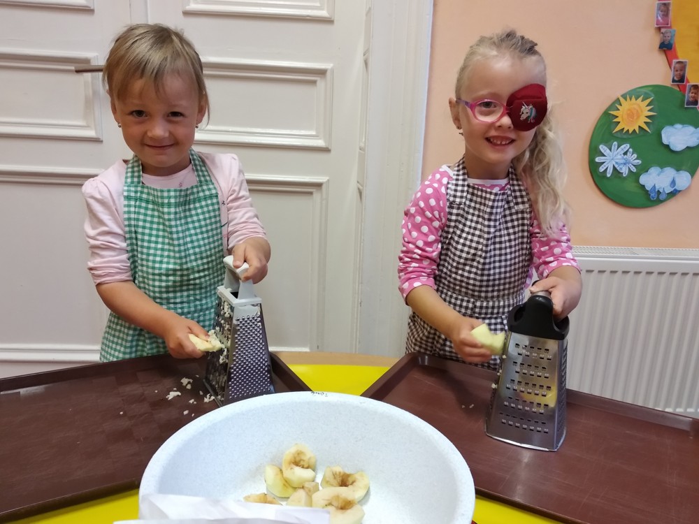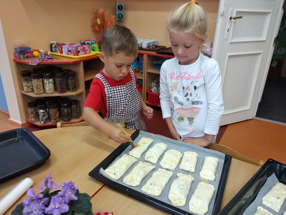 Přichází podzim a na naší školní zahrádce dozrávají jablíčka. S dětmi jsme je nasbírali, ve školce si s nimi hráli, počítali, zpívali, malovali jsme je a dnes je děti krájely, strouhaly a plnily do malých štrúdlíků. Děti byly moc šikovné a na svých výtvorech si doma s rodiči určitě moc pochutnaly.