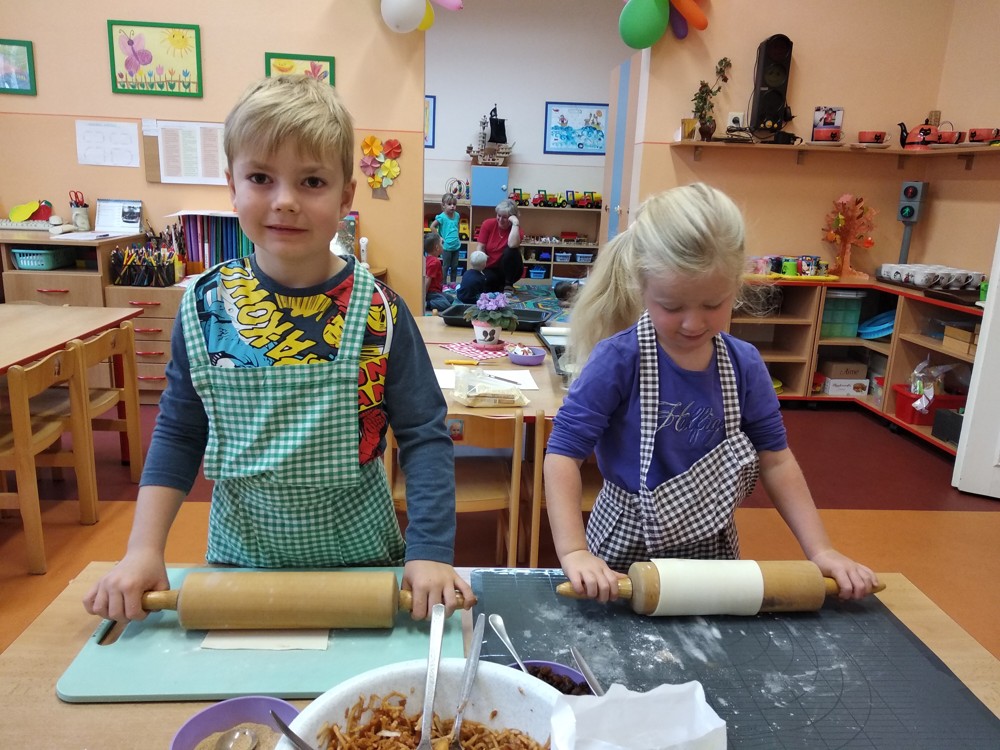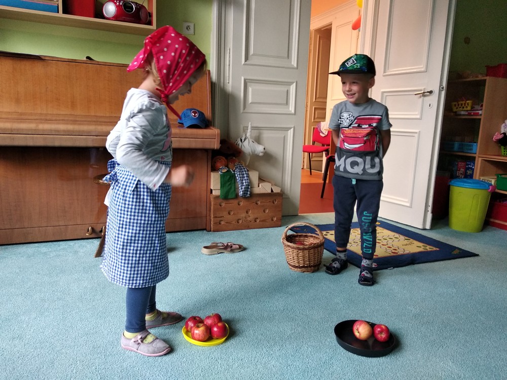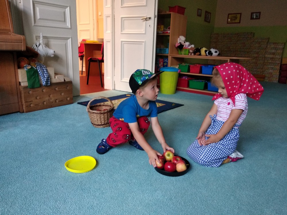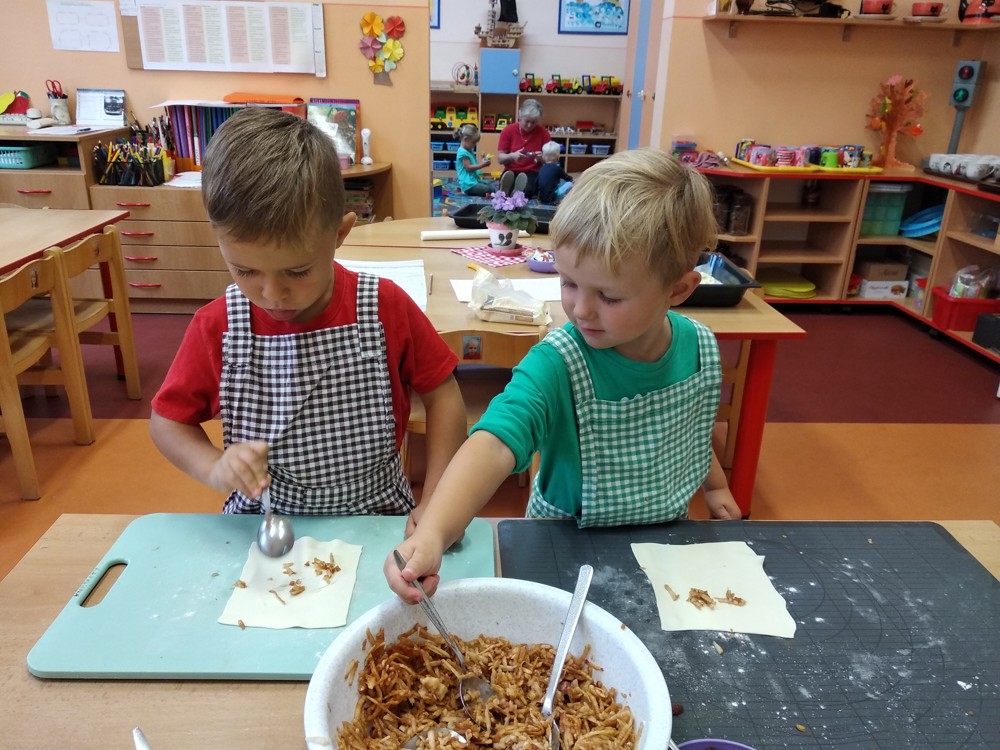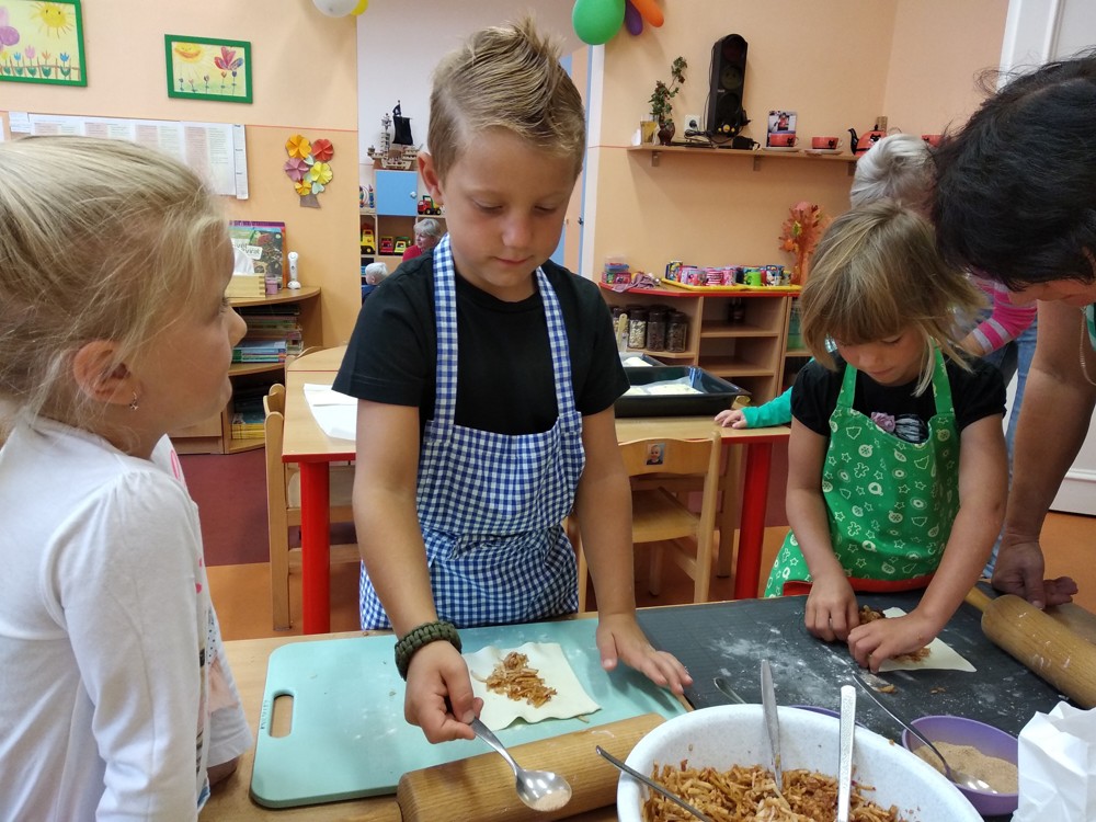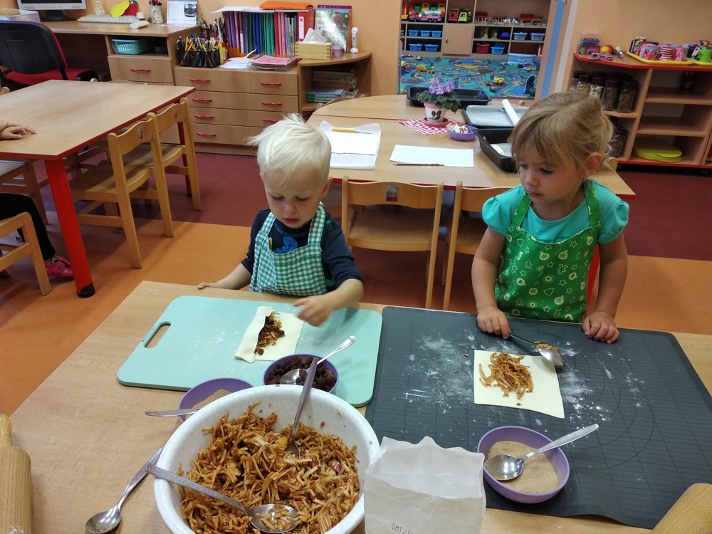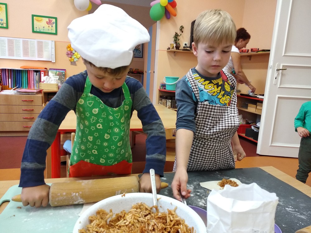 Přichází podzim a na naší školní zahrádce dozrávají jablíčka. S dětmi jsme je nasbírali, ve školce si s nimi hráli, počítali, zpívali, malovali jsme je a dnes je děti krájely, strouhaly a plnily do malých štrúdlíků. Děti byly moc šikovné a na svých výtvorech si doma s rodiči určitě moc pochutnaly.