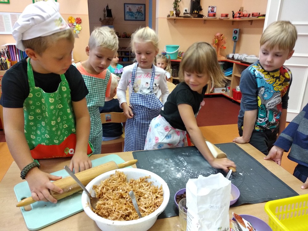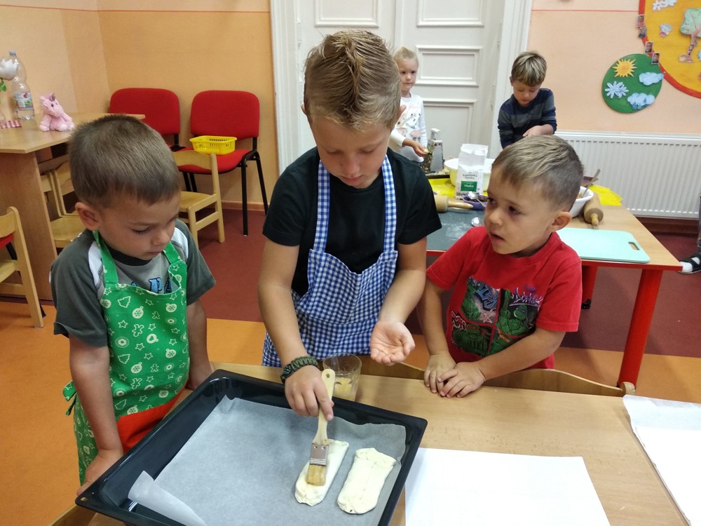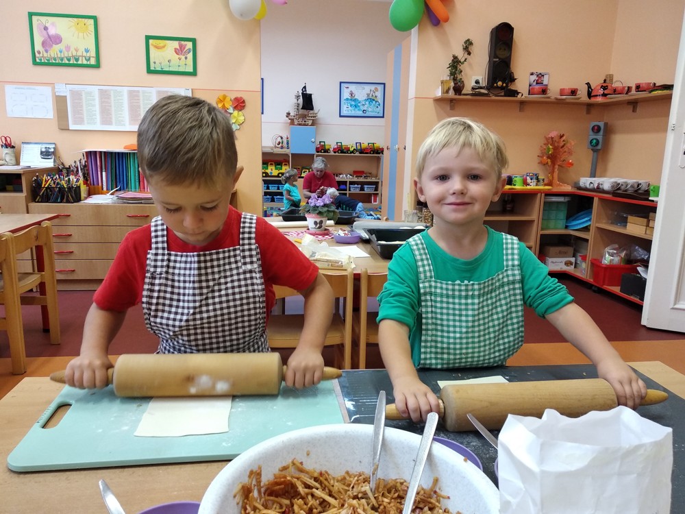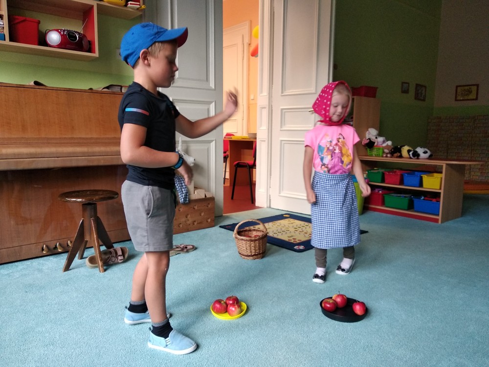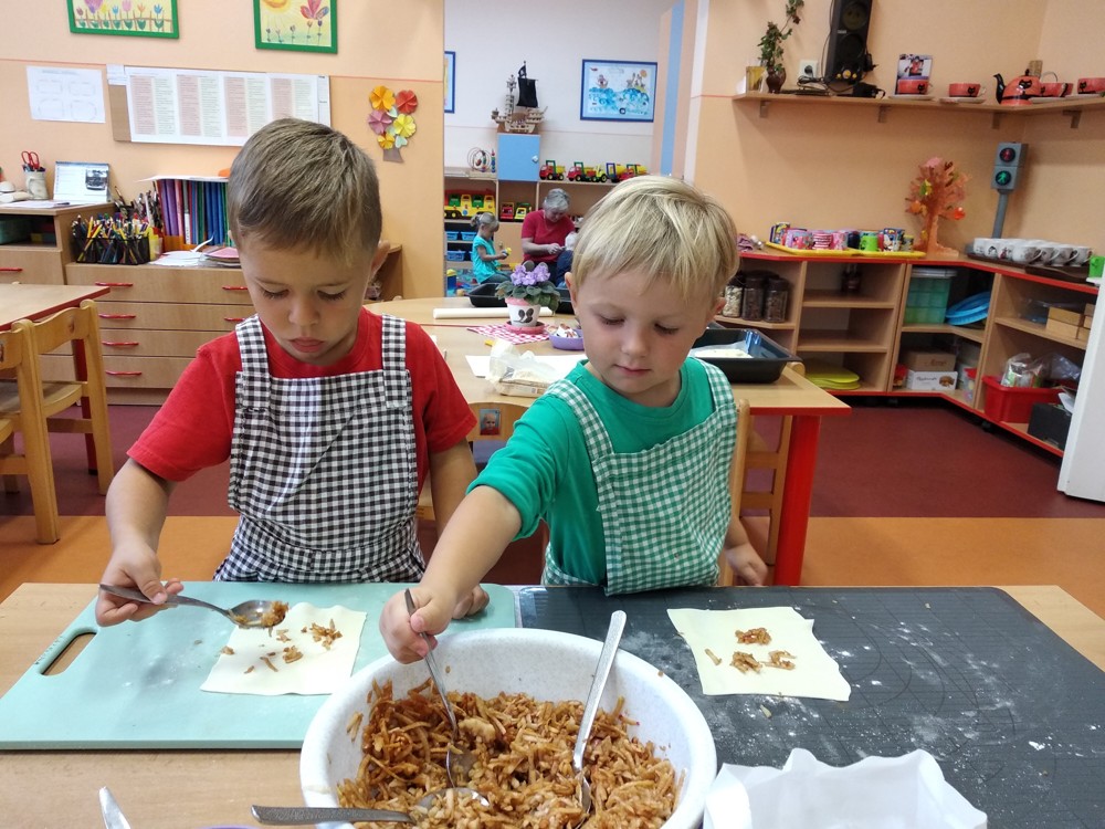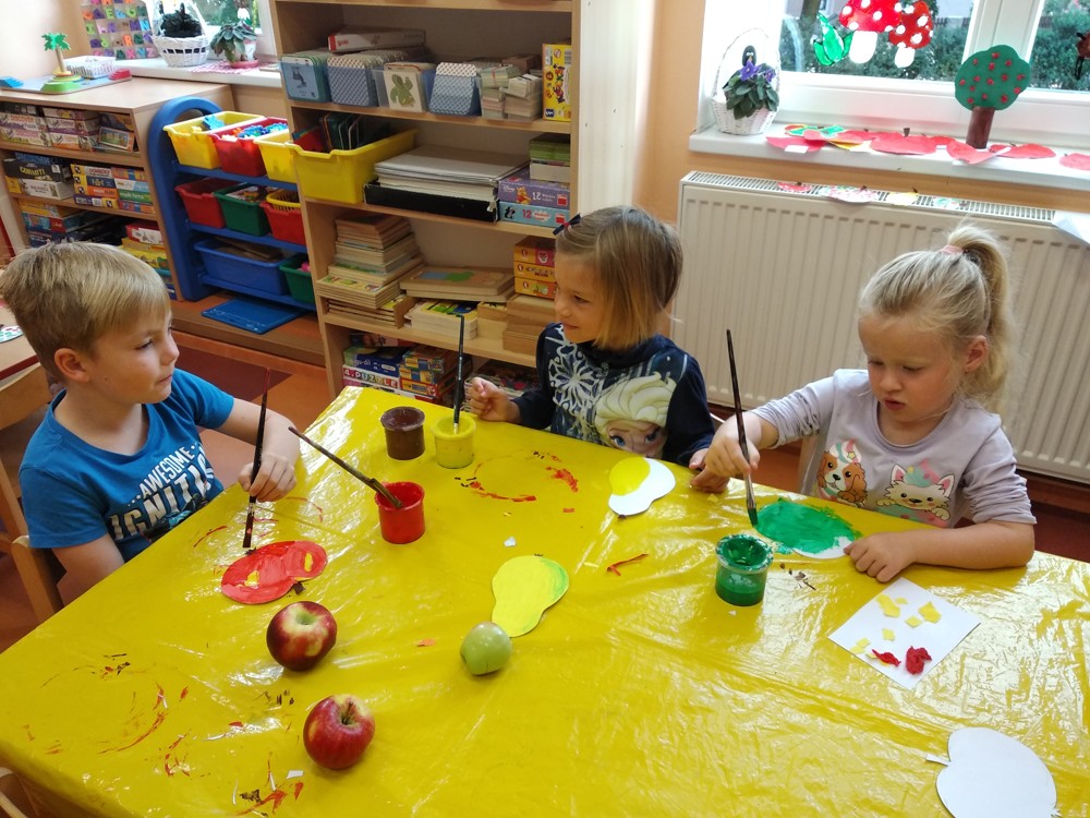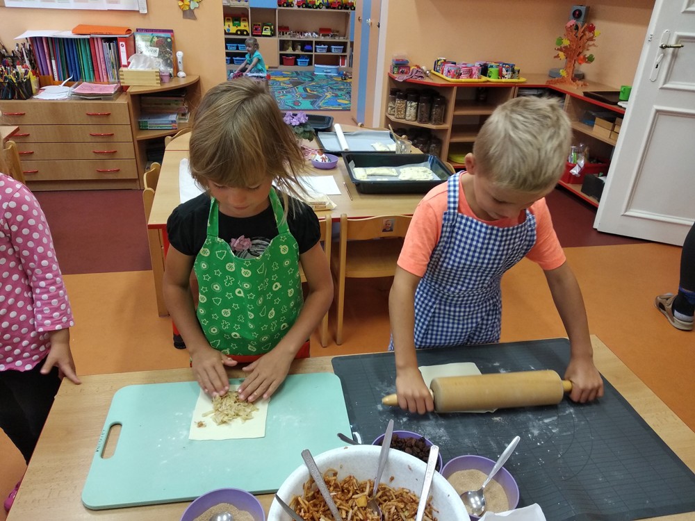 Přichází podzim a na naší školní zahrádce dozrávají jablíčka. S dětmi jsme je nasbírali, ve školce si s nimi hráli, počítali, zpívali, malovali jsme je a dnes je děti krájely, strouhaly a plnily do malých štrúdlíků. Děti byly moc šikovné a na svých výtvorech si doma s rodiči určitě moc pochutnaly.