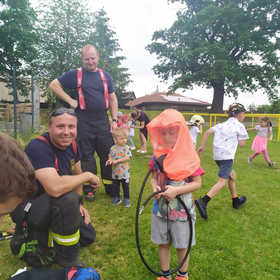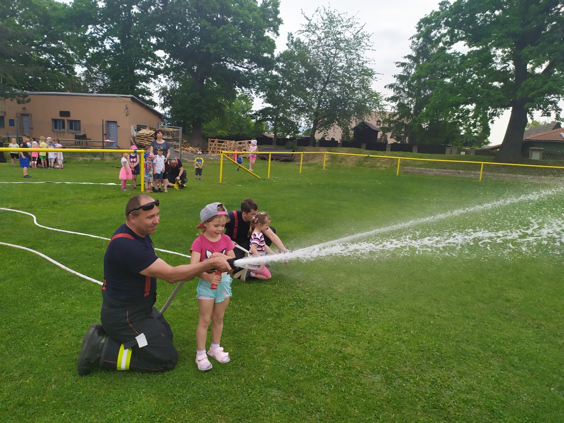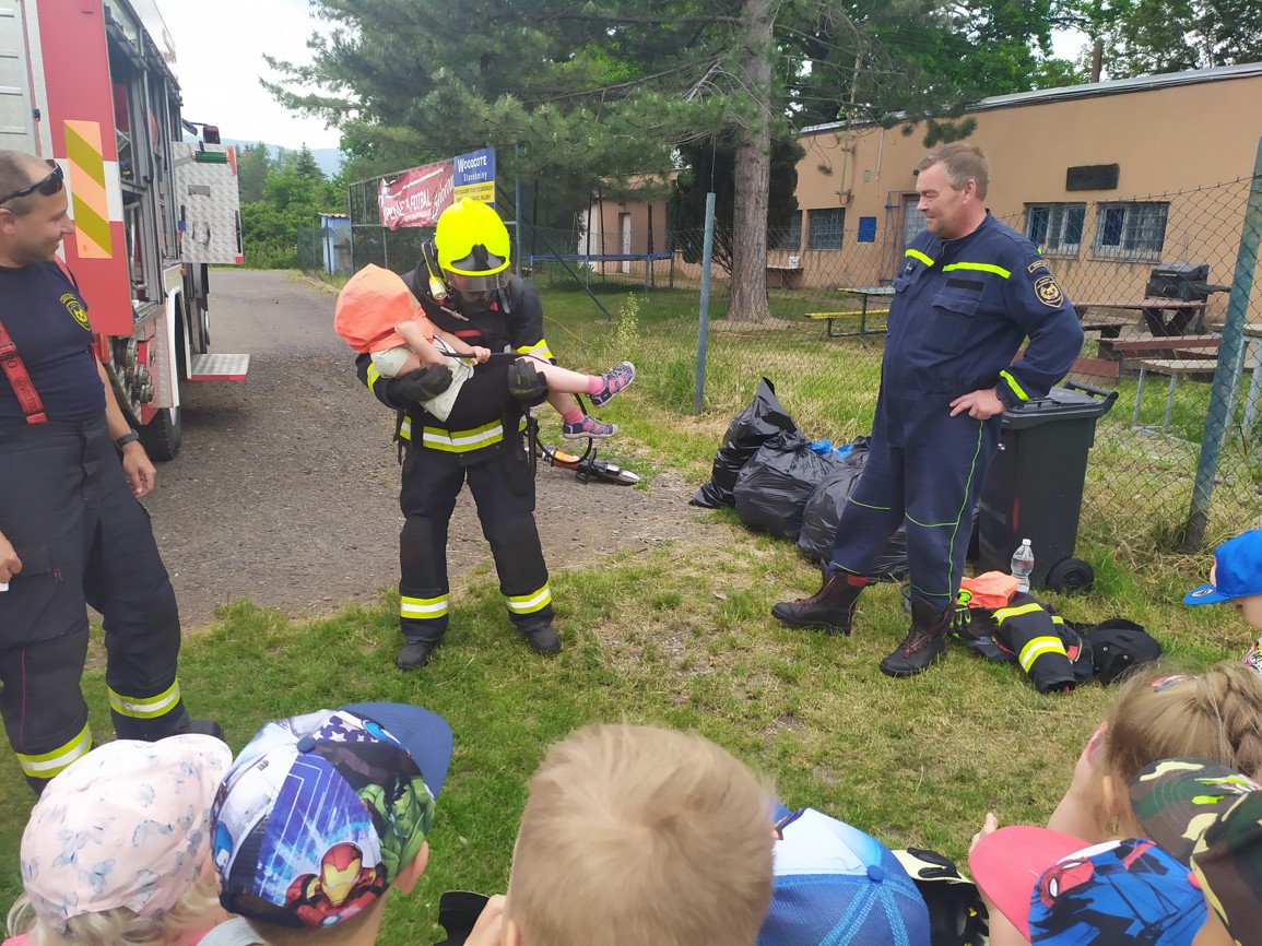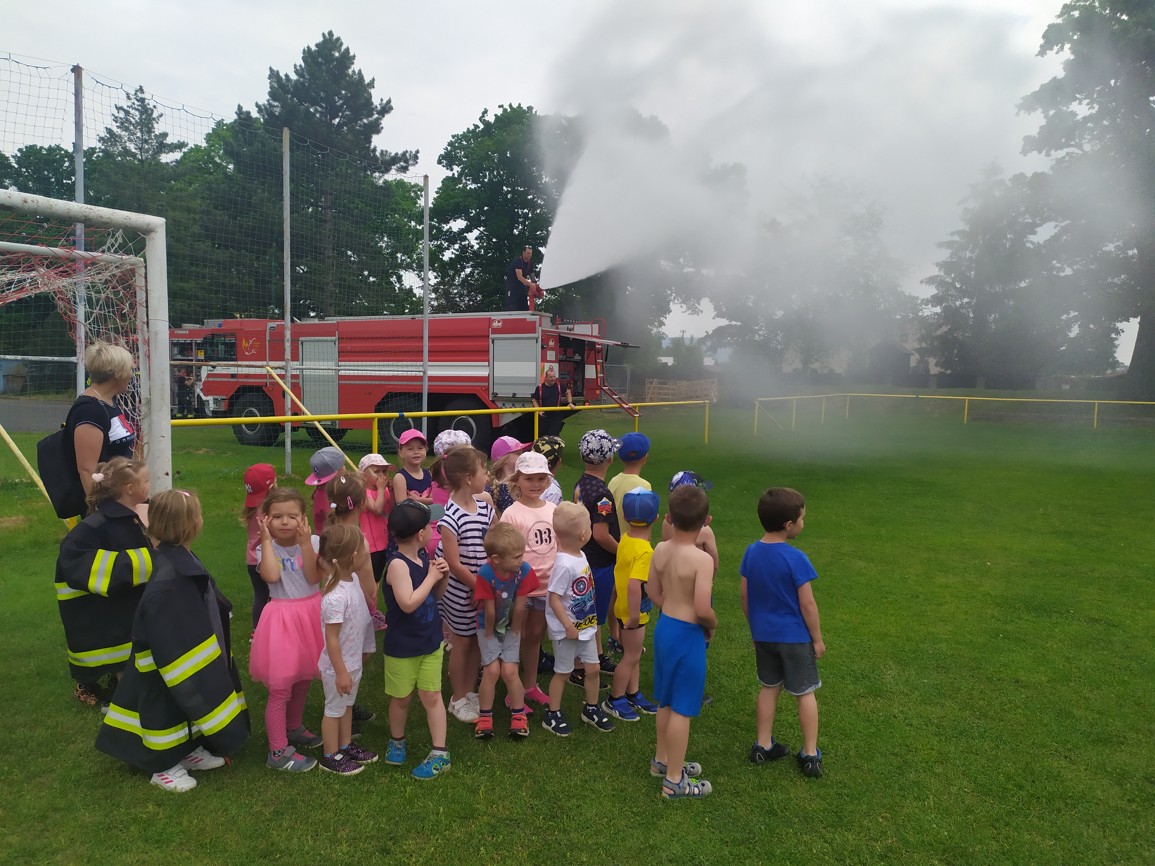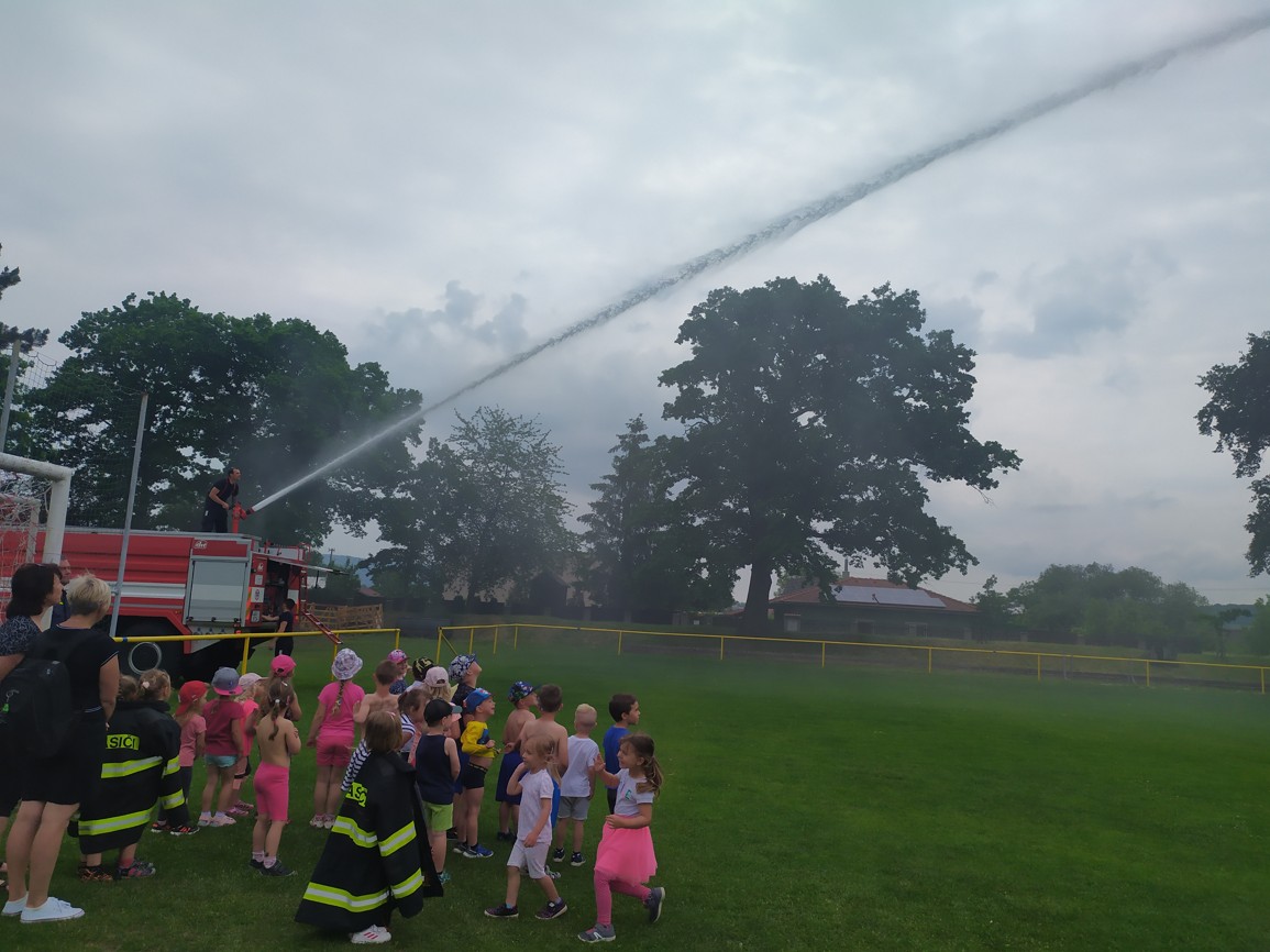 Děti mohly vidět, co si hasič obléká, když vyjíždí k požáru, jak zachraňuje osoby ze zakouřeného prostředí, jak vypadá požární auto uvnitř, ale nejvíce se jim líbilo, když si mohly vyzkoušet hašení pomyslného požáru. Sice jsme se trochu namočili, ale běh přes celé hřiště a hasičská bunda nás trochu zahřála a sluníčko osušilo. Moc děkujeme za návštěvu a už se těšíme zase příště.