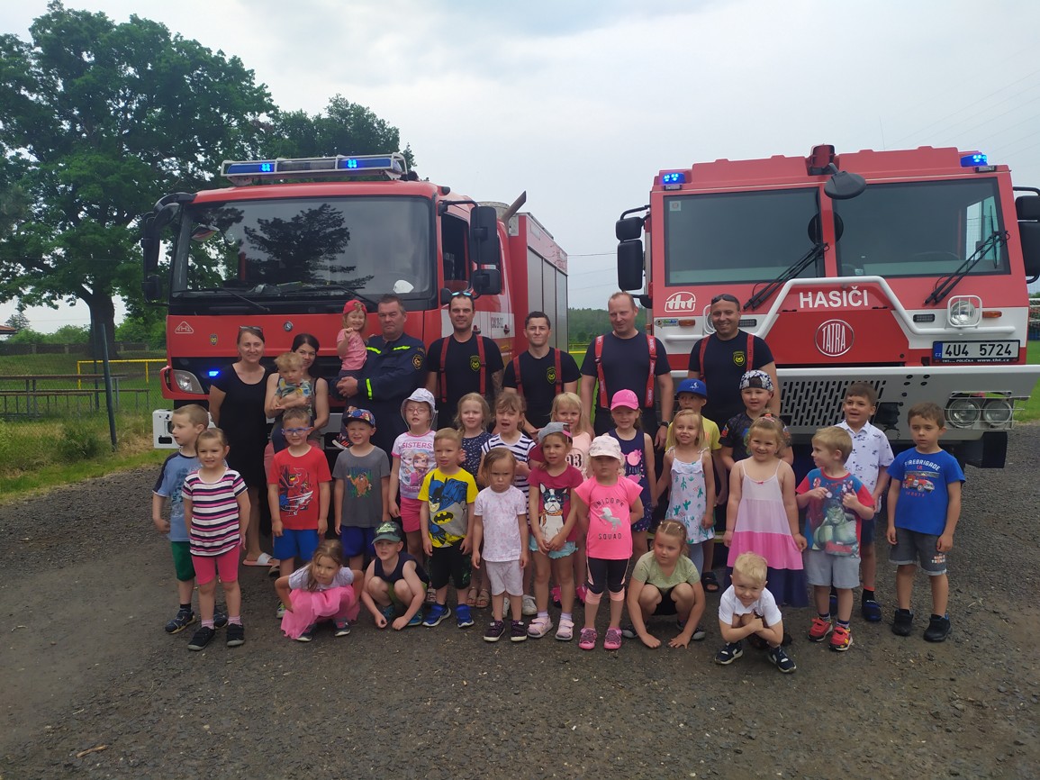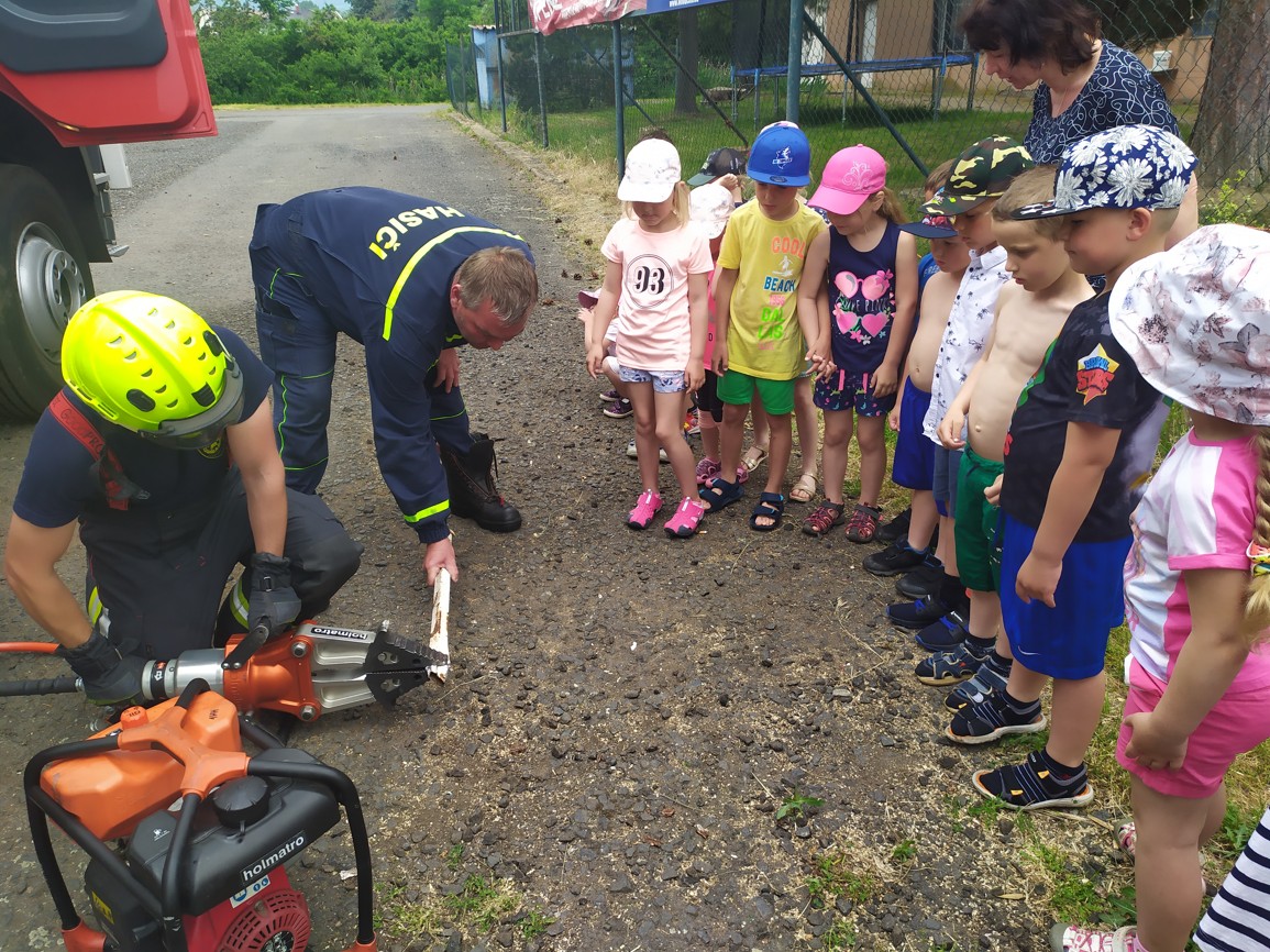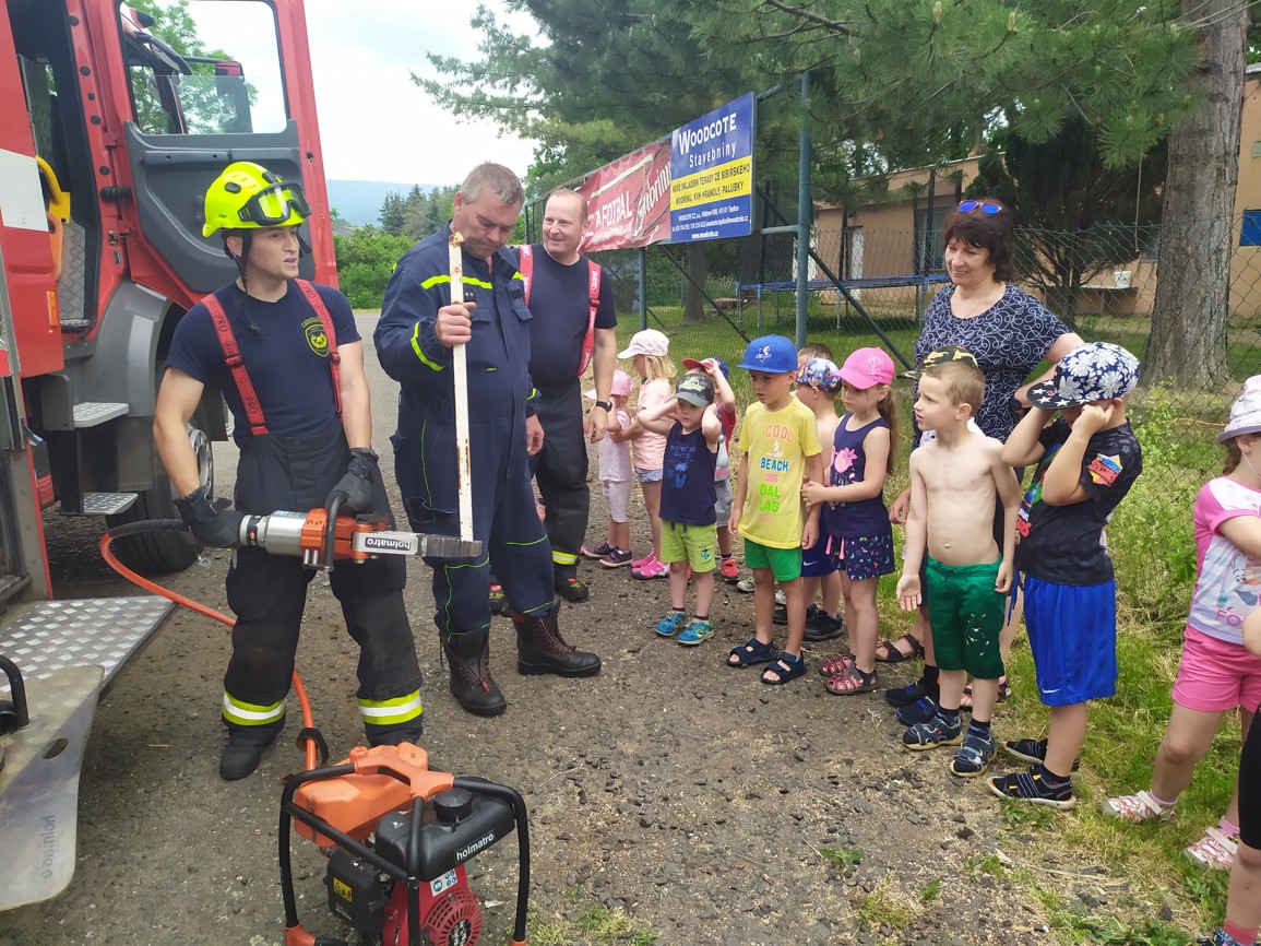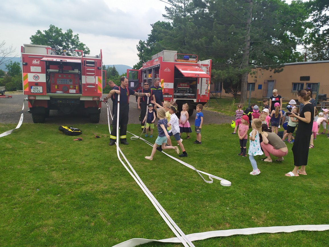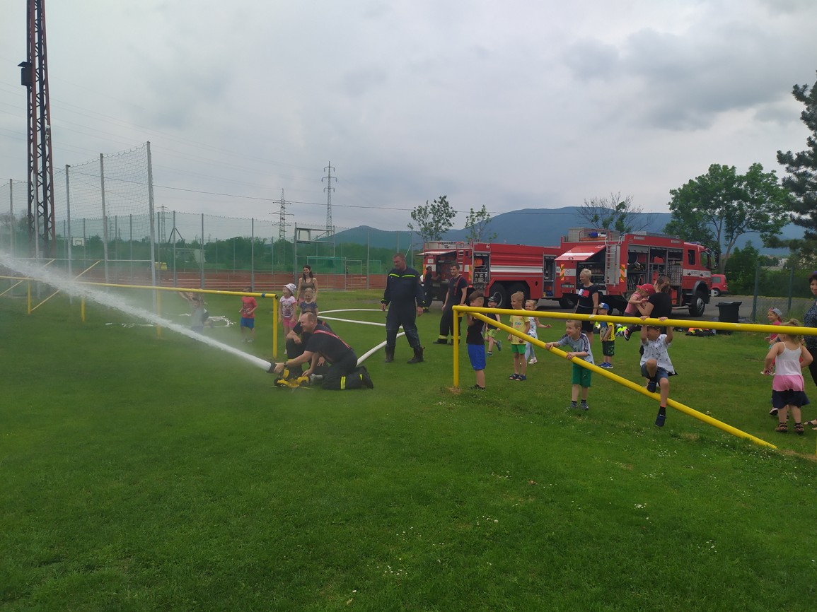 Děti mohly vidět, co si hasič obléká, když vyjíždí k požáru, jak zachraňuje osoby ze zakouřeného prostředí, jak vypadá požární auto uvnitř, ale nejvíce se jim líbilo, když si mohly vyzkoušet hašení pomyslného požáru. Sice jsme se trochu namočili, ale běh přes celé hřiště a hasičská bunda nás trochu zahřála a sluníčko osušilo. Moc děkujeme za návštěvu a už se těšíme zase příště.