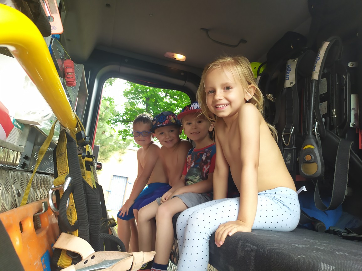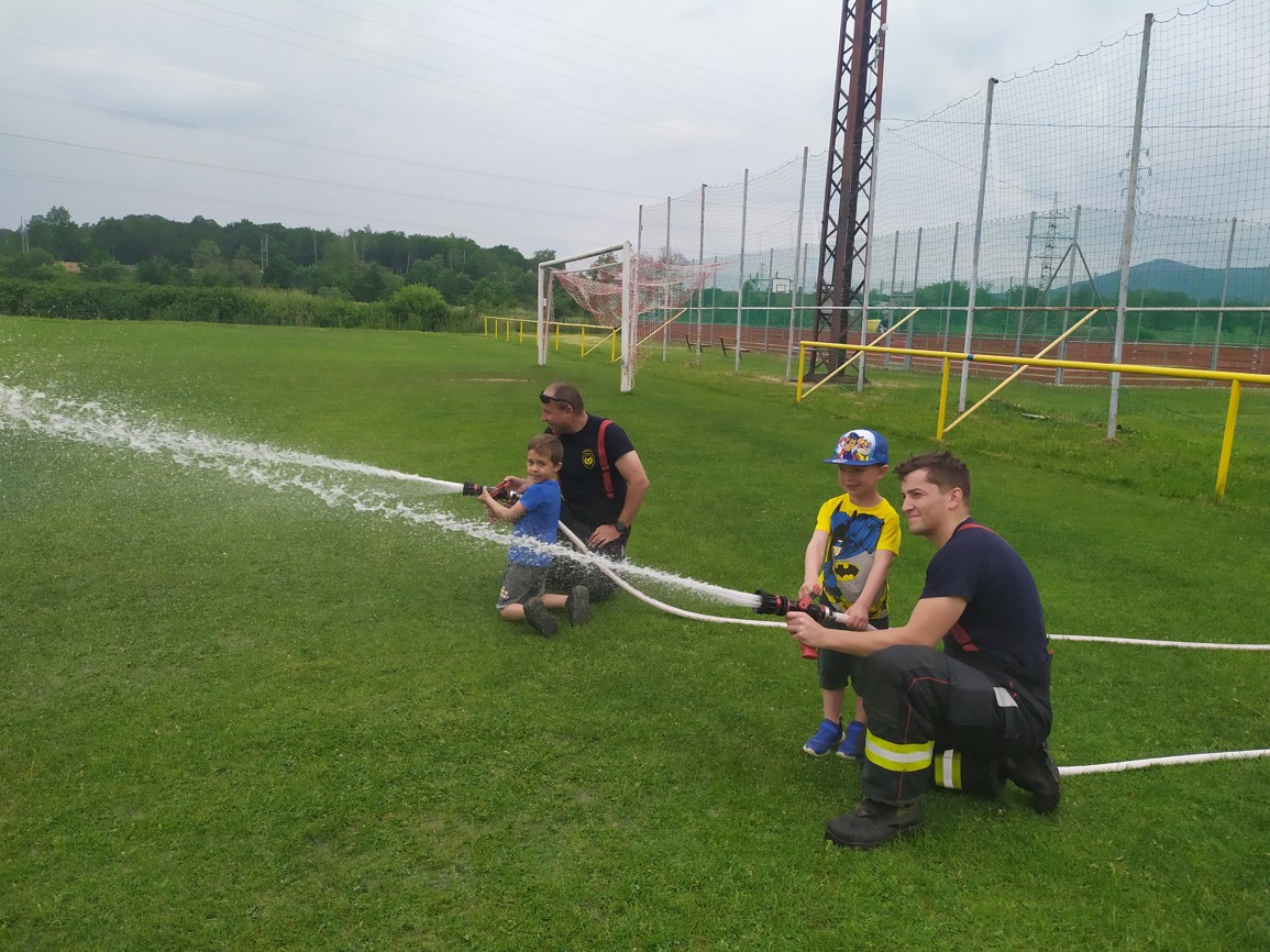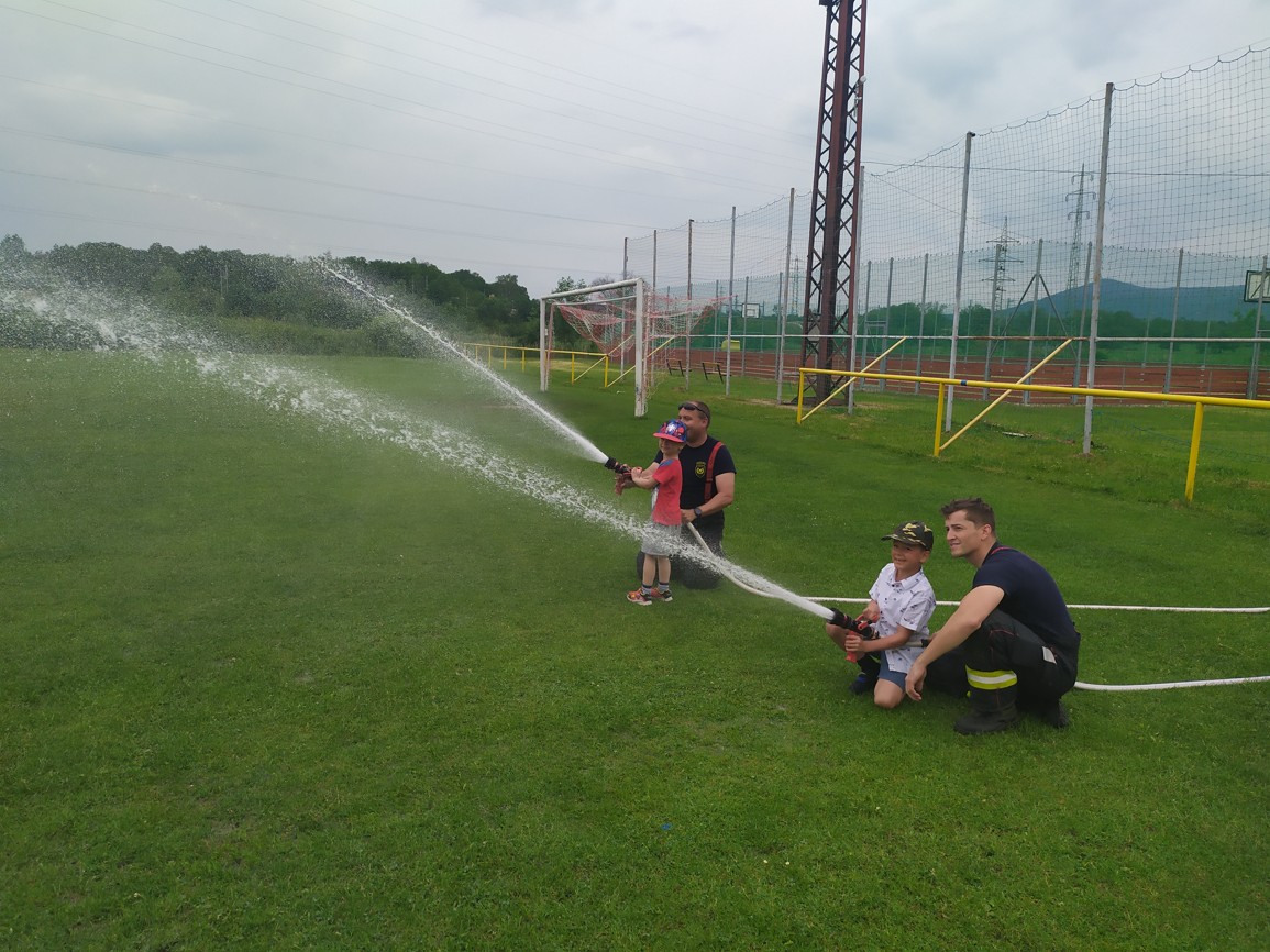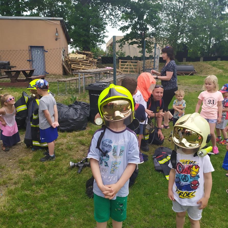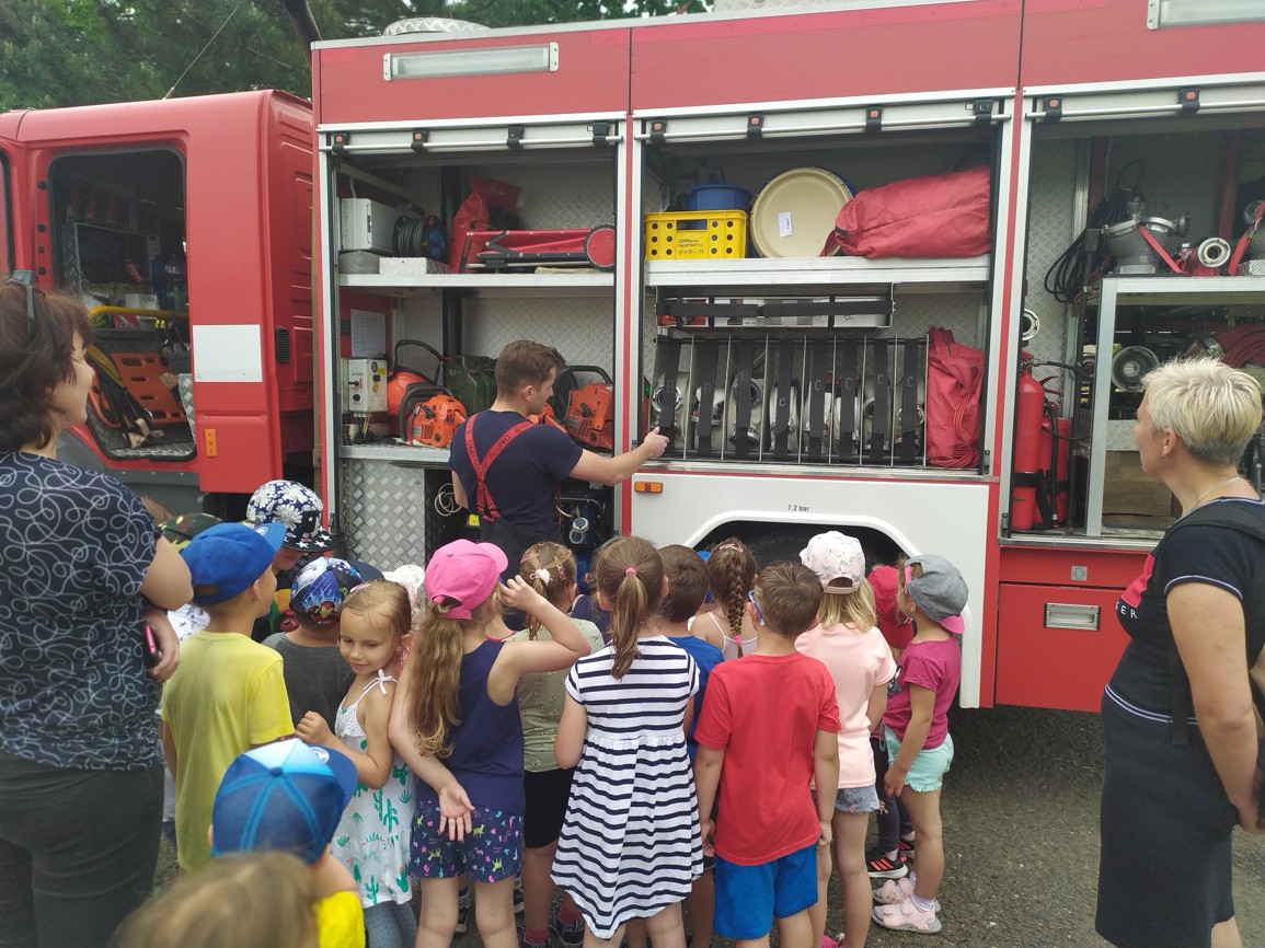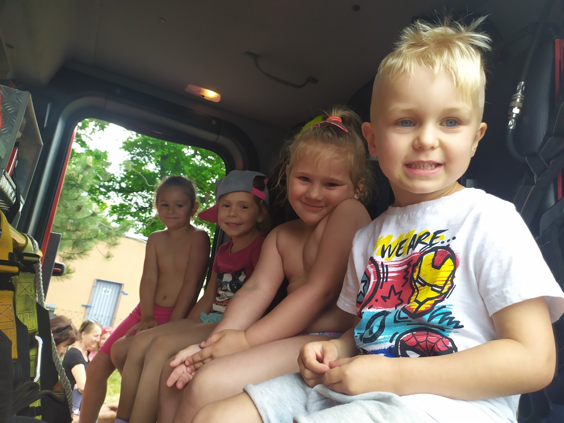 Děti mohly vidět, co si hasič obléká, když vyjíždí k požáru, jak zachraňuje osoby ze zakouřeného prostředí, jak vypadá požární auto uvnitř, ale nejvíce se jim líbilo, když si mohly vyzkoušet hašení pomyslného požáru. Sice jsme se trochu namočili, ale běh přes celé hřiště a hasičská bunda nás trochu zahřála a sluníčko osušilo. Moc děkujeme za návštěvu a už se těšíme zase příště.