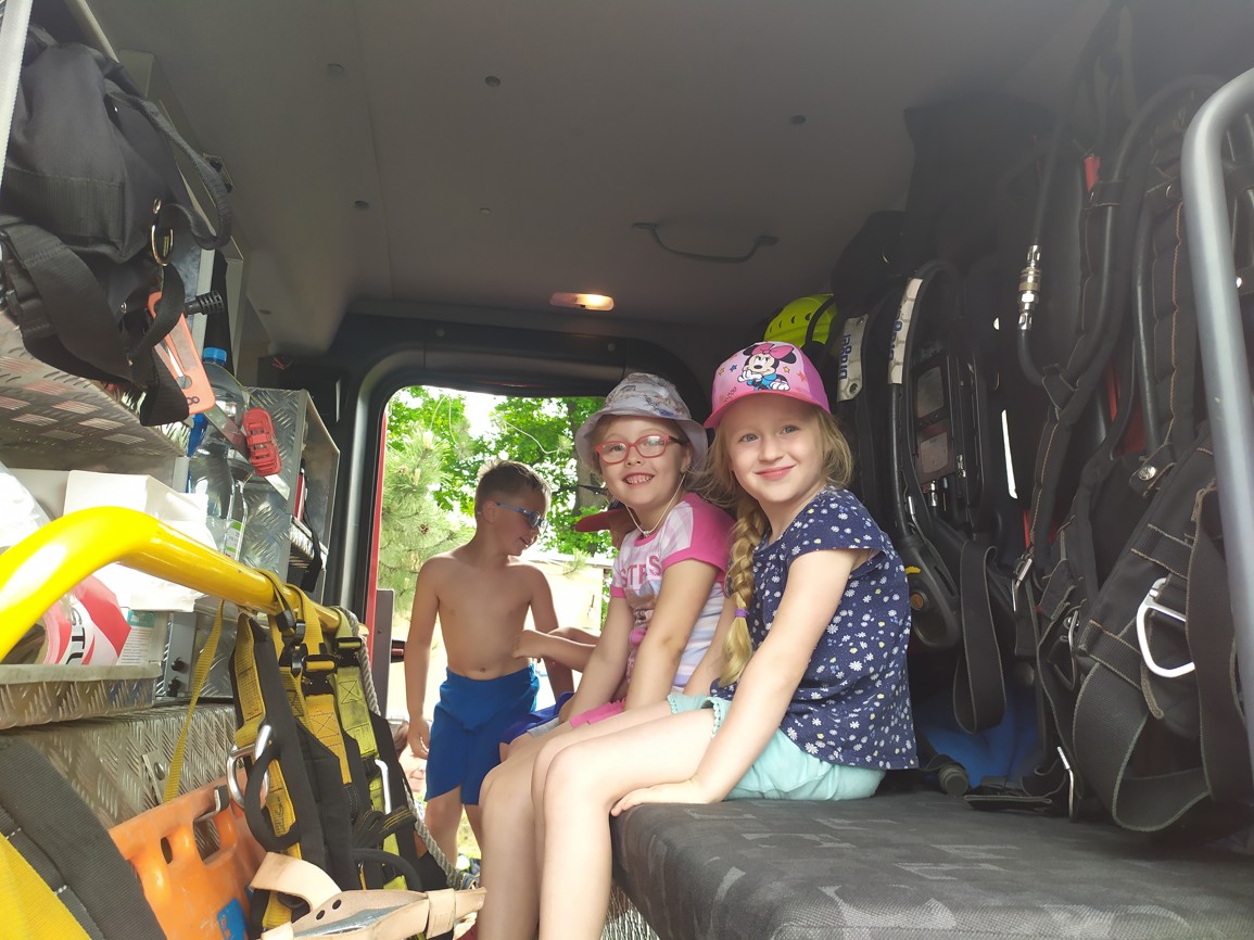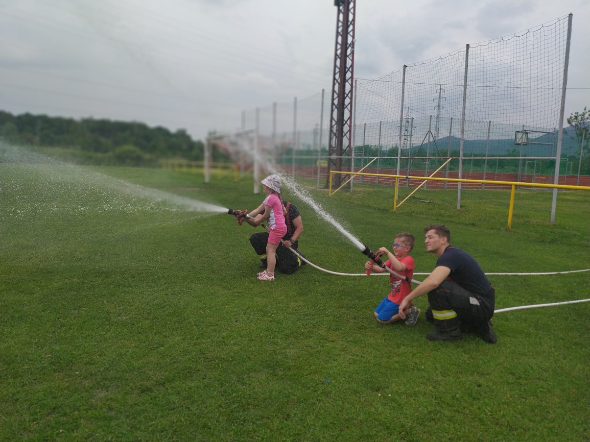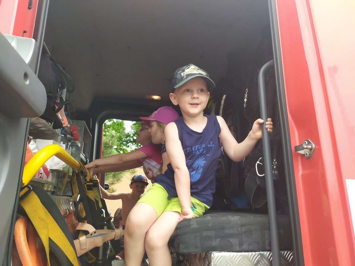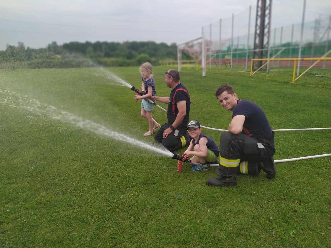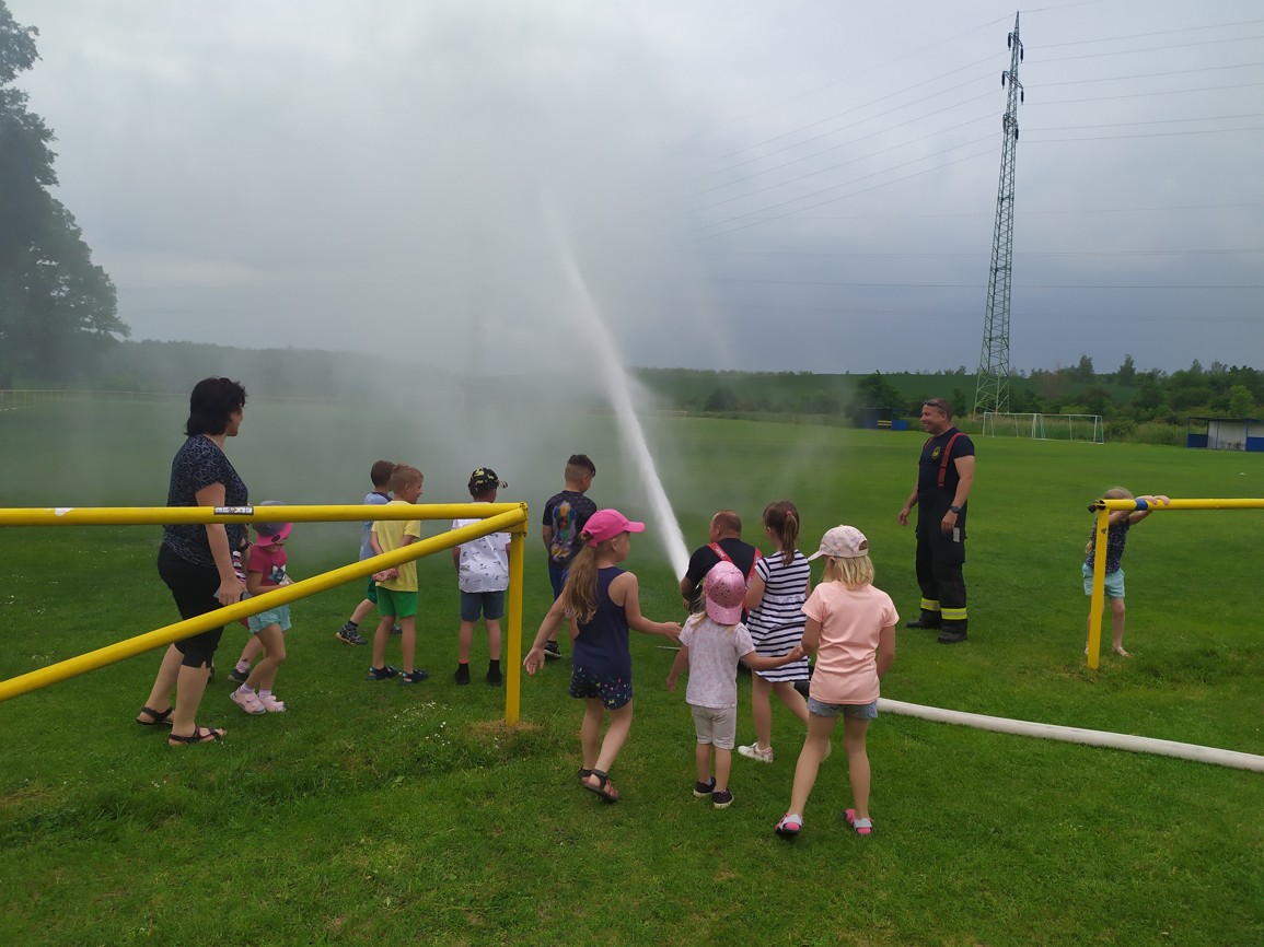 Děti mohly vidět, co si hasič obléká, když vyjíždí k požáru, jak zachraňuje osoby ze zakouřeného prostředí, jak vypadá požární auto uvnitř, ale nejvíce se jim líbilo, když si mohly vyzkoušet hašení pomyslného požáru. Sice jsme se trochu namočili, ale běh přes celé hřiště a hasičská bunda nás trochu zahřála a sluníčko osušilo. Moc děkujeme za návštěvu a už se těšíme zase příště.