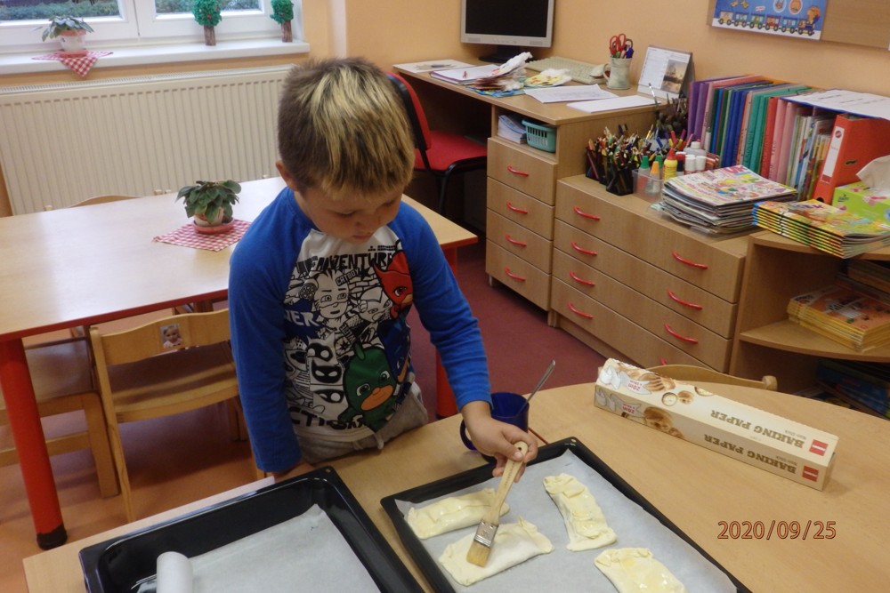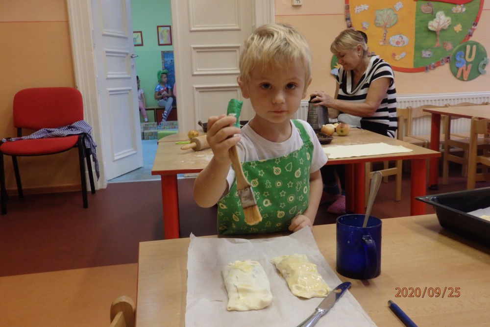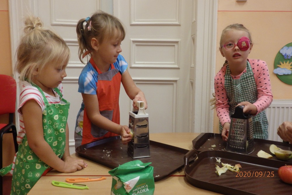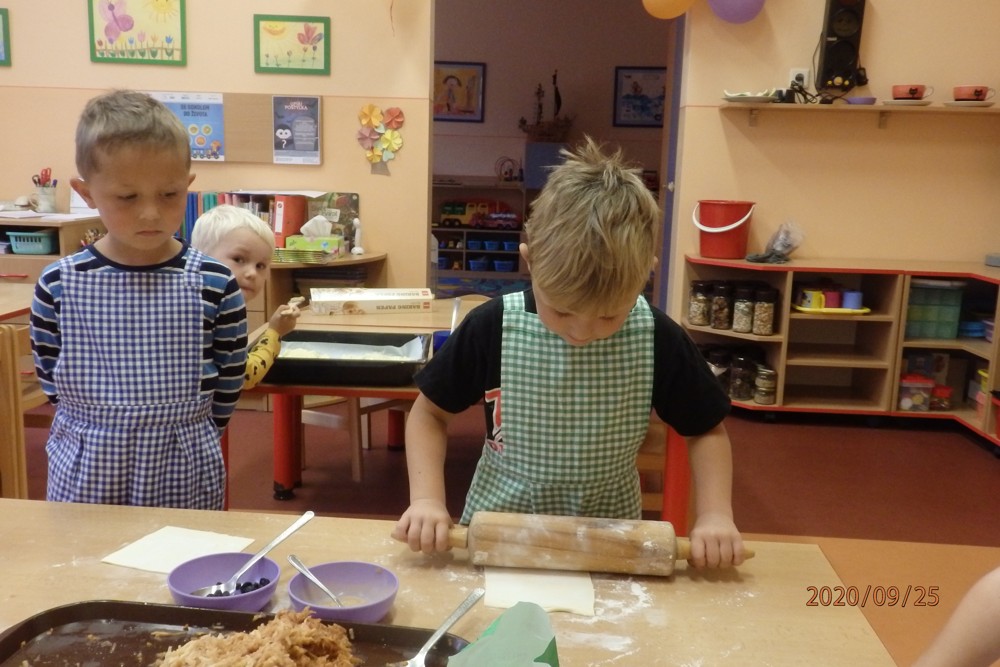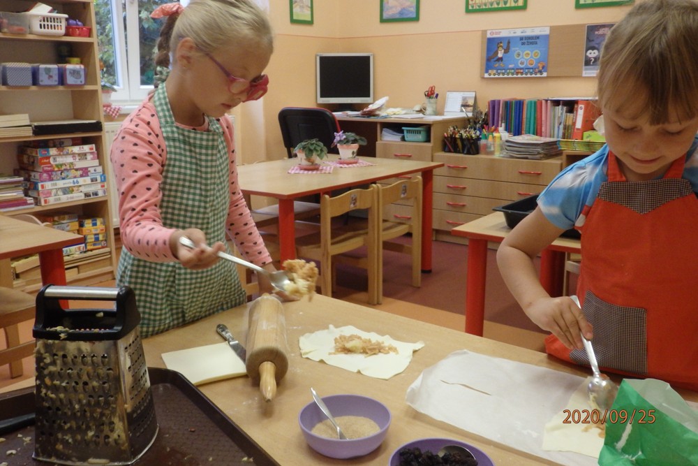 Děti si totiž upekly štrúdlíky z jablíček, která si nasbíraly na školní zahradě. Potom už jen stačilo obléknout si zástěry, jablíčka omýt, oloupat, nastrouhat, pořádně si umýt ruce a jde se na to. Děti byly moc šikovné a moučník se jim moc povedl. Určitě si na něm doma moc pochutnaly a snad daly ochutnat i rodičům.
