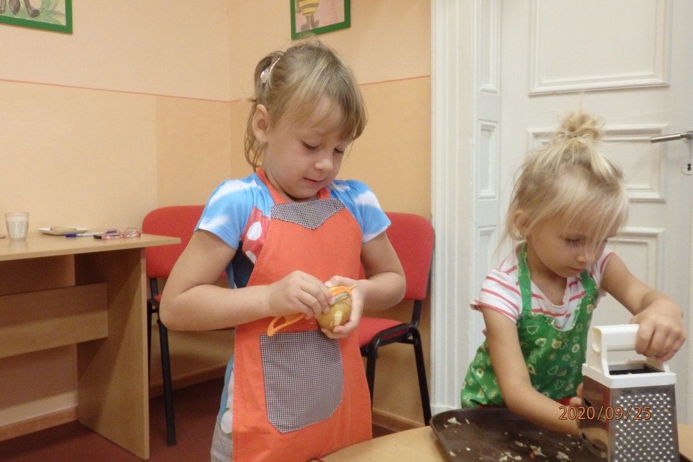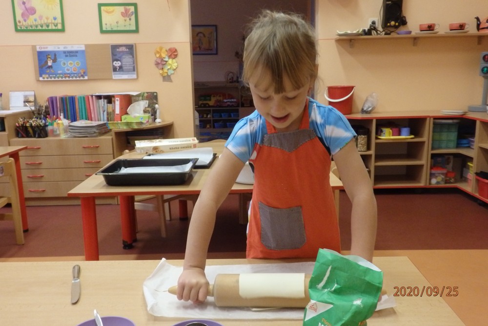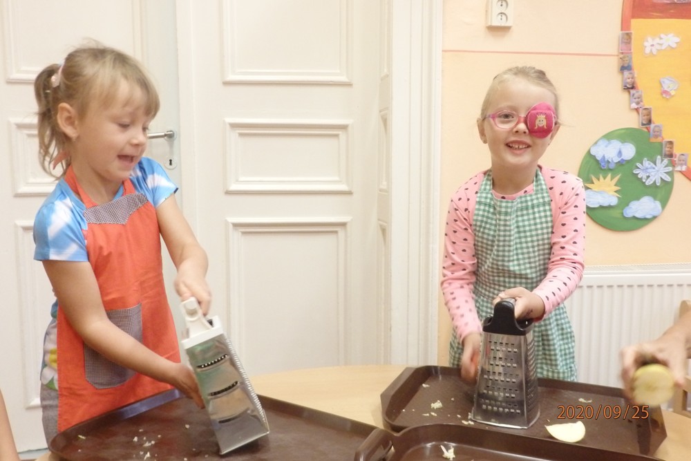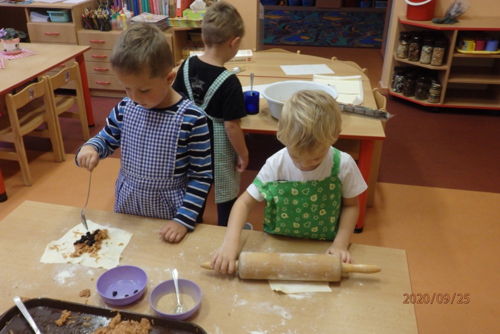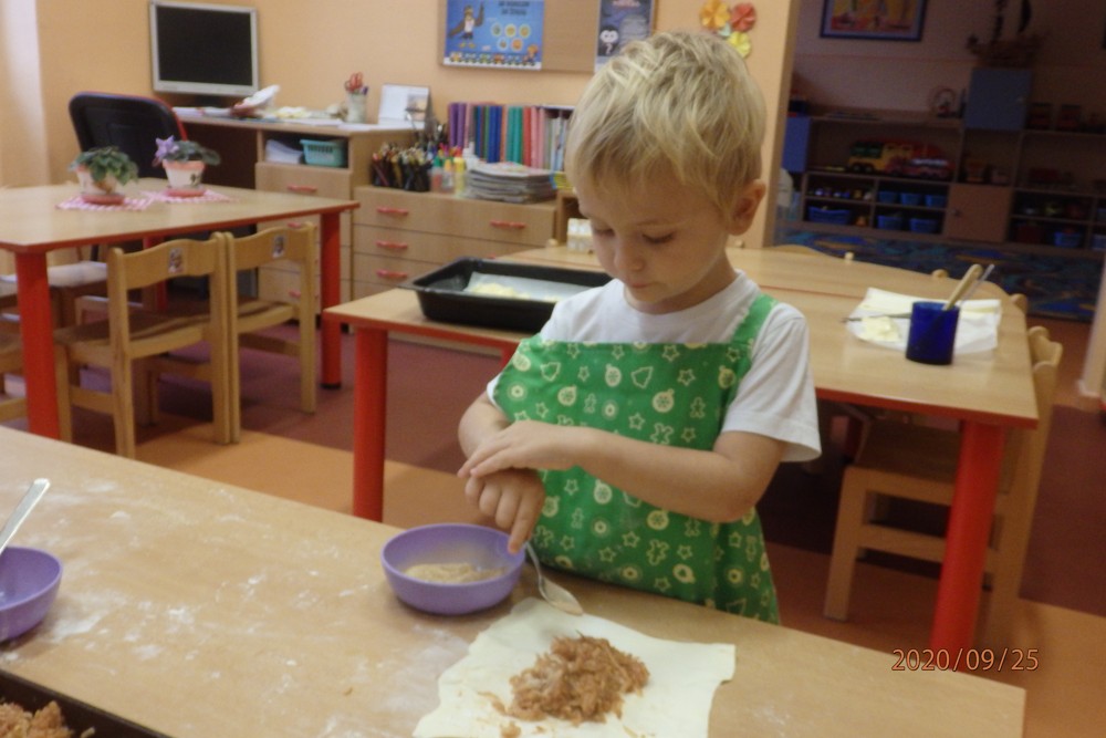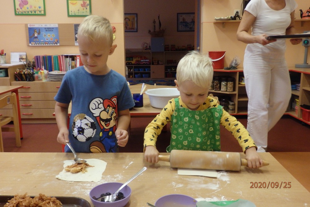 Děti si totiž upekly štrúdlíky z jablíček, která si nasbíraly na školní zahradě. Potom už jen stačilo obléknout si zástěry, jablíčka omýt, oloupat, nastrouhat, pořádně si umýt ruce a jde se na to. Děti byly moc šikovné a moučník se jim moc povedl. Určitě si na něm doma moc pochutnaly a snad daly ochutnat i rodičům.