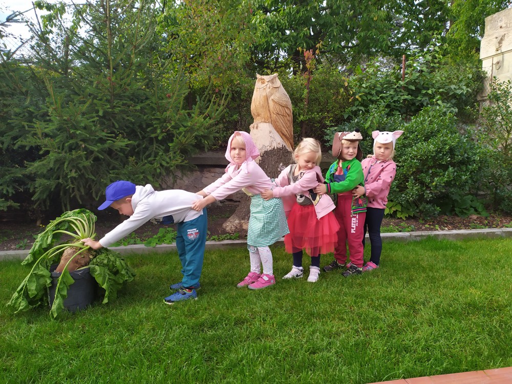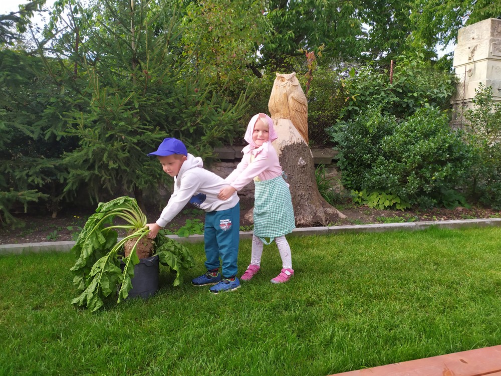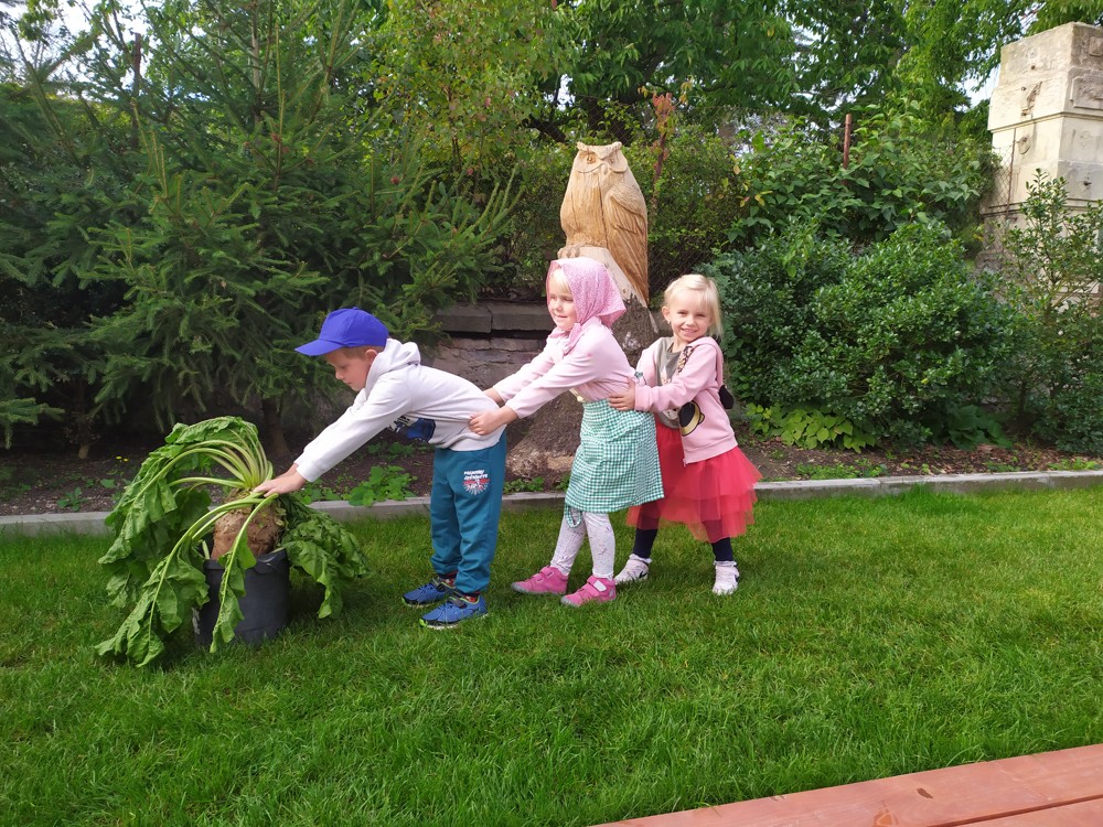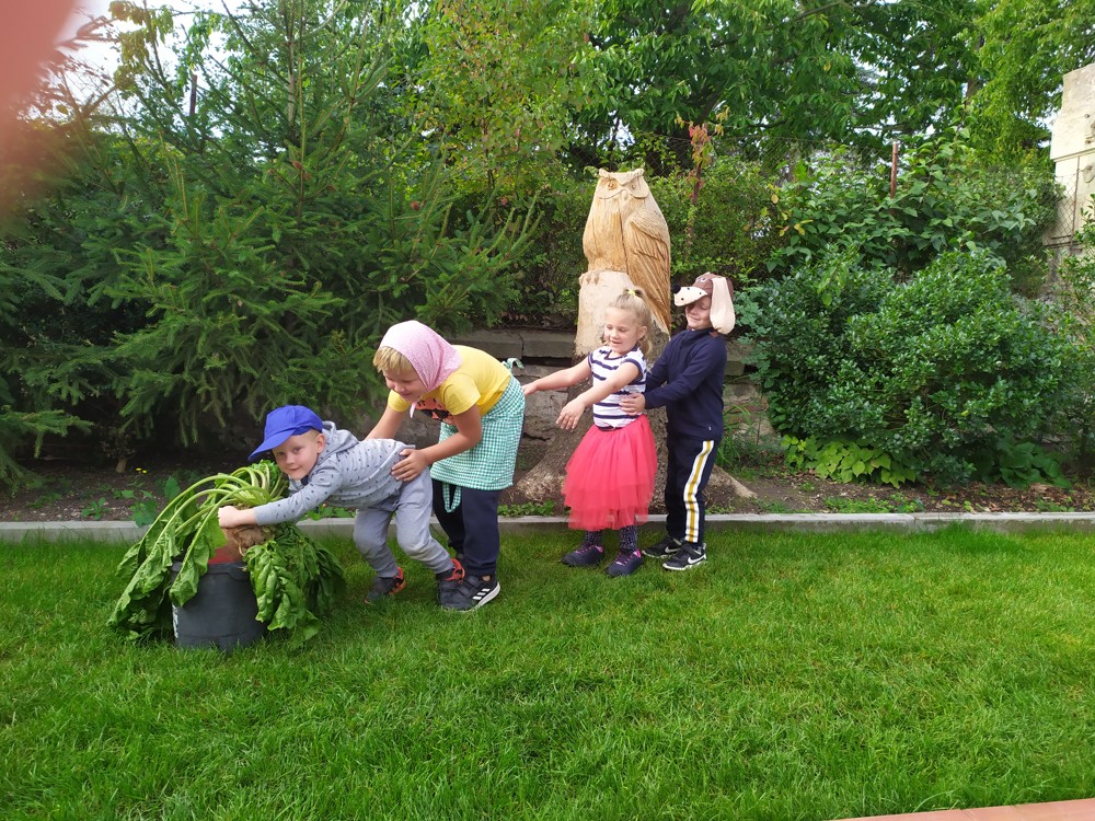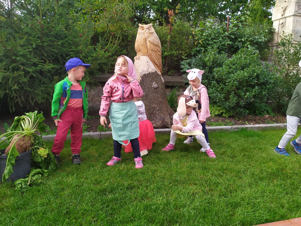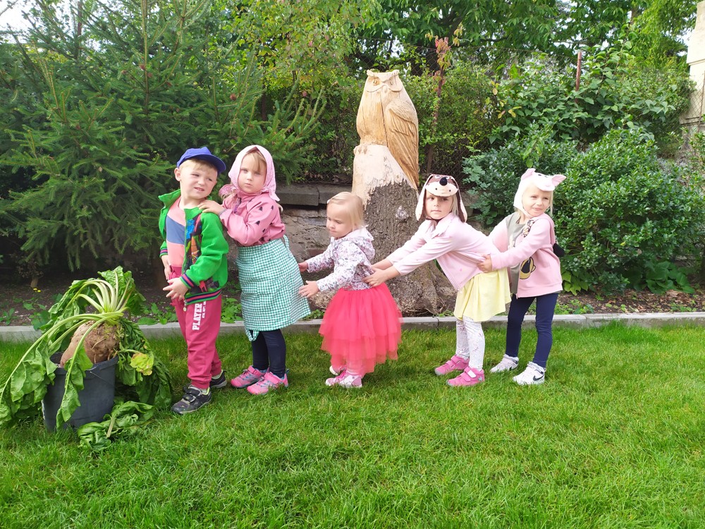 Na zahrádce si děti zahrály v pohádce " O veliké řepě" a líbilo se jim to o to více, že řepa , kterou dědeček nemohl sám vytáhnout, vyrostla na statku, kde jsme byli v srpnu na výletě a děti ji tam mohly vidět růst.