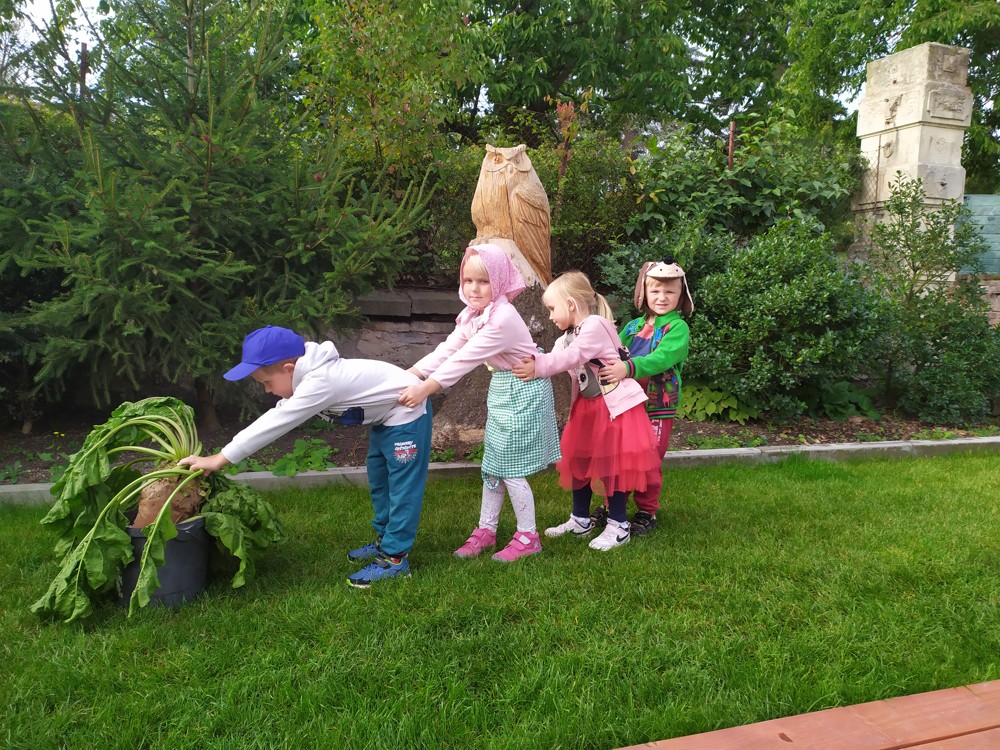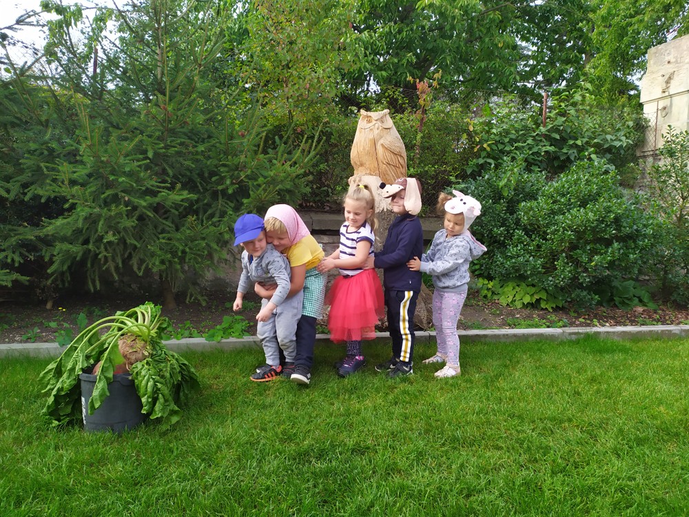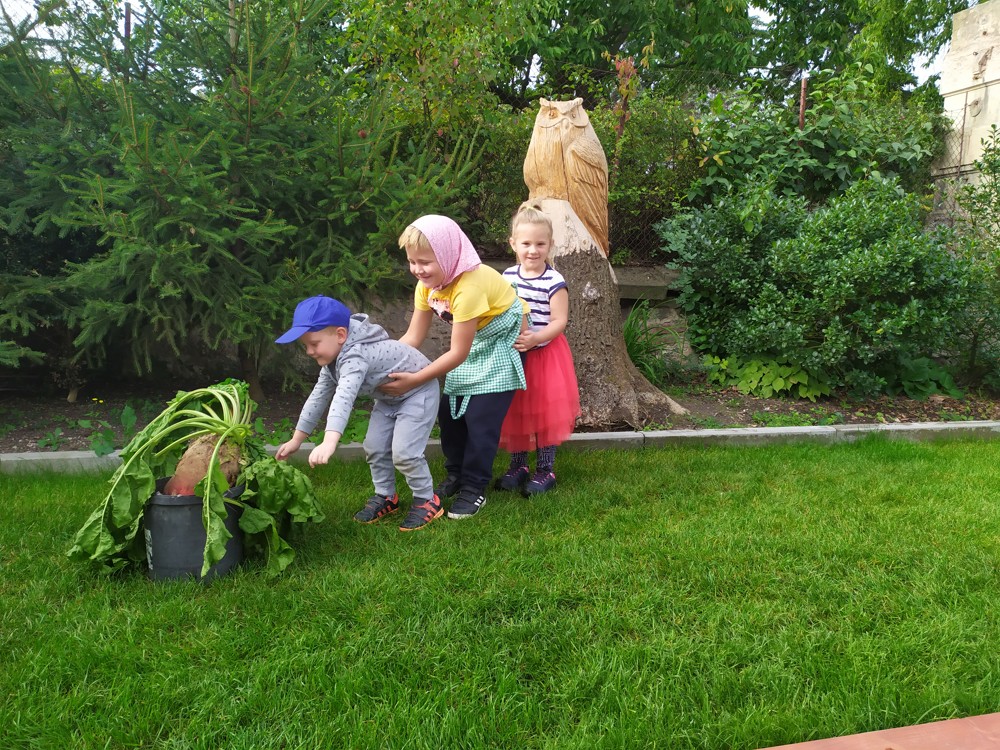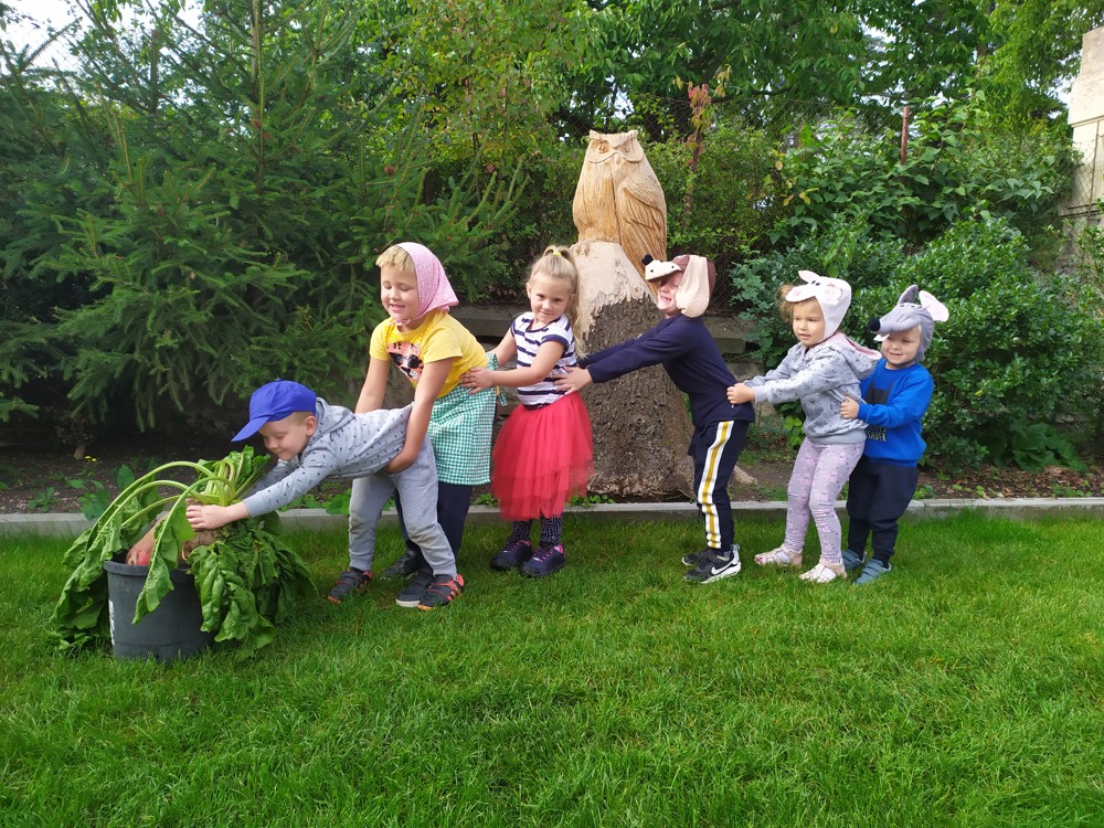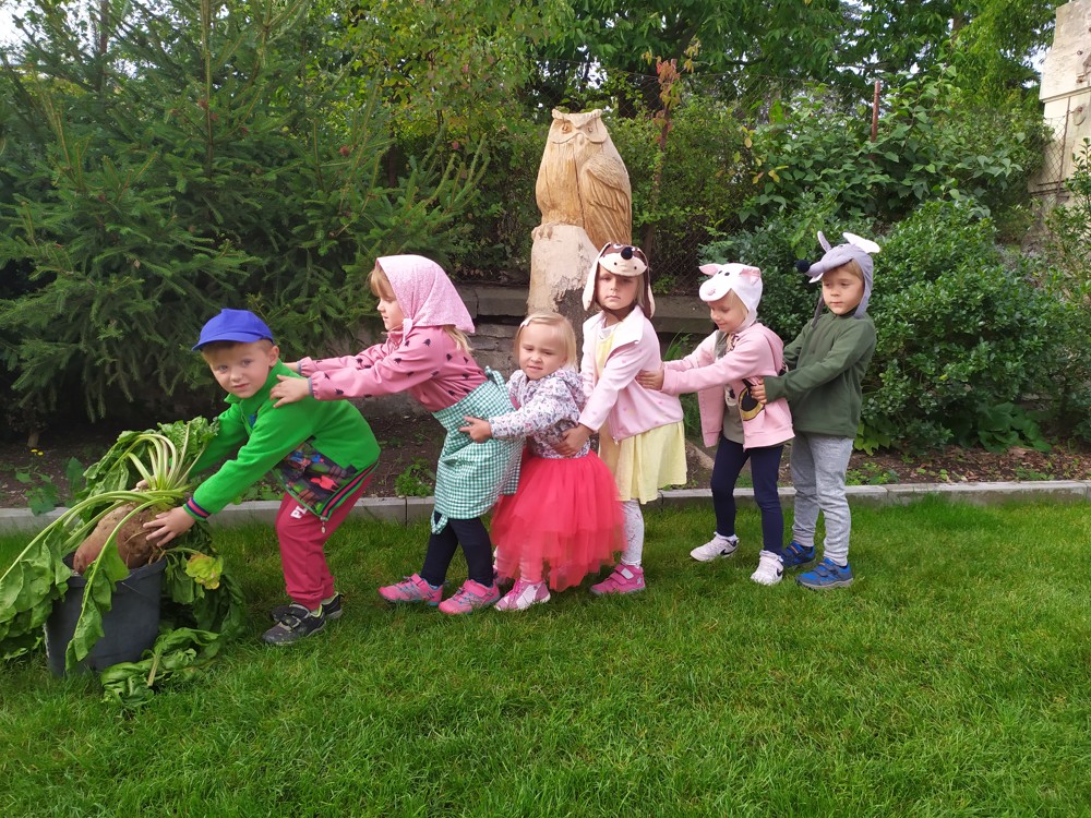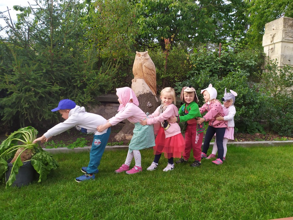 Na zahrádce si děti zahrály v pohádce " O veliké řepě" a líbilo se jim to o to více, že řepa , kterou dědeček nemohl sám vytáhnout, vyrostla na statku, kde jsme byli v srpnu na výletě a děti ji tam mohly vidět růst.