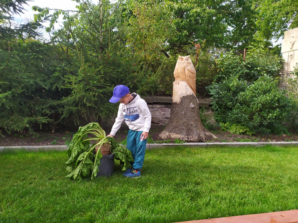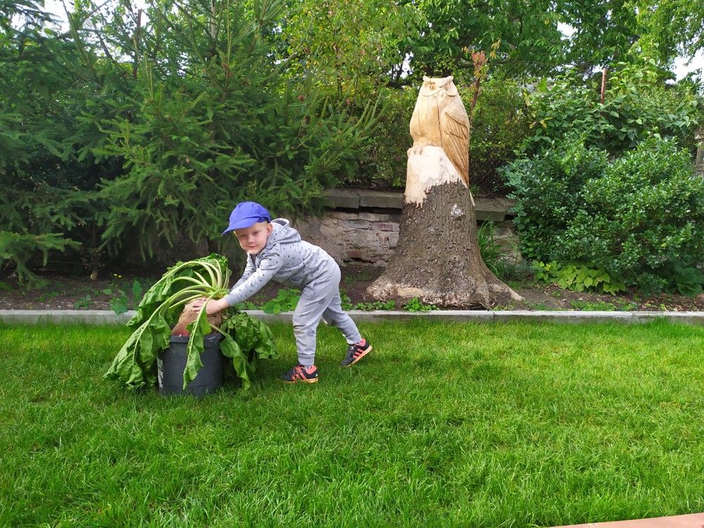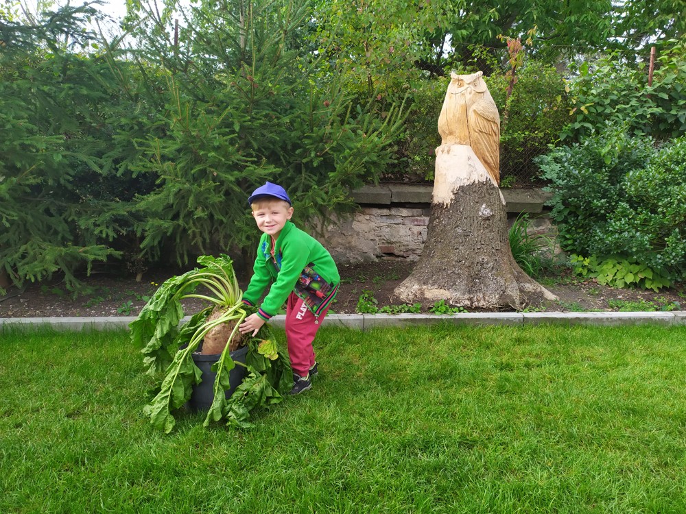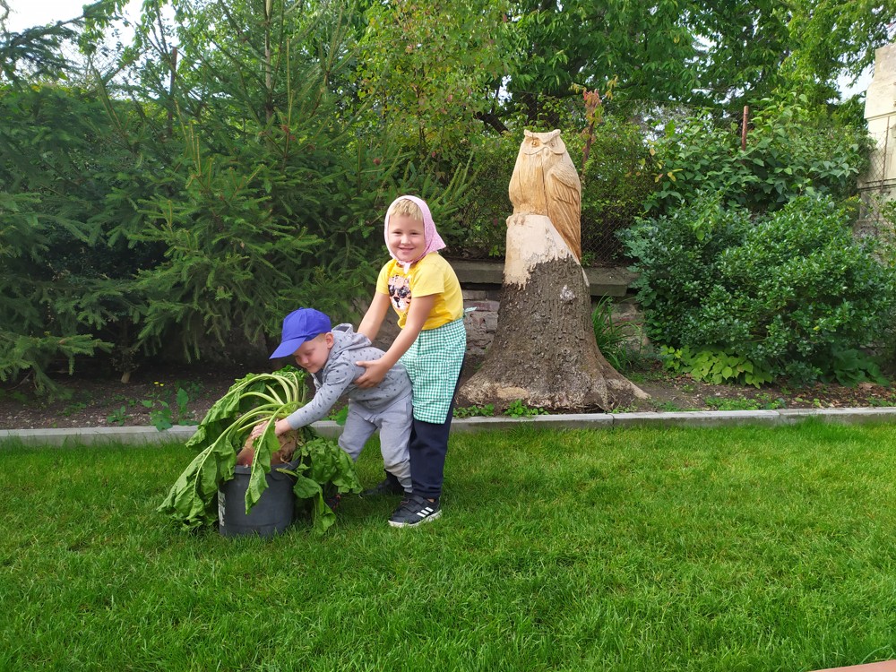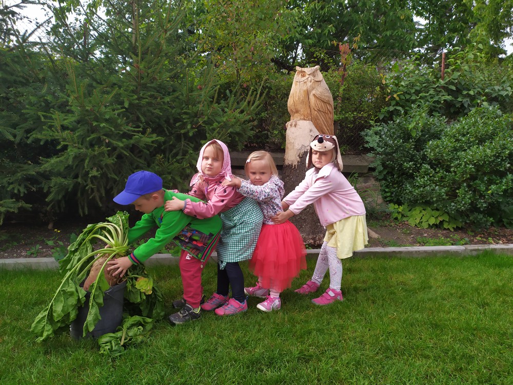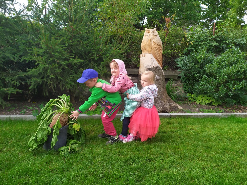Na zahrádce si děti zahrály v pohádce " O veliké řepě" a líbilo se jim to o to více, že řepa , kterou dědeček nemohl sám vytáhnout, vyrostla na statku, kde jsme byli v srpnu na výletě a děti ji tam mohly vidět růst.