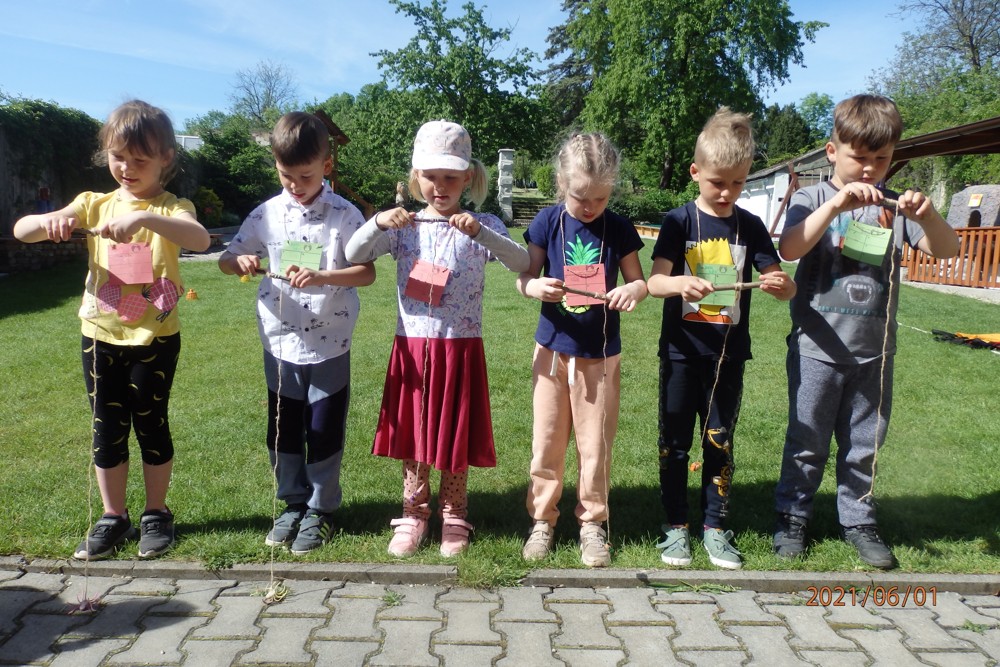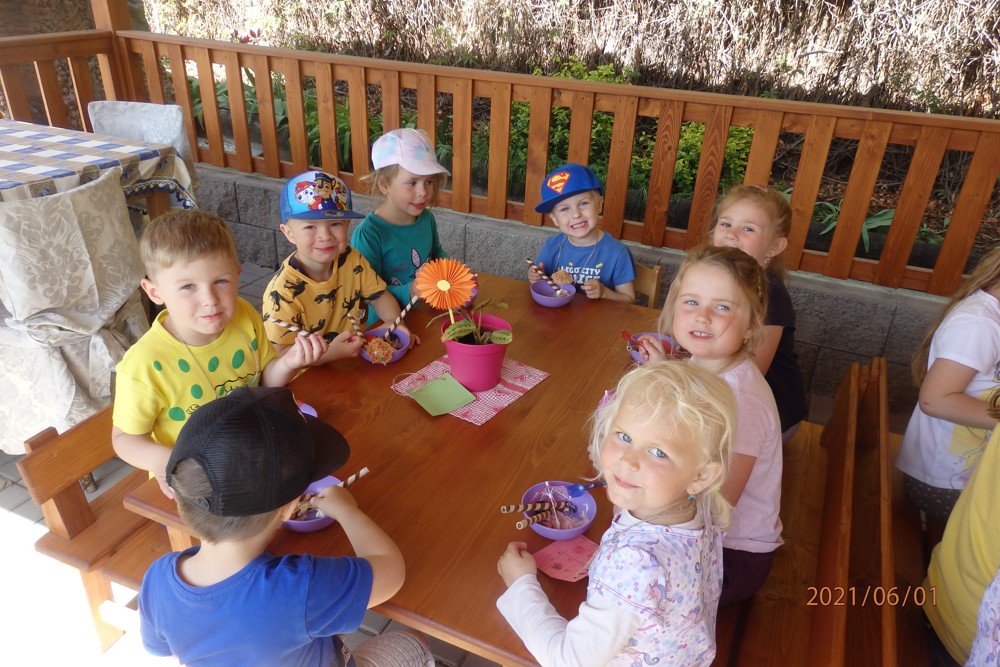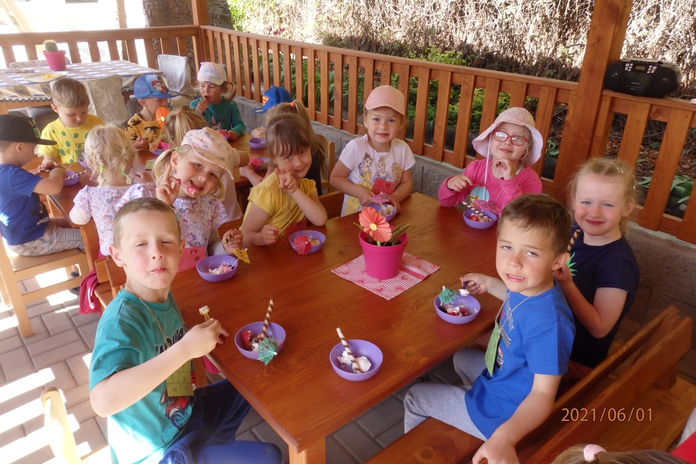 Proto si děti užily svůj svátek pohádkově. Nejprve plnily úkoly víly Květušky a zatančily vílí tanec na kouzelném paloučku, sportovaly a nakonec je čekal nejsladší úkol. Každý si připravil svůj zmrzlinový pohár dle své chuti. Děti si mohly vybrat borůvky, maliny ostružiny, jahody, také sladkou trubičku a na ozdobu přidaly malý deštníček. Pohádkové dopoledne jsme ukončili výborným obídkem na naší královské pergole.