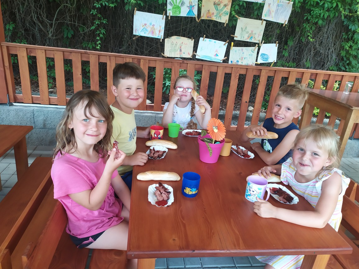 Po ukončení odpolední akce zůstávají školáci na zahrádce, aby si svůj den užili až do konce.