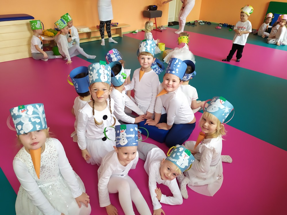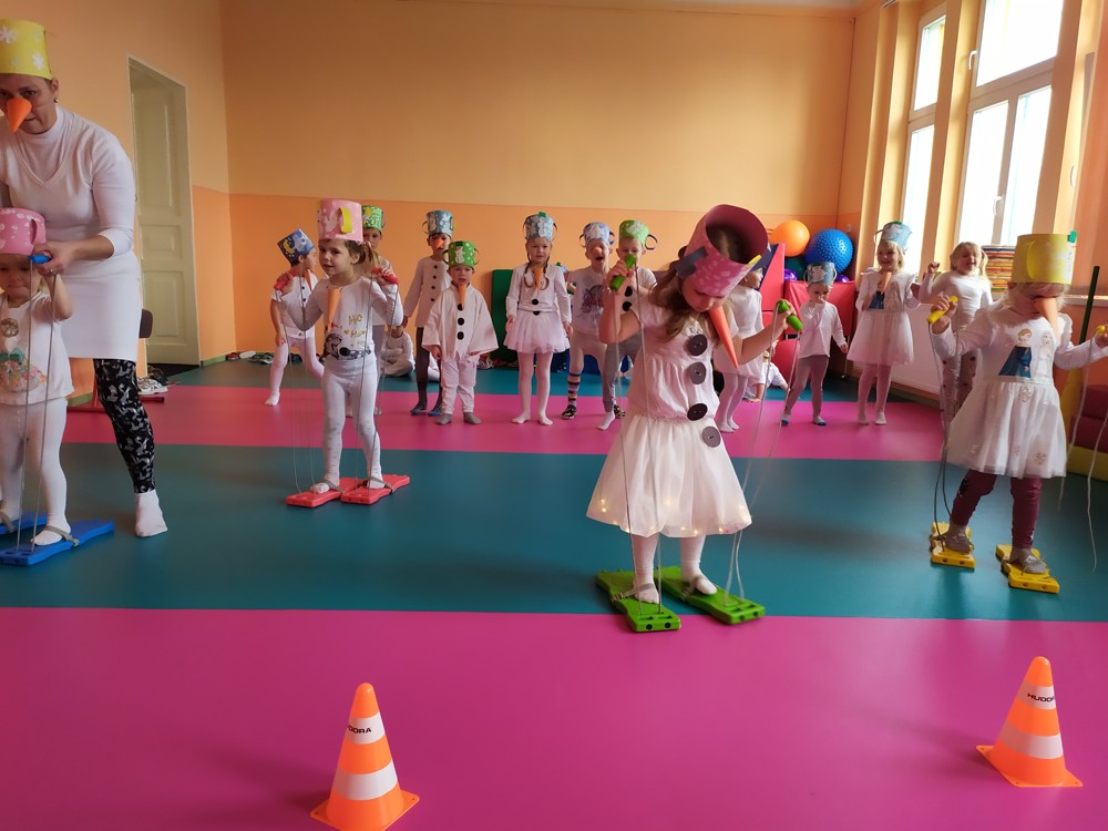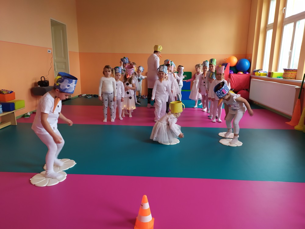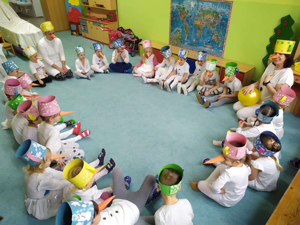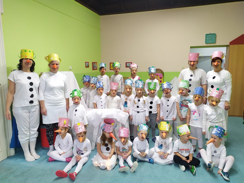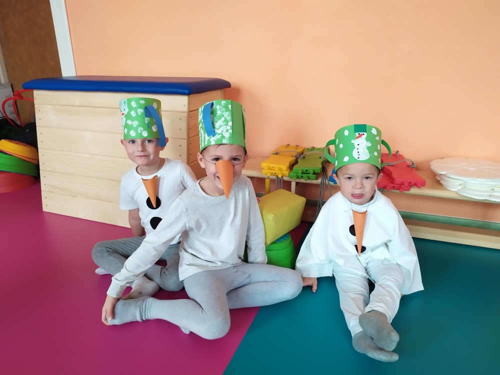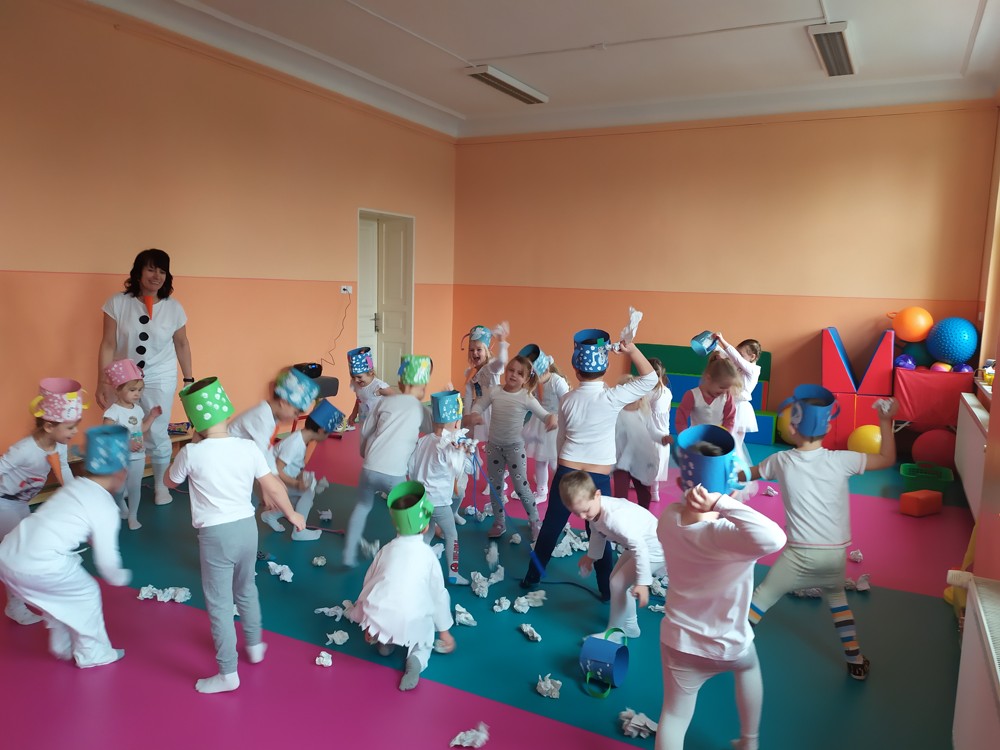 Děti se dnes proměnily ve sněhuláčky a celé dopoledne si moc užívaly. Tančily, zpívaly, soutěžily a mlsaly sněhové vločky.