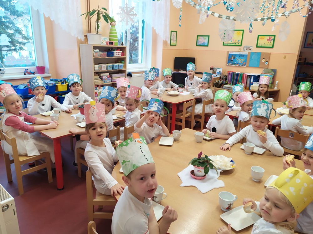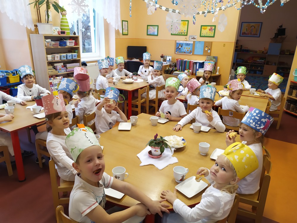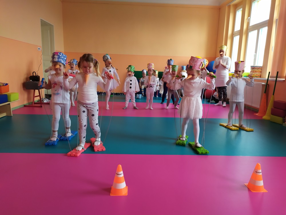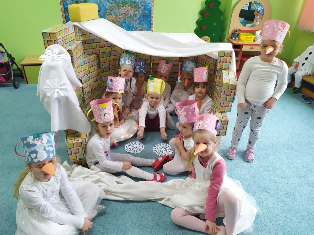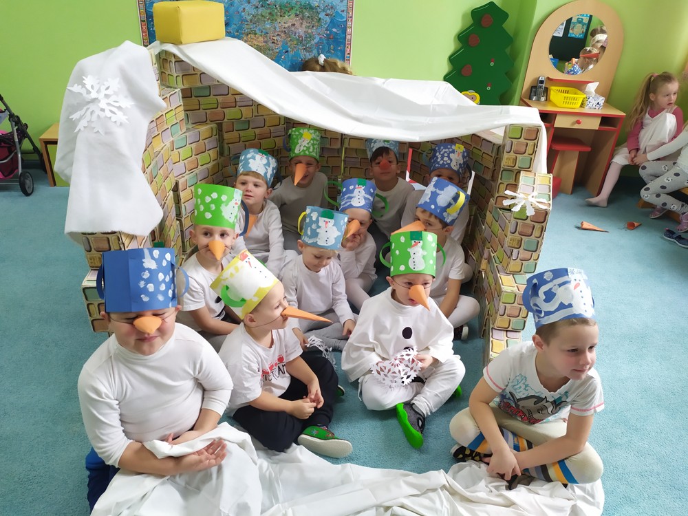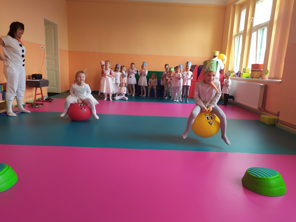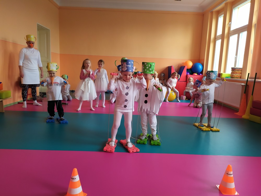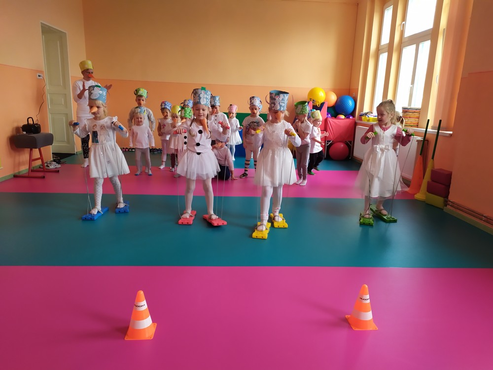 Děti se dnes proměnily ve sněhuláčky a celé dopoledne si moc užívaly. Tančily, zpívaly, soutěžily a mlsaly sněhové vločky.