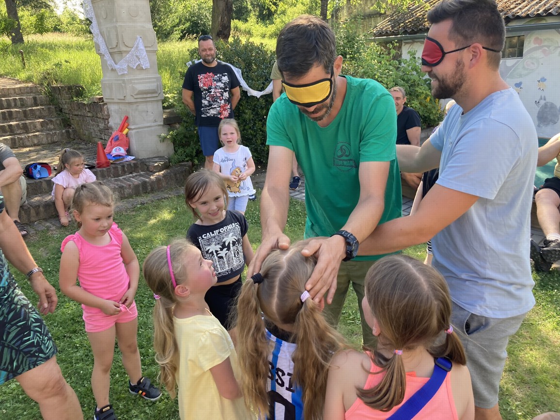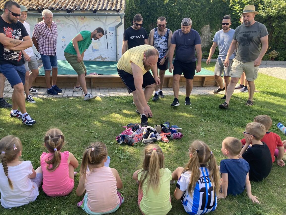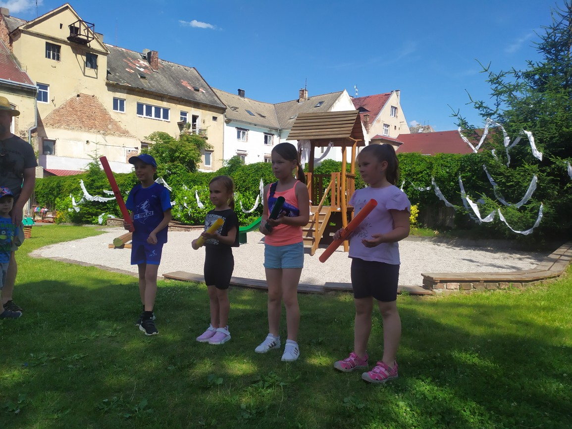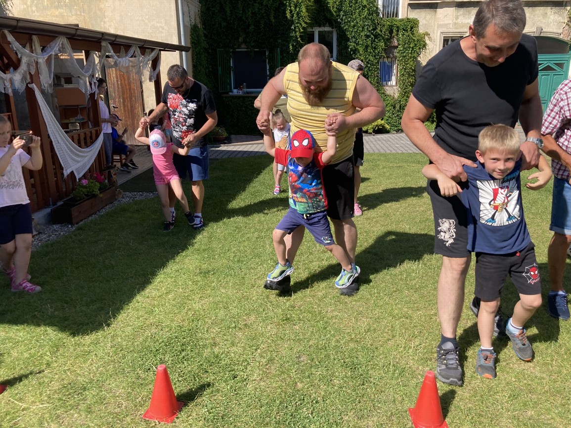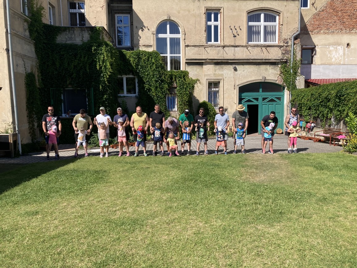 Na školní zahradě bylo dnes opravdu veselo. Při oslavě svého svátku si naši tatínkové vyzkoušeli disciplíny: „Najdi své dítě, obuj ho a nakrm.“ Také předvedli při hře na barevné trubky své hudební dovednosti a vynikali i ve sportu.