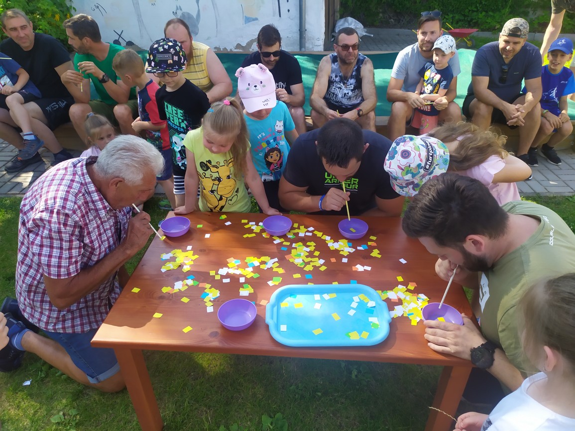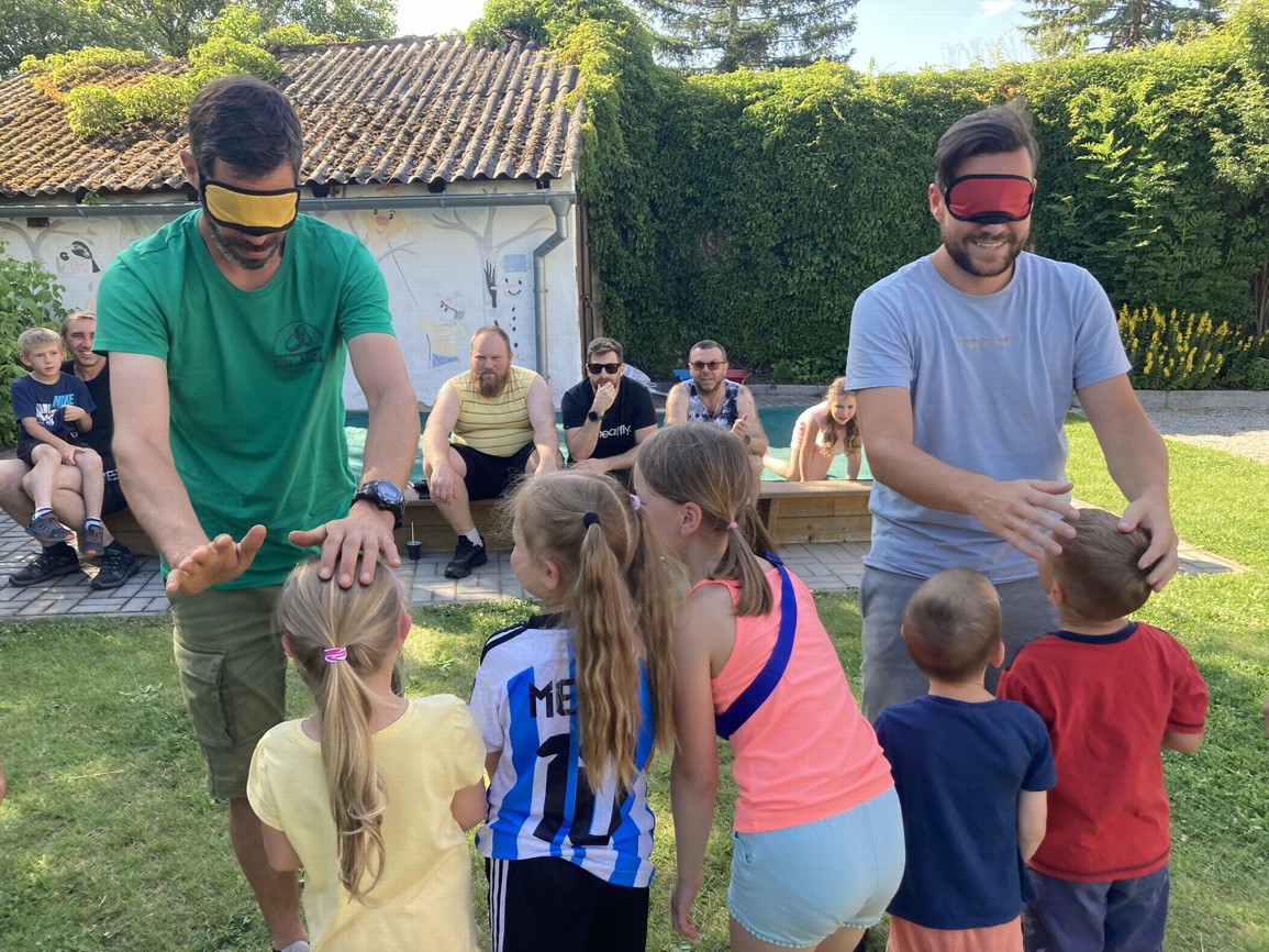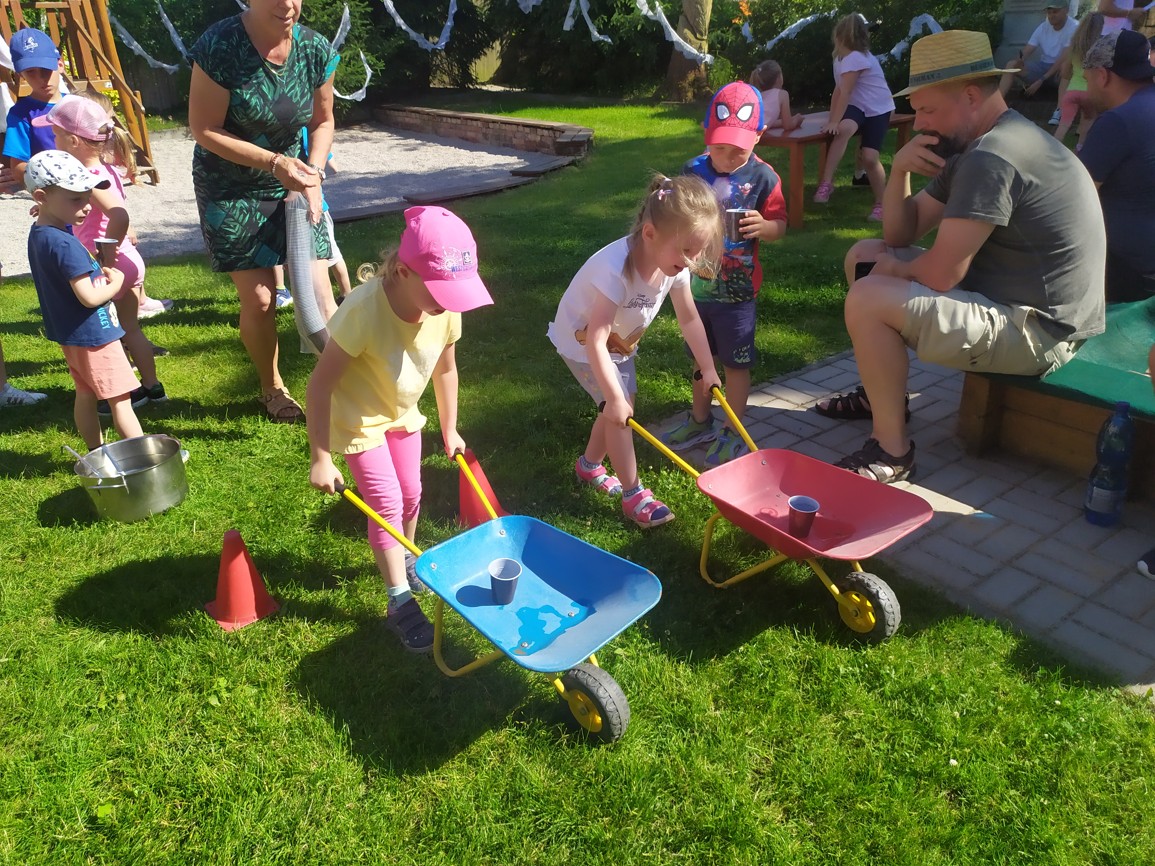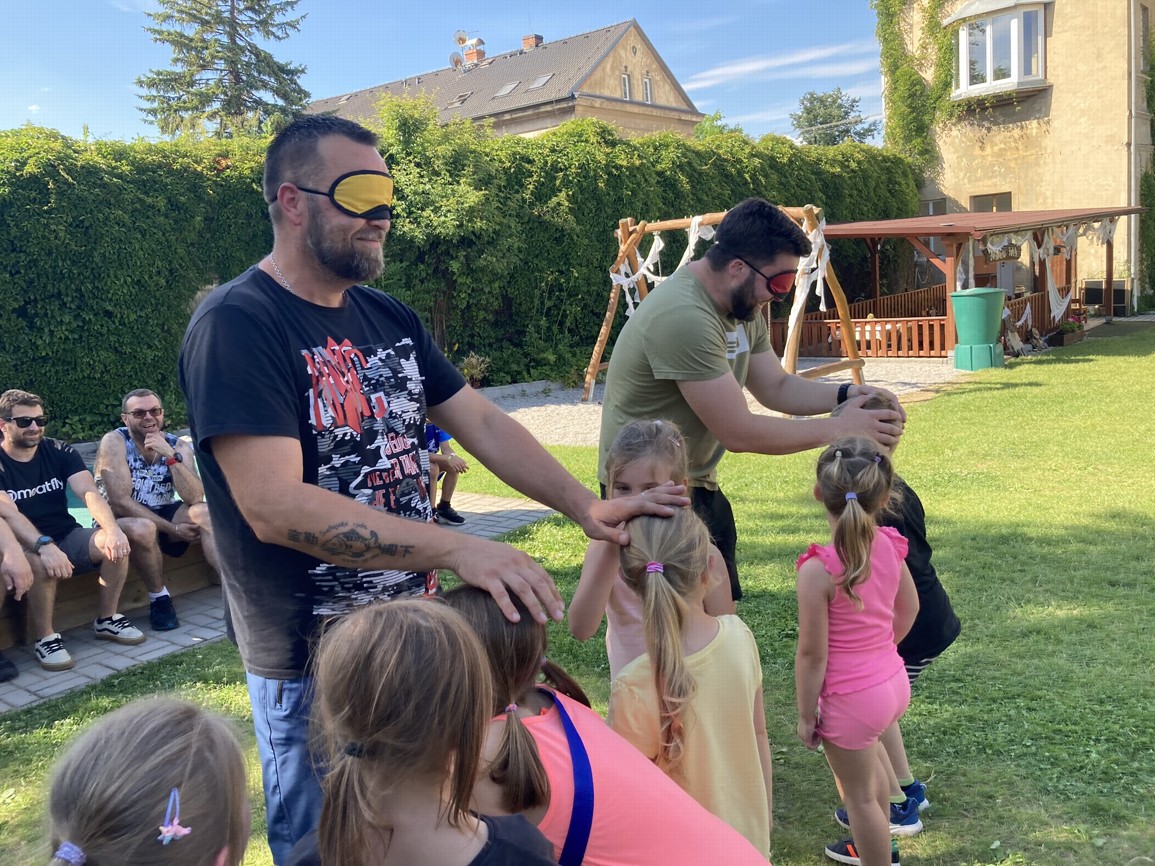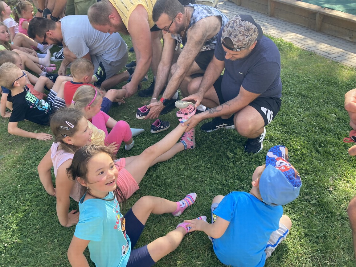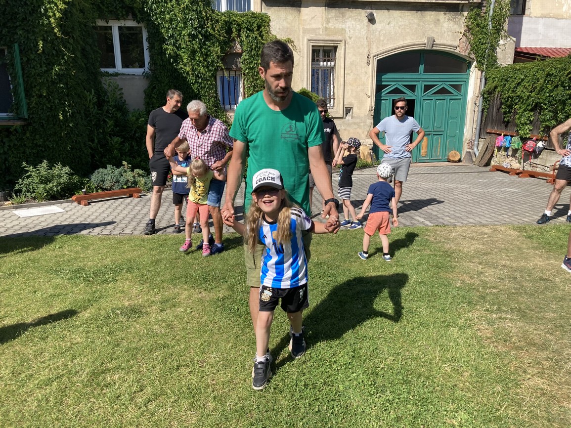 Na školní zahradě bylo dnes opravdu veselo. Při oslavě svého svátku si naši tatínkové vyzkoušeli disciplíny: „Najdi své dítě, obuj ho a nakrm.“ Také předvedli při hře na barevné trubky své hudební dovednosti a vynikali i ve sportu.