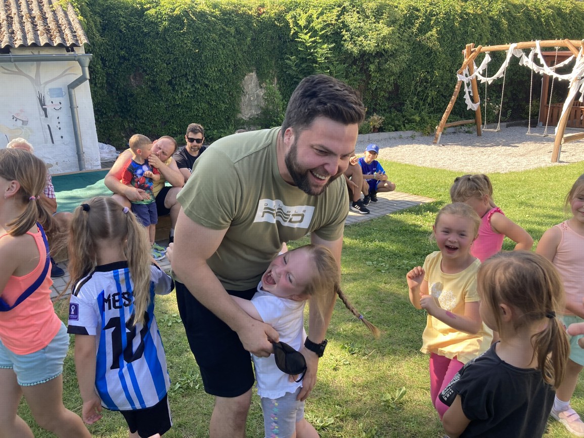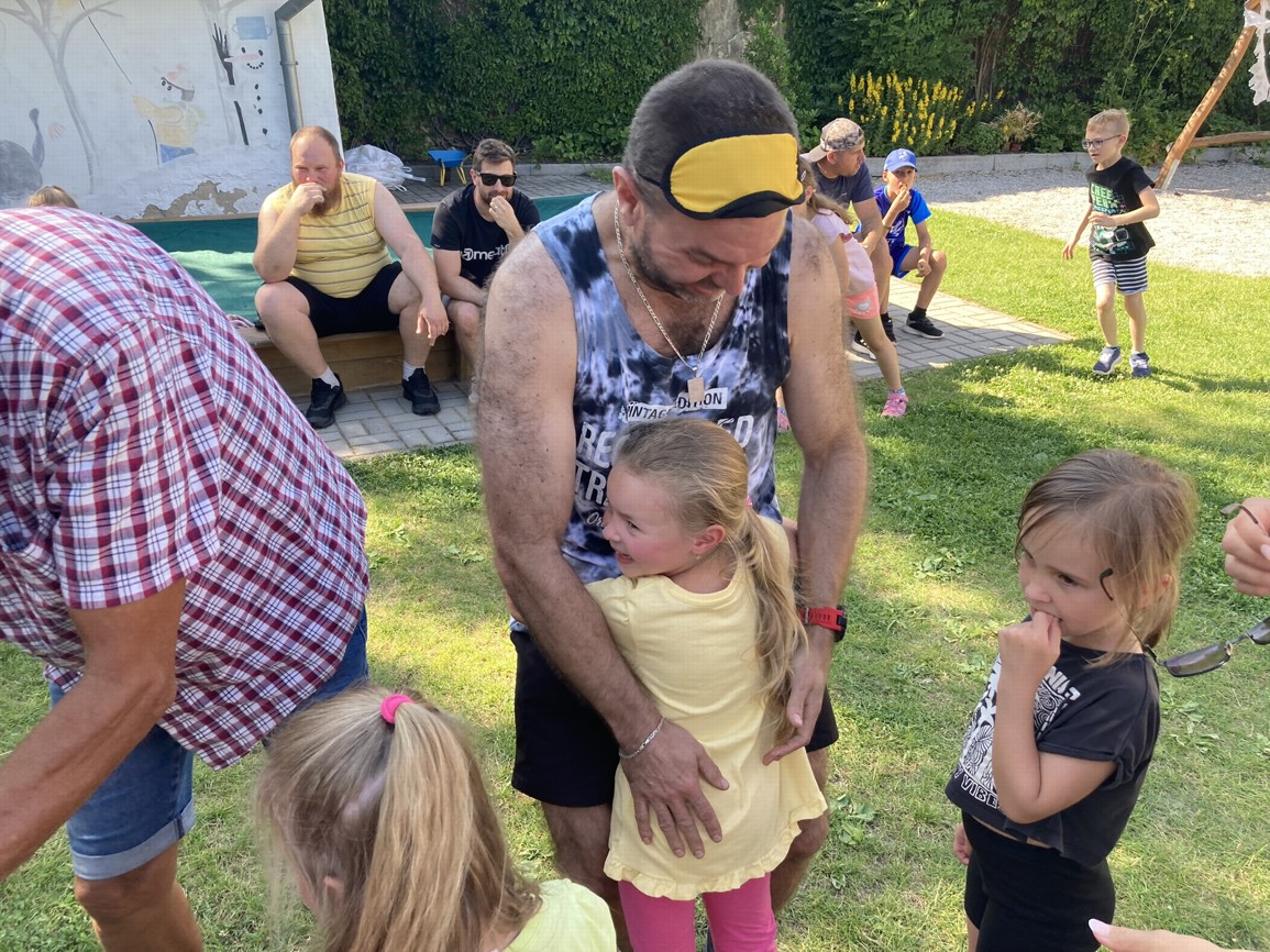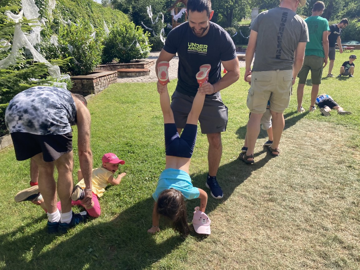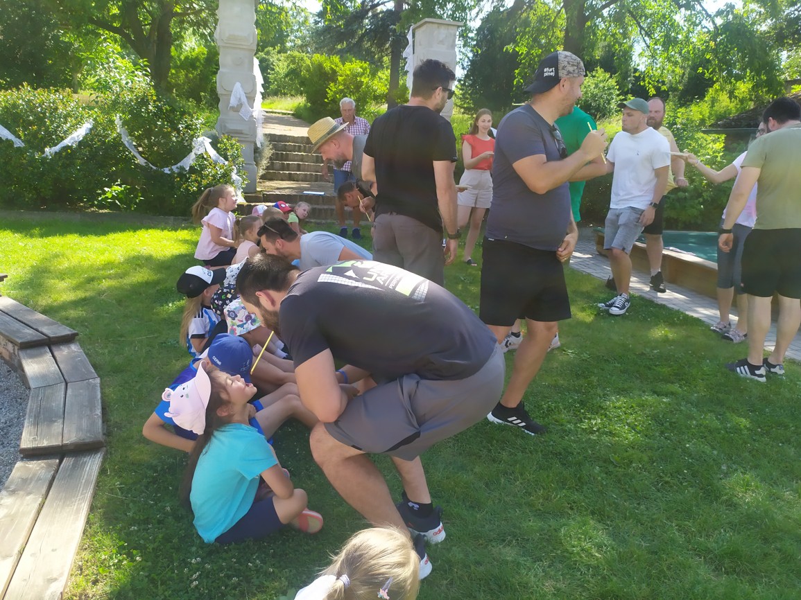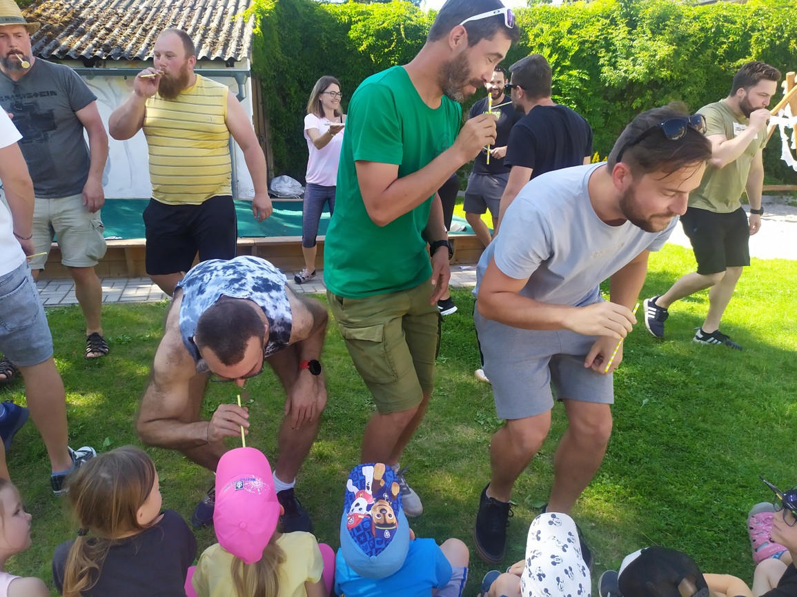 Na školní zahradě bylo dnes opravdu veselo. Při oslavě svého svátku si naši tatínkové vyzkoušeli disciplíny: „Najdi své dítě, obuj ho a nakrm.“ Také předvedli při hře na barevné trubky své hudební dovednosti a vynikali i ve sportu.