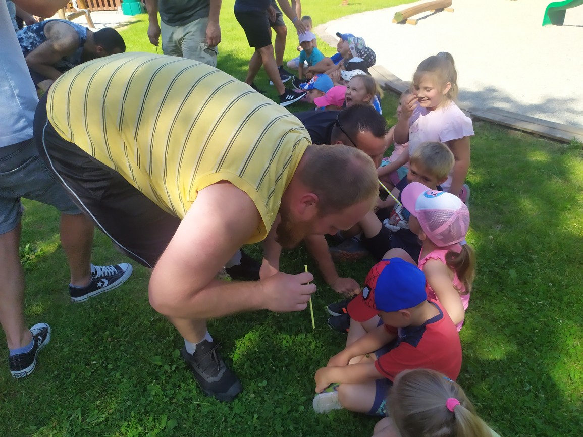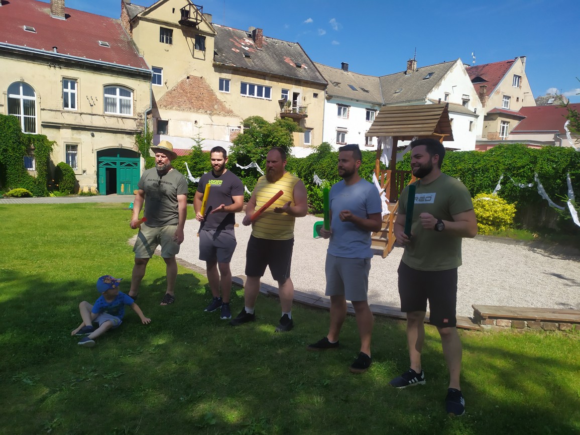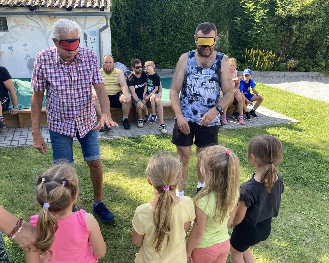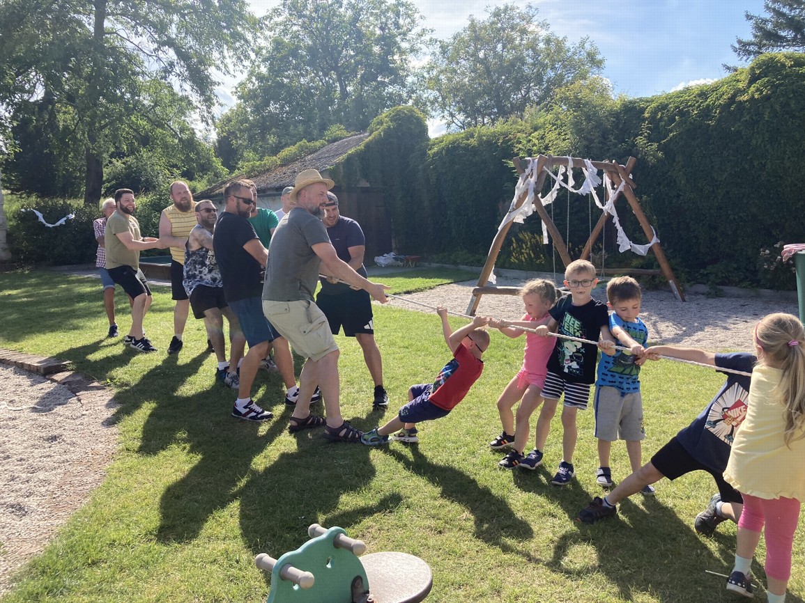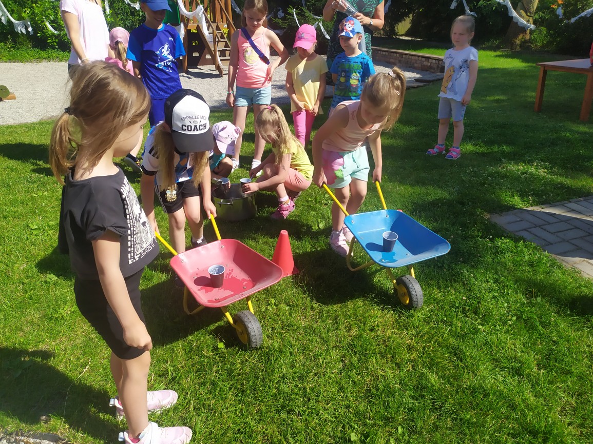 Na školní zahradě bylo dnes opravdu veselo. Při oslavě svého svátku si naši tatínkové vyzkoušeli disciplíny: „Najdi své dítě, obuj ho a nakrm.“ Také předvedli při hře na barevné trubky své hudební dovednosti a vynikali i ve sportu.