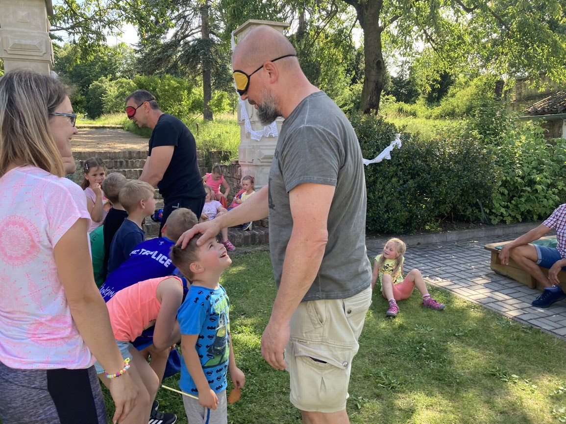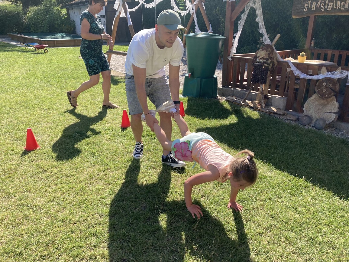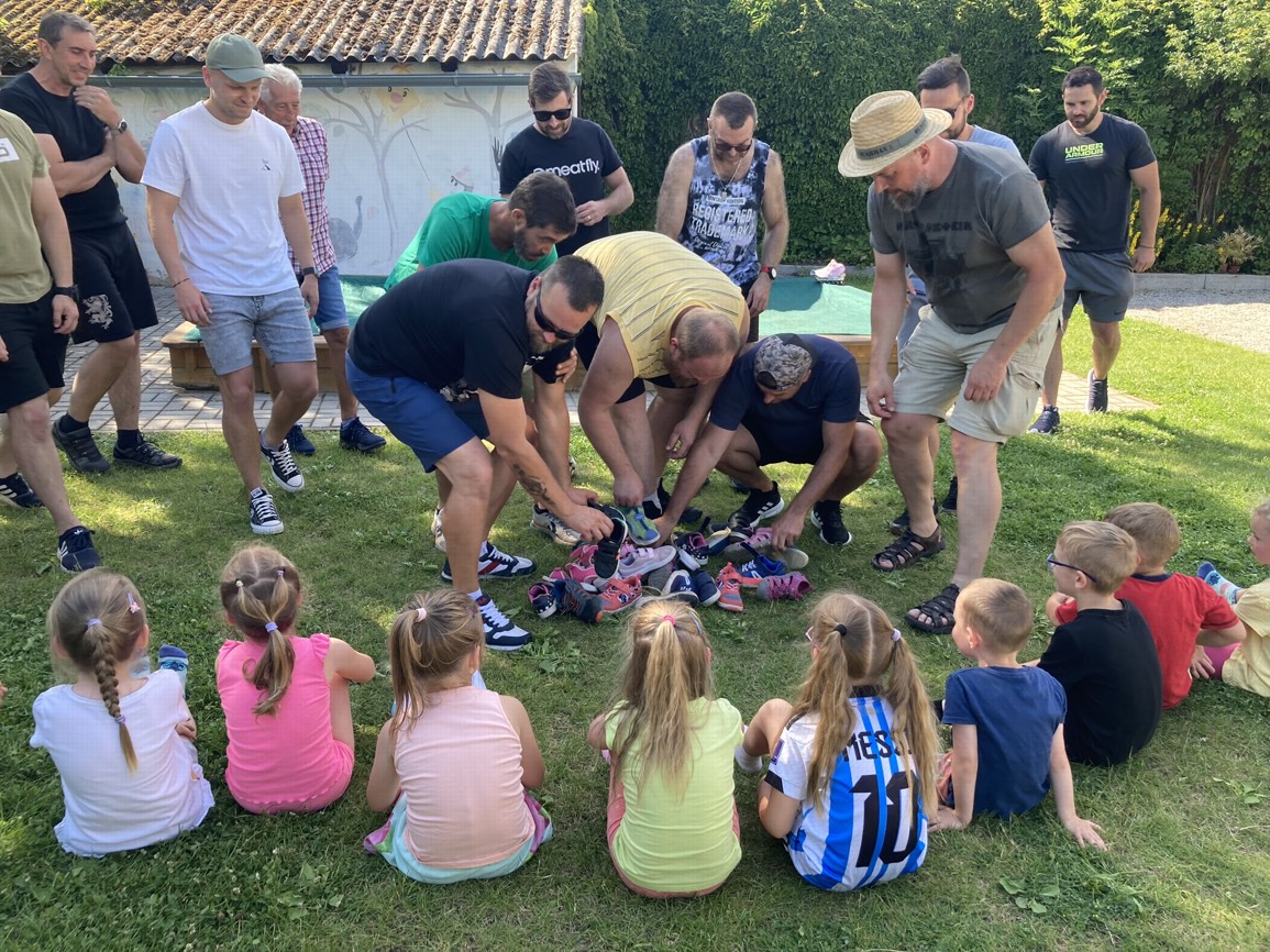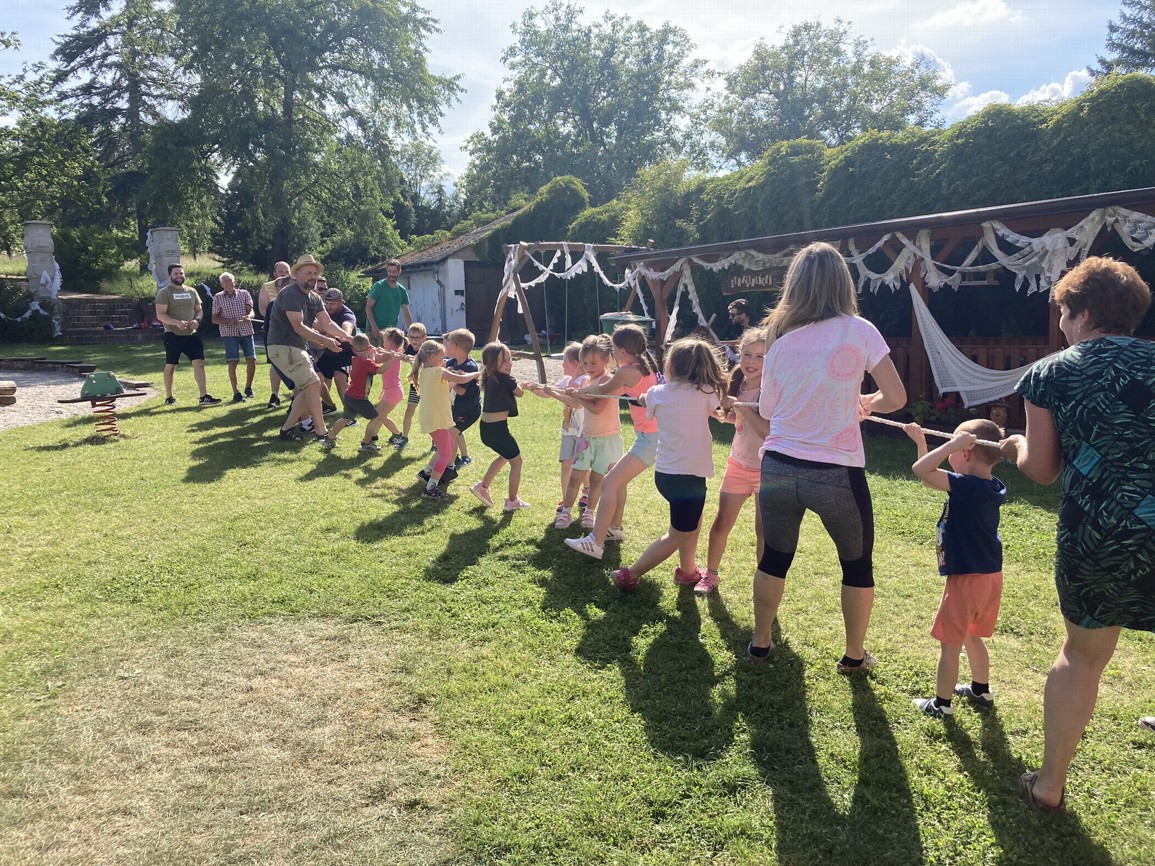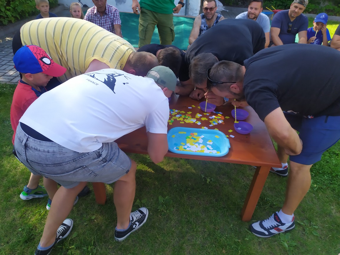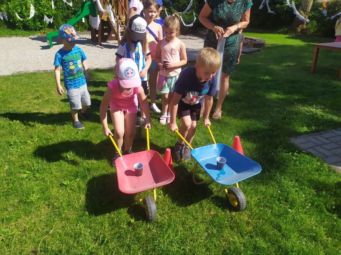 Na školní zahradě bylo dnes opravdu veselo. Při oslavě svého svátku si naši tatínkové vyzkoušeli disciplíny: „Najdi své dítě, obuj ho a nakrm.“ Také předvedli při hře na barevné trubky své hudební dovednosti a vynikali i ve sportu.