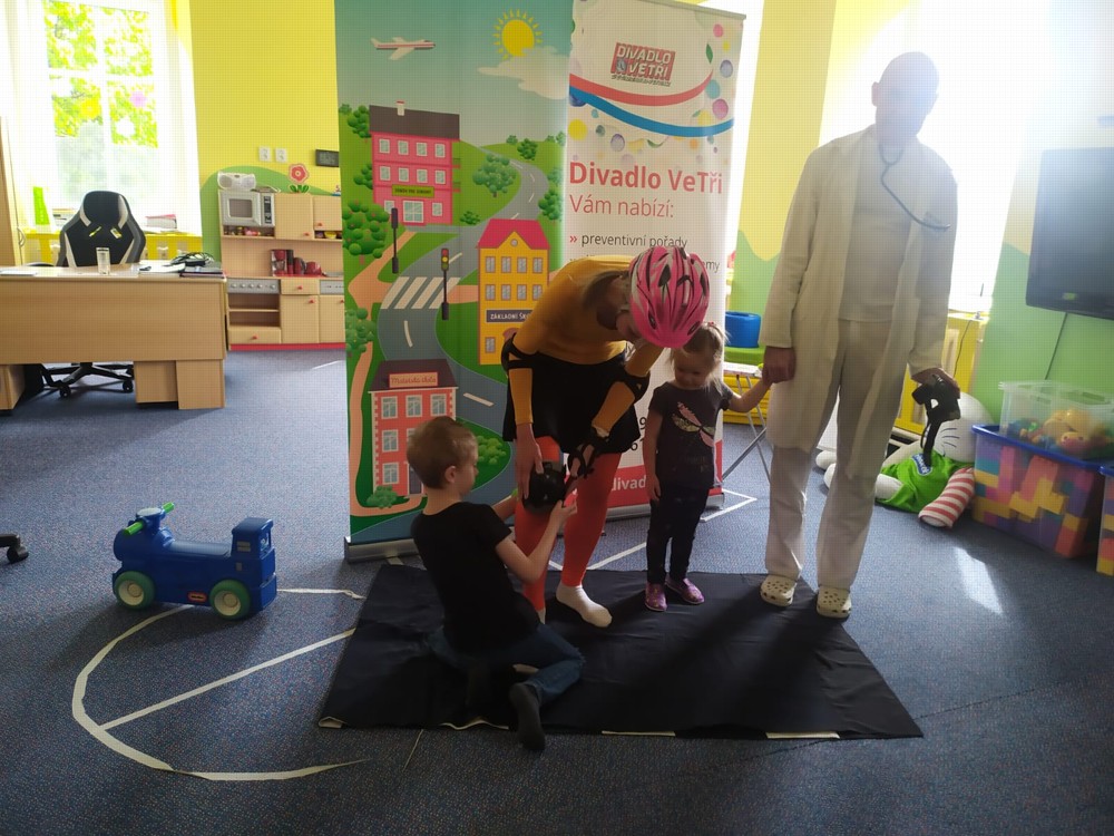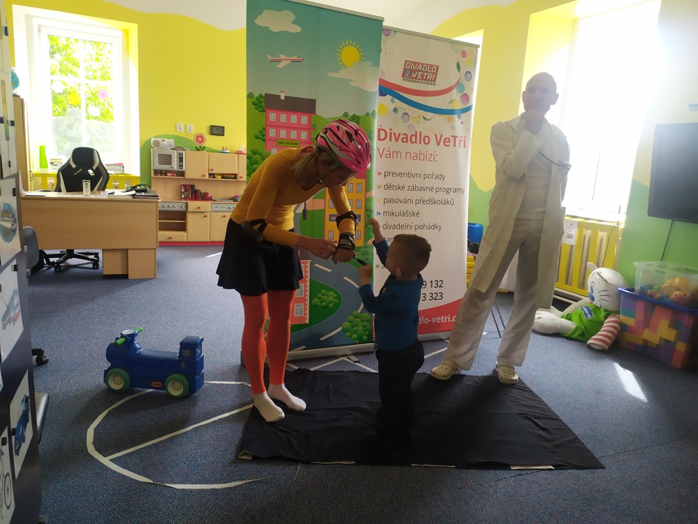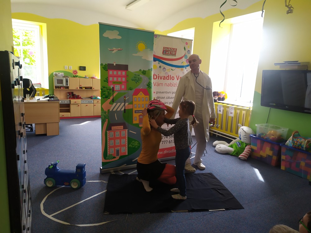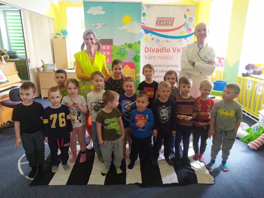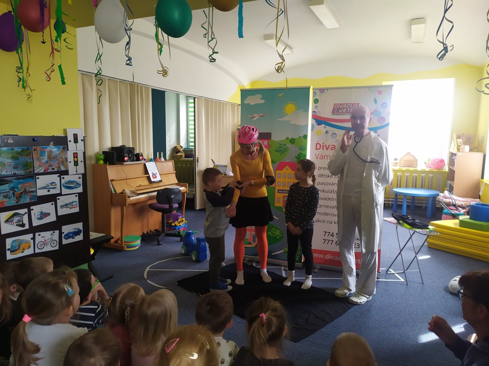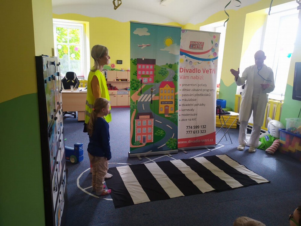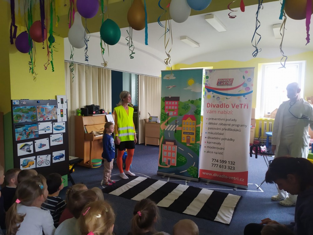 Dnes jsme navštívili kamarády z jeníkovské školky a společně se zúčastnili preventivního pořadu, ve kterém se děti zábavnou a nenásilnou formou dozvěděly, jak předcházet úrazům, nástrahám každodenního života, učily se základům silničního provozu, slušnému chování a udržování pořádku ve svém okolí.