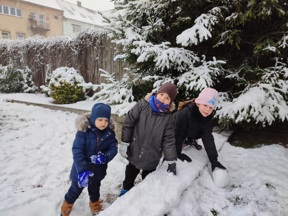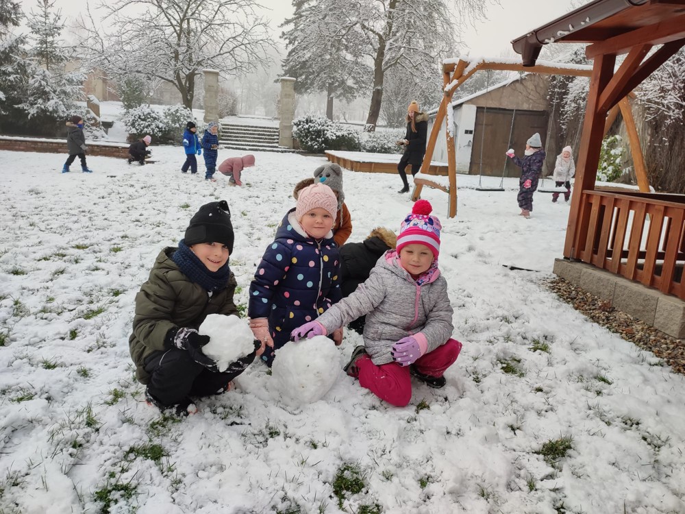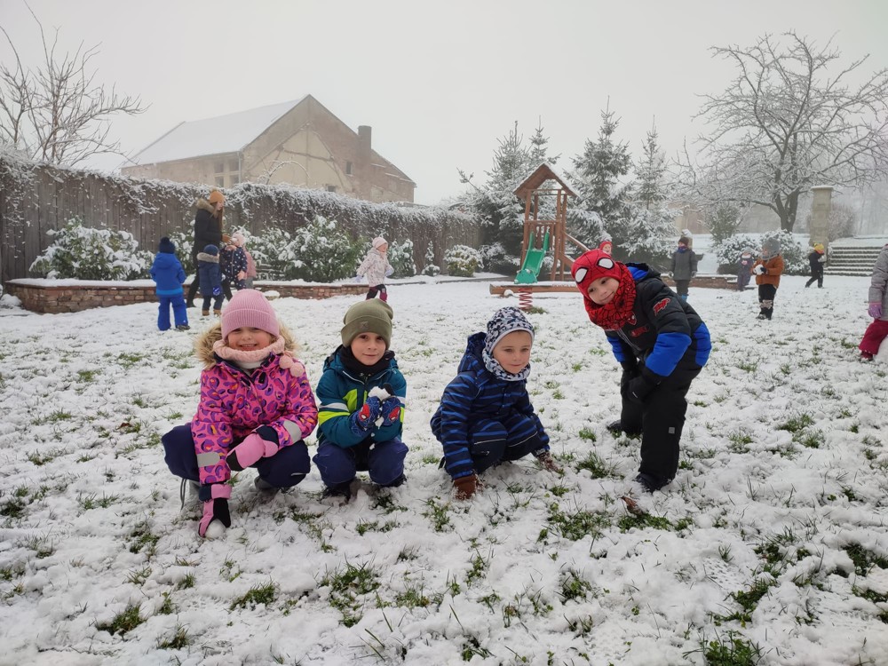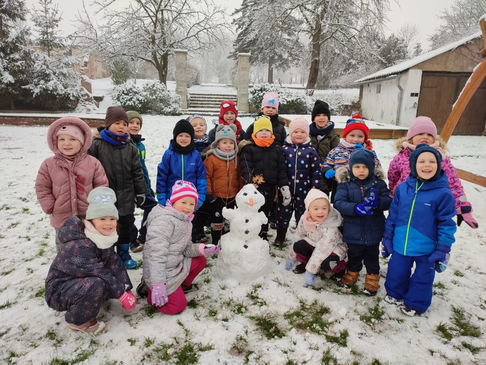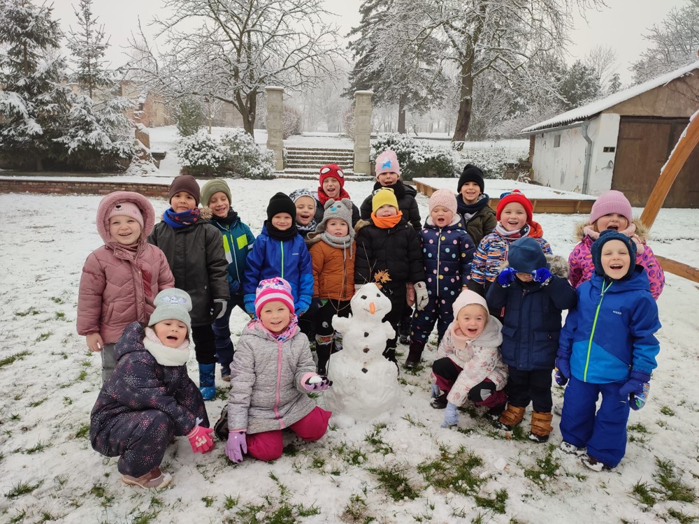 Konečně napadl první sníh, tak jsme vyrazili na školní zahradu. Dováděli jsme na sněhu a také postavili prvního letošního sněhuláka.
