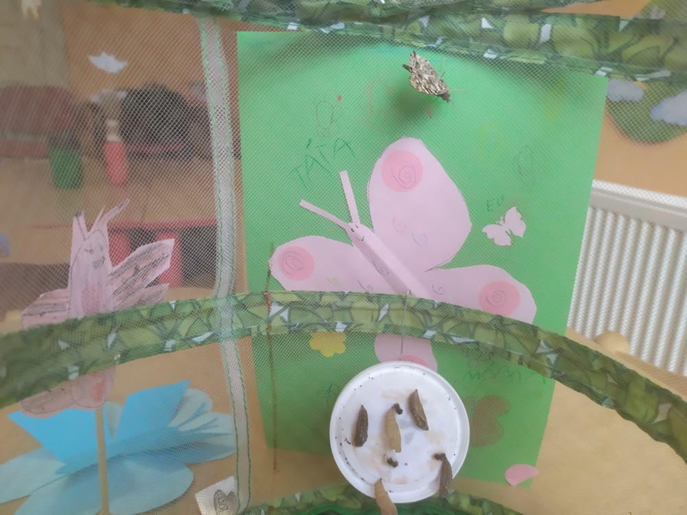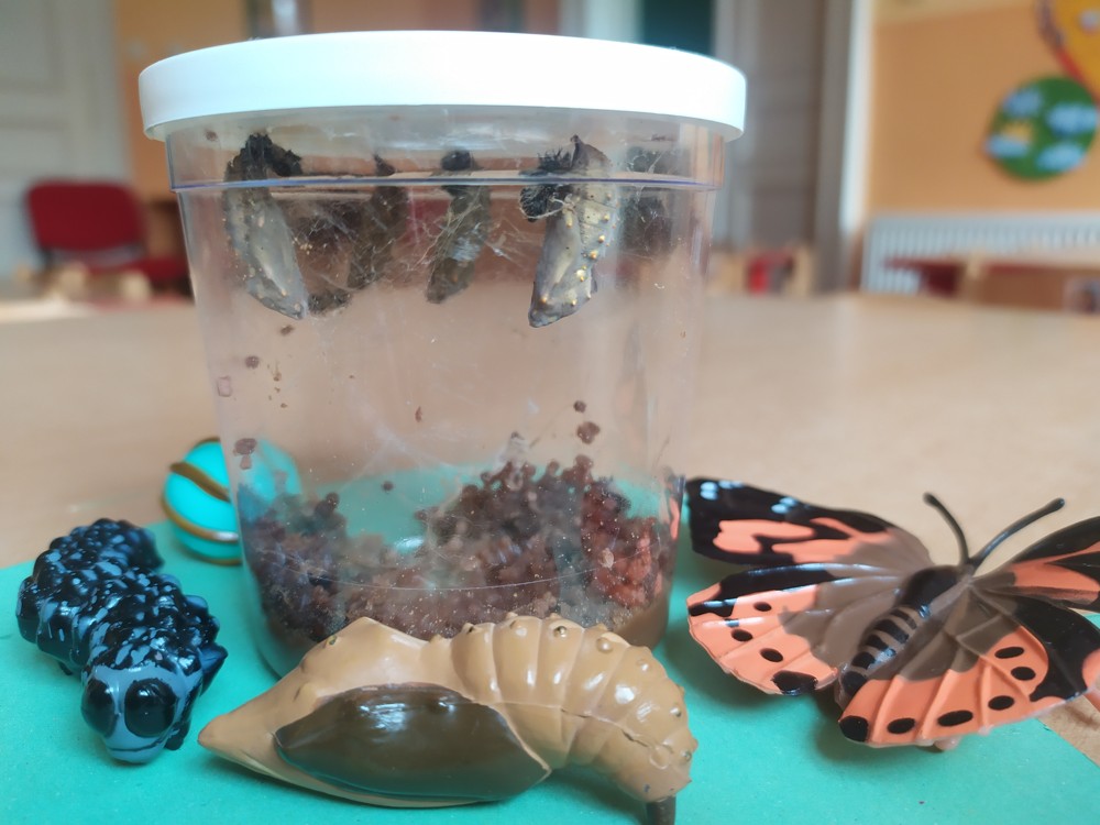 Téměř tři týdny mohly děti pozorovat úžasnou proměnu malé housenky, přes kuklu až po vylíhnutí v motýla Babočky Bodlákové. Prvnímu vylíhnutému motýlkovi děti vyrobily kamarády z papíru, aby mu nebylo smutno a společně jsme čekali na další motýlky.