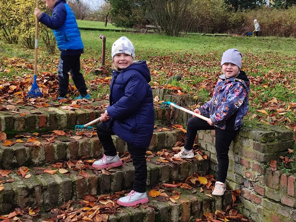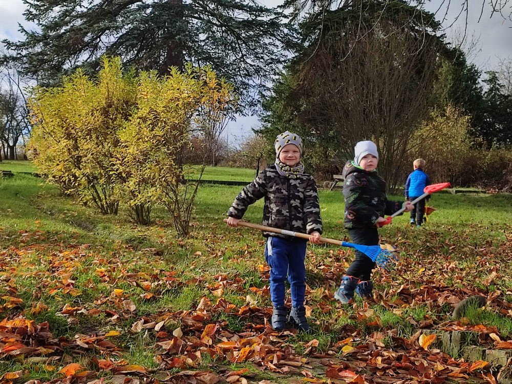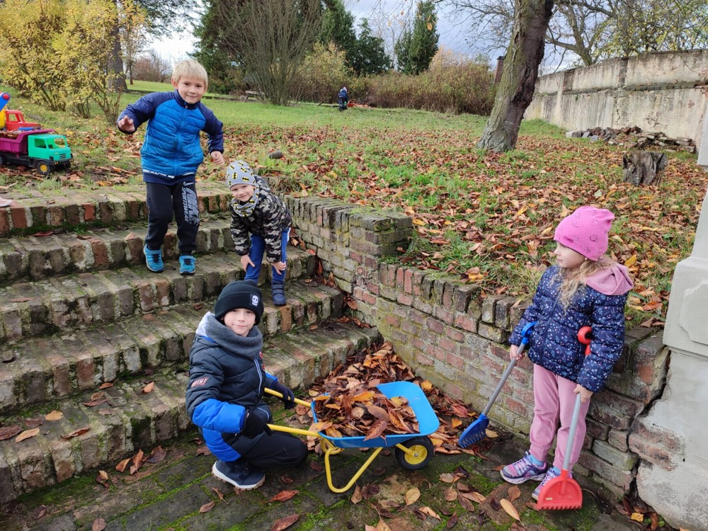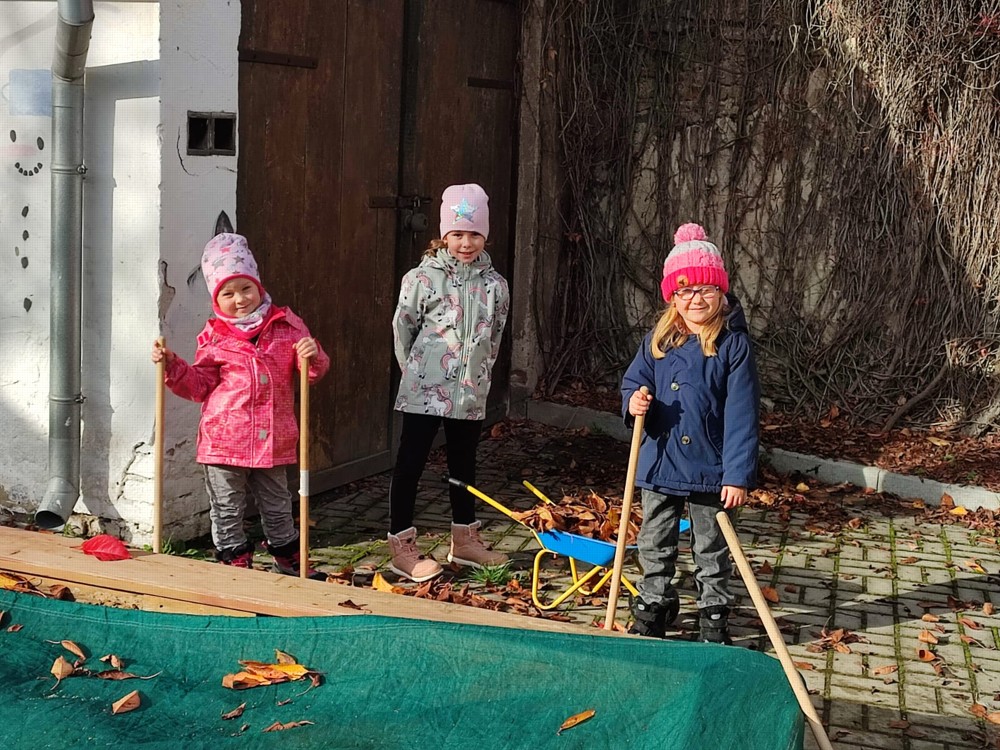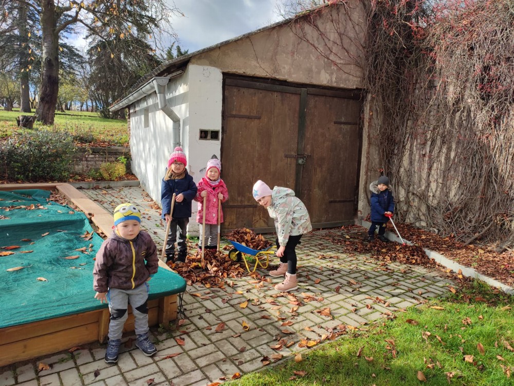 Počasí nám dnes přálo, proto se děti vydaly na zahrádku, aby hrabaly spadané listí a připravily ježčí domečky. Práce je moc bavila a už se těší na zítra, že budou pokračovat.